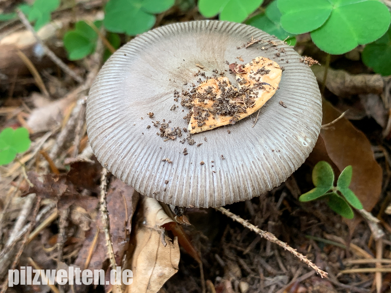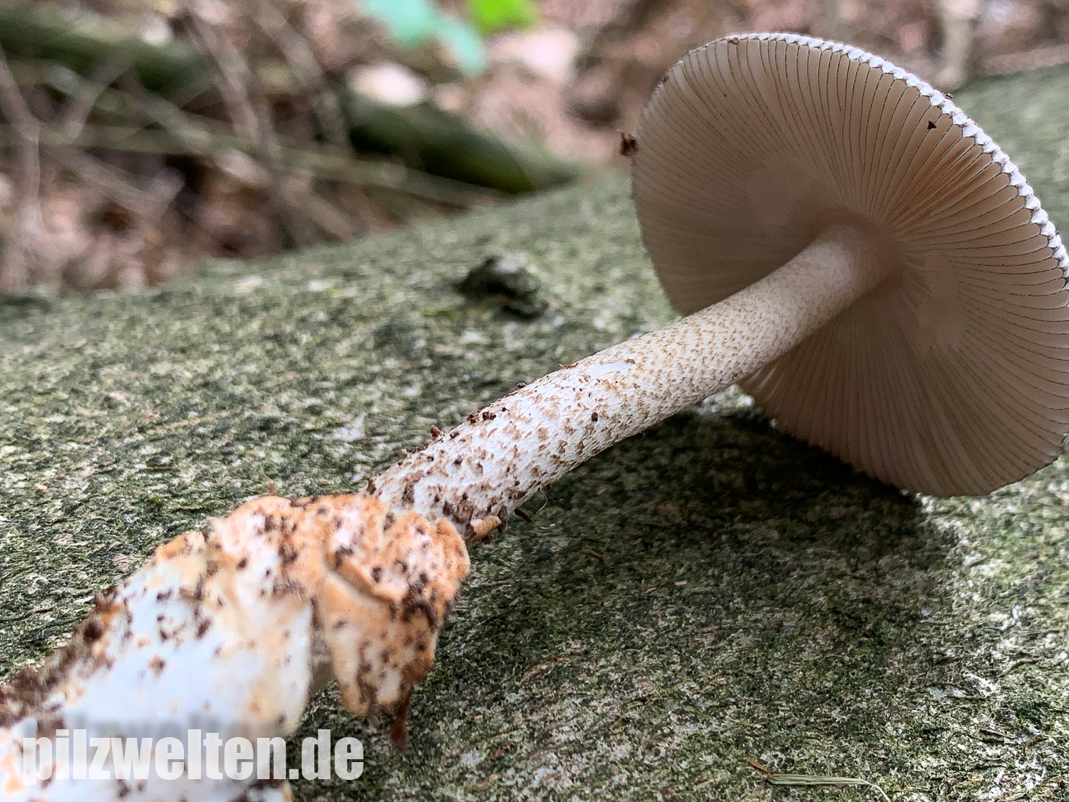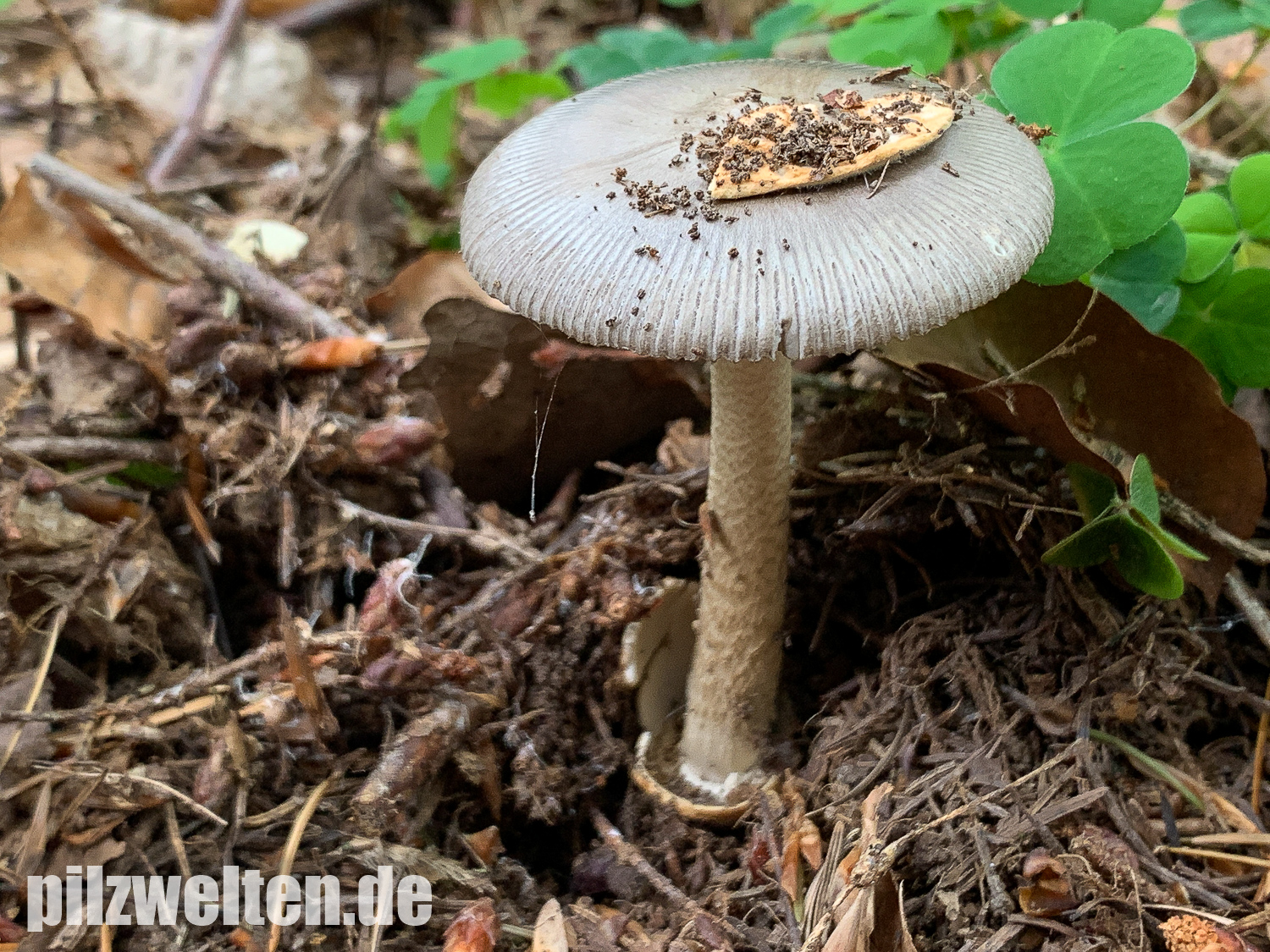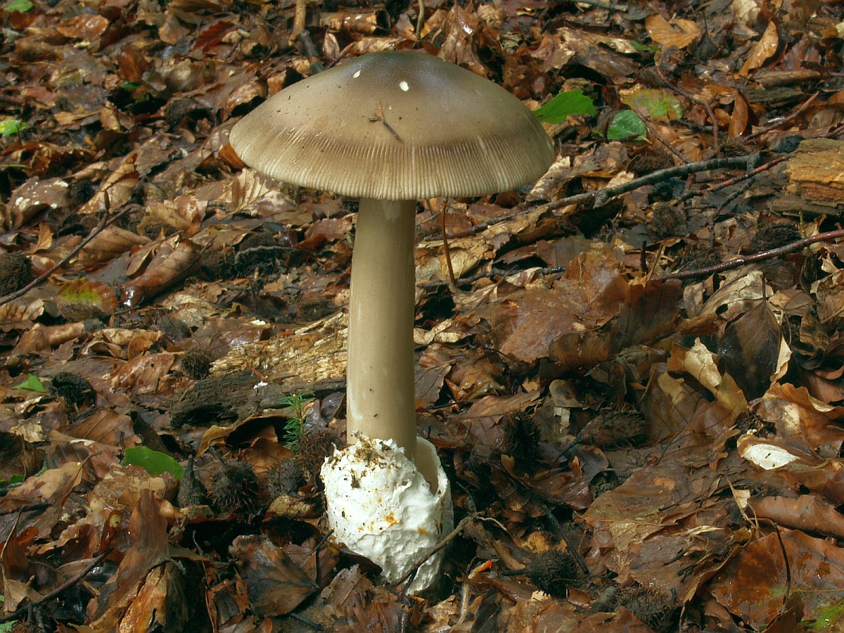 beim folgenden Scheidenstreifling sind wir etwas unsicher in der Einordnung. Für A. battarrae ist uns der Hut viel zu gleichmäßig gefärbt, aber für komplett graue Arten ist uns der Stiel viel zu extrem genattert. Anbei zunächst ein Vergleichsbild, wie wir A. battarrae kennen (links) im Vergleich zum aktuellen Fund: