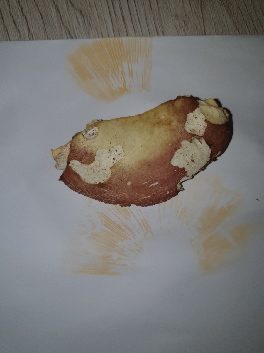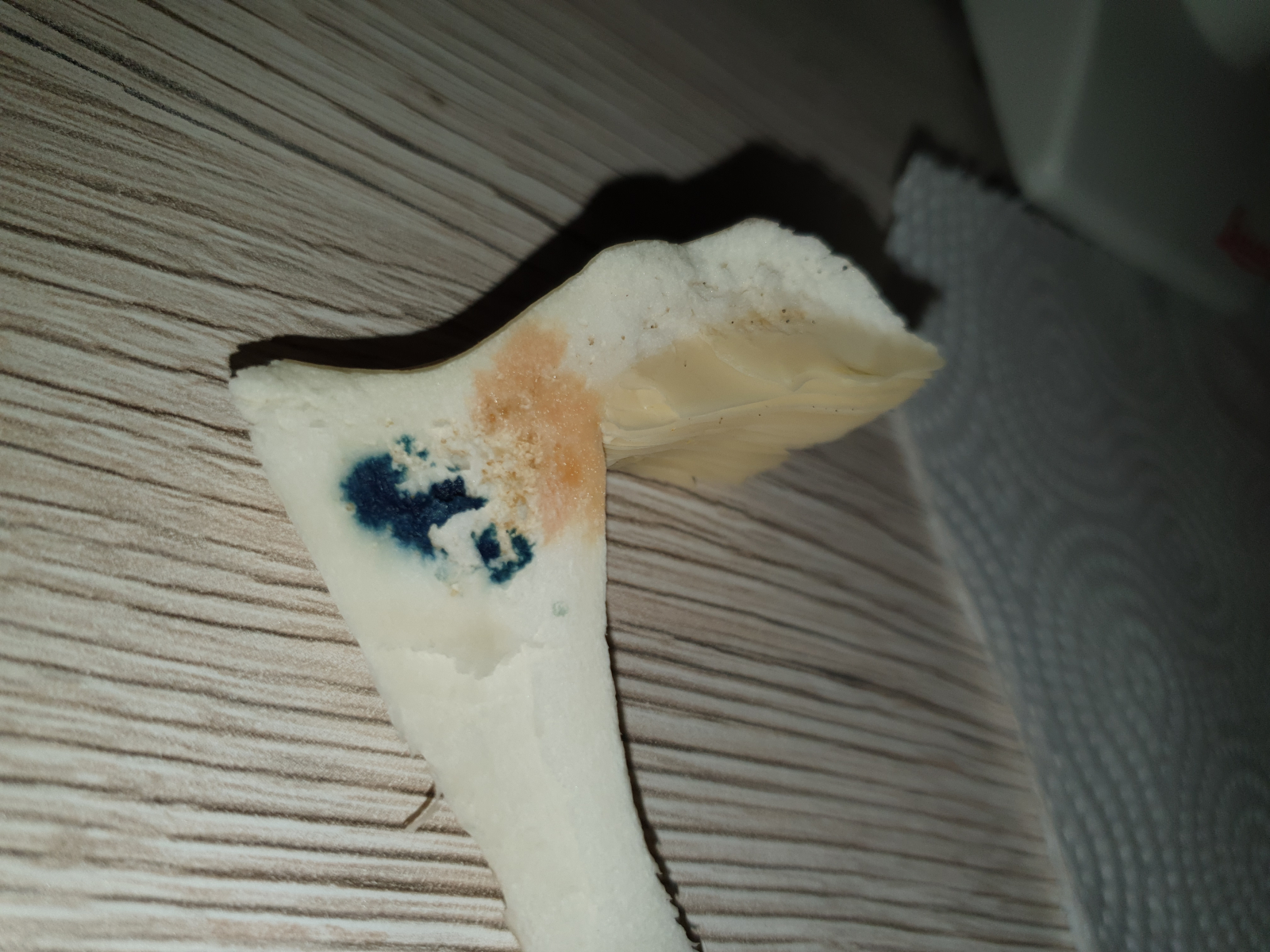 Große Art, Hut bis über 10cm (Foto), Farben wie Bild, mitte gelblich-bräunlich ausblassend, sonst schön rosa, bis zum Rand. Huthaut bis zur Hälfte etwa abziehbar. Lamellen ins gelbliche, gegabelt. Stiel reinweis, typische Reaktionen auf Gujak und Eisensulfat (rosa) ... siehe Bilder. Stiel reinweis, fest.