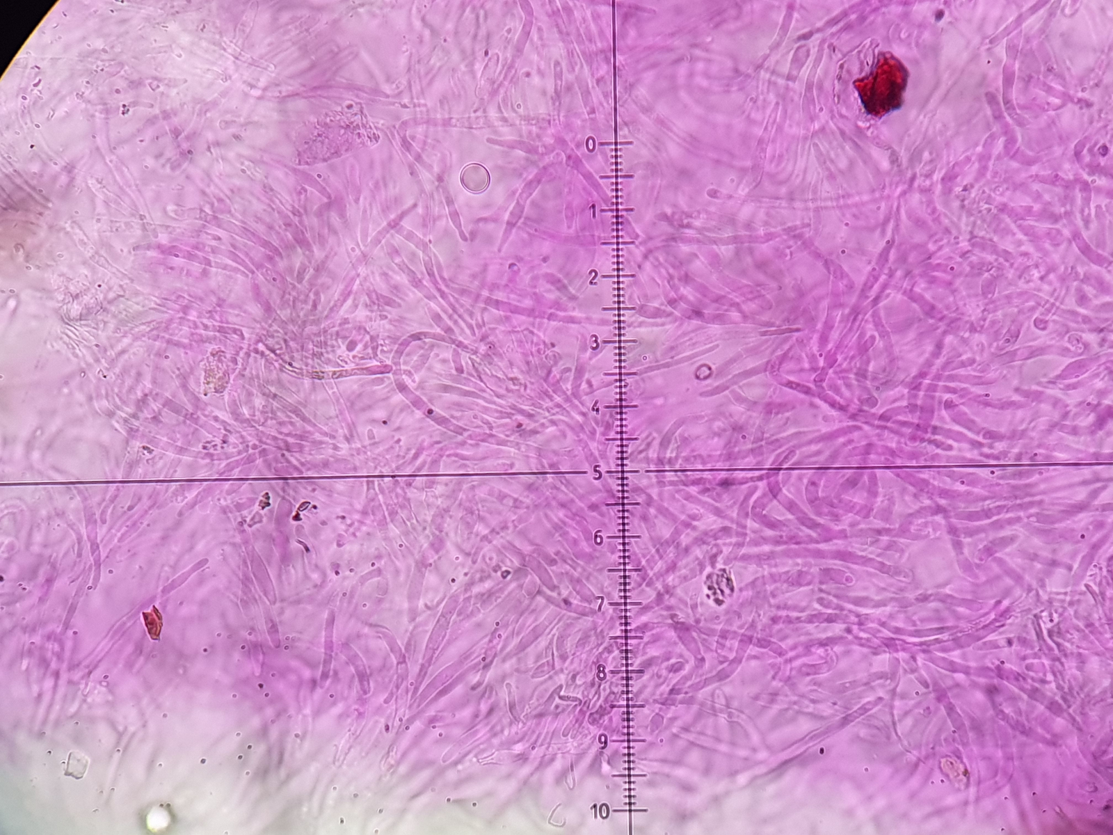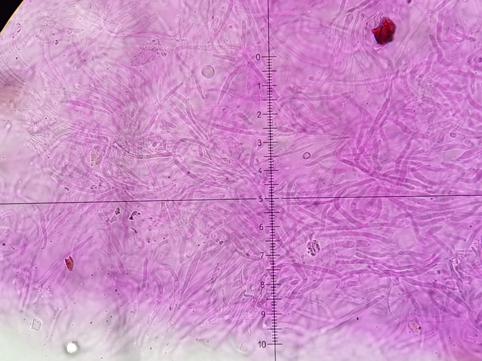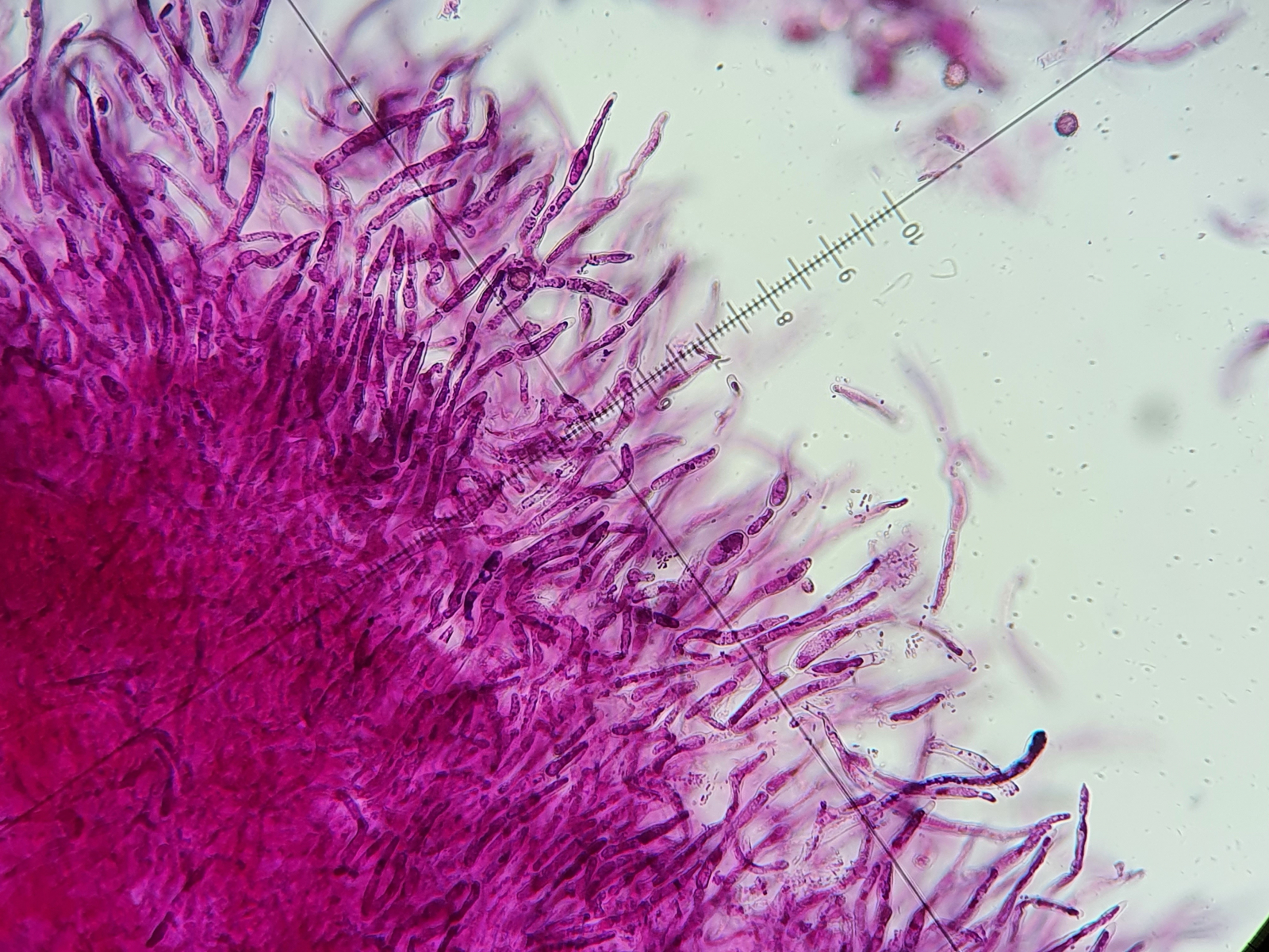 HDS: siehe Bild in Karbofuchsin (das sollten die Pileozystiden sein, richtig?): deutlich verzweigt, septiert, teils bauchig und Endzellen schmal auslaufend. Es fällt mir schwer die Zellen da zu beschreiben, ich lese allerlei aber die Zuordnung der Begriffe zu dem Gesehenen fällt mir schwer.