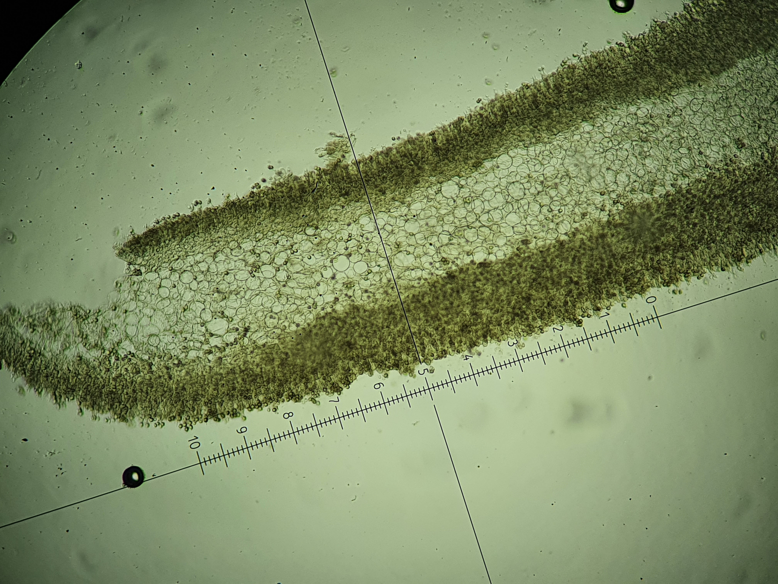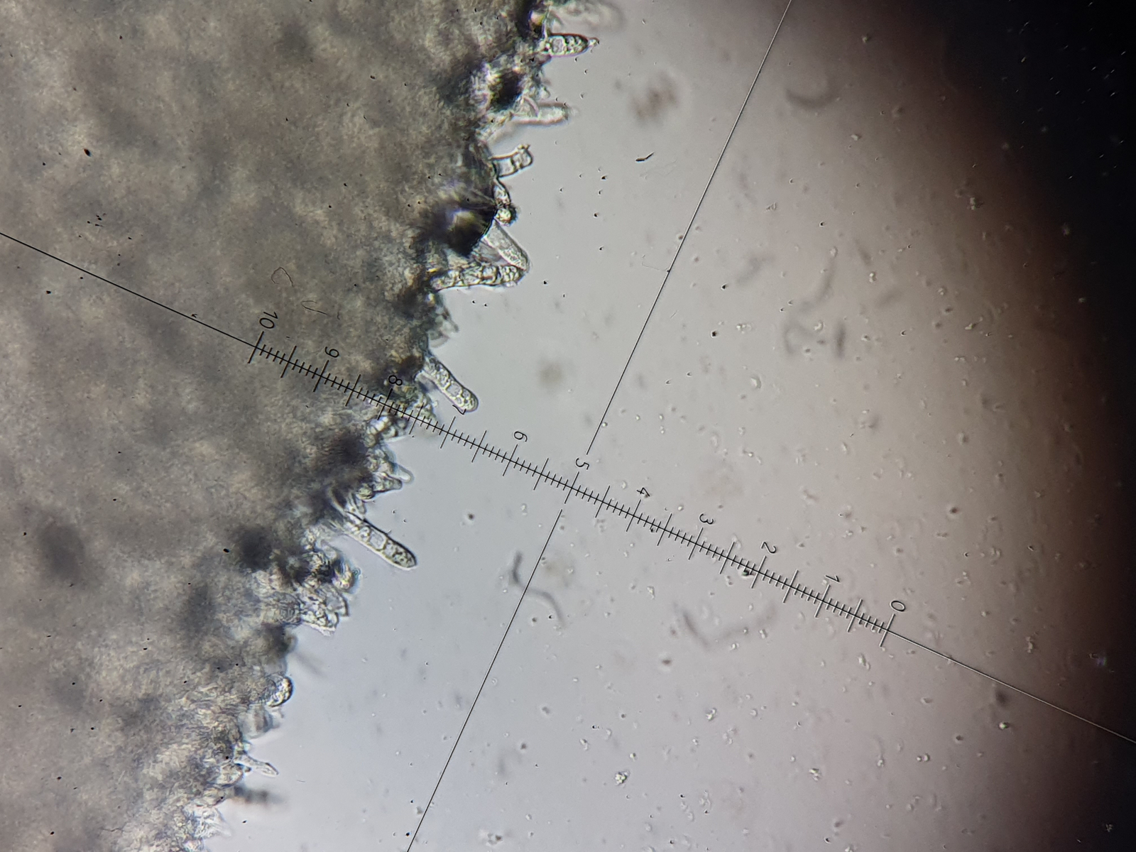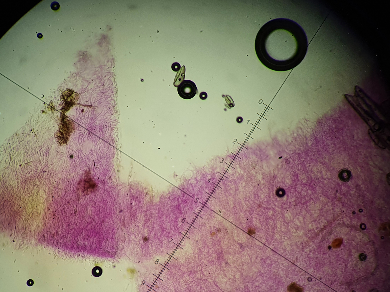 HDS: siehe Bild in Karbofuchsin (das sollten die Pileozystiden sein, richtig?): deutlich verzweigt, septiert, teils bauchig und Endzellen schmal auslaufend. Es fällt mir schwer die Zellen da zu beschreiben, ich lese allerlei aber die Zuordnung der Begriffe zu dem Gesehenen fällt mir schwer.