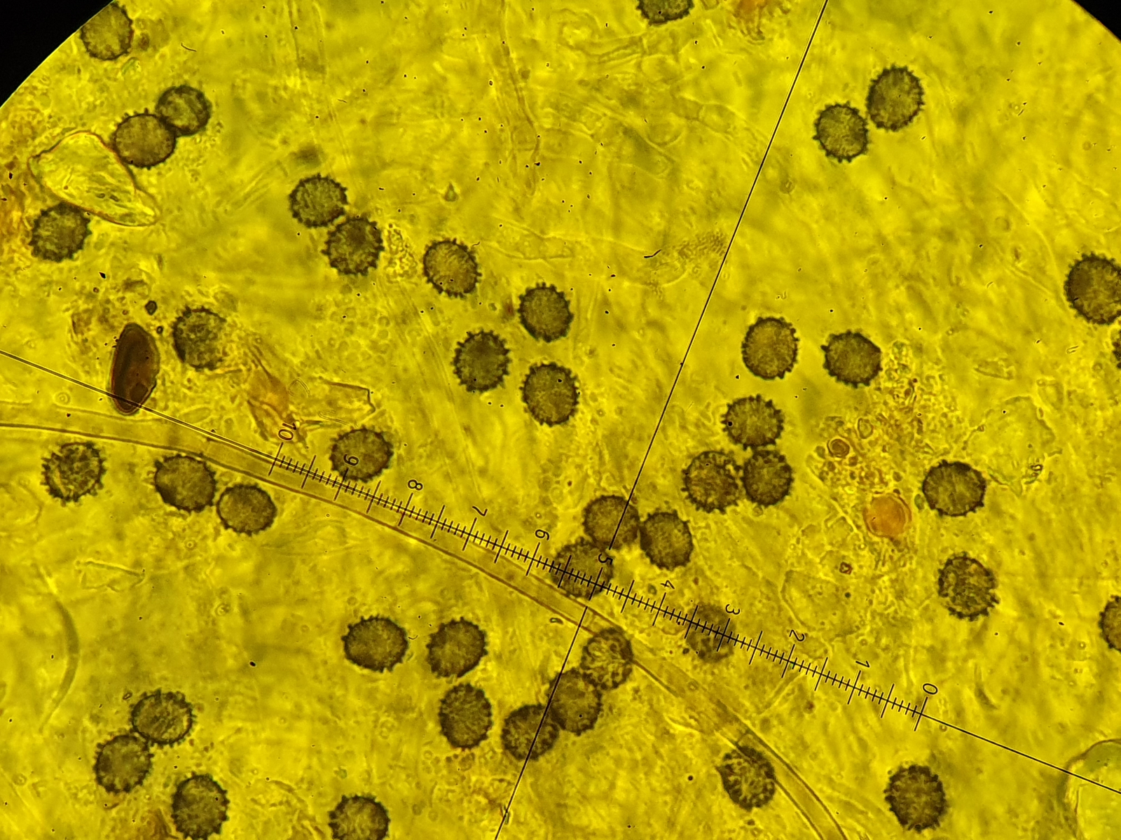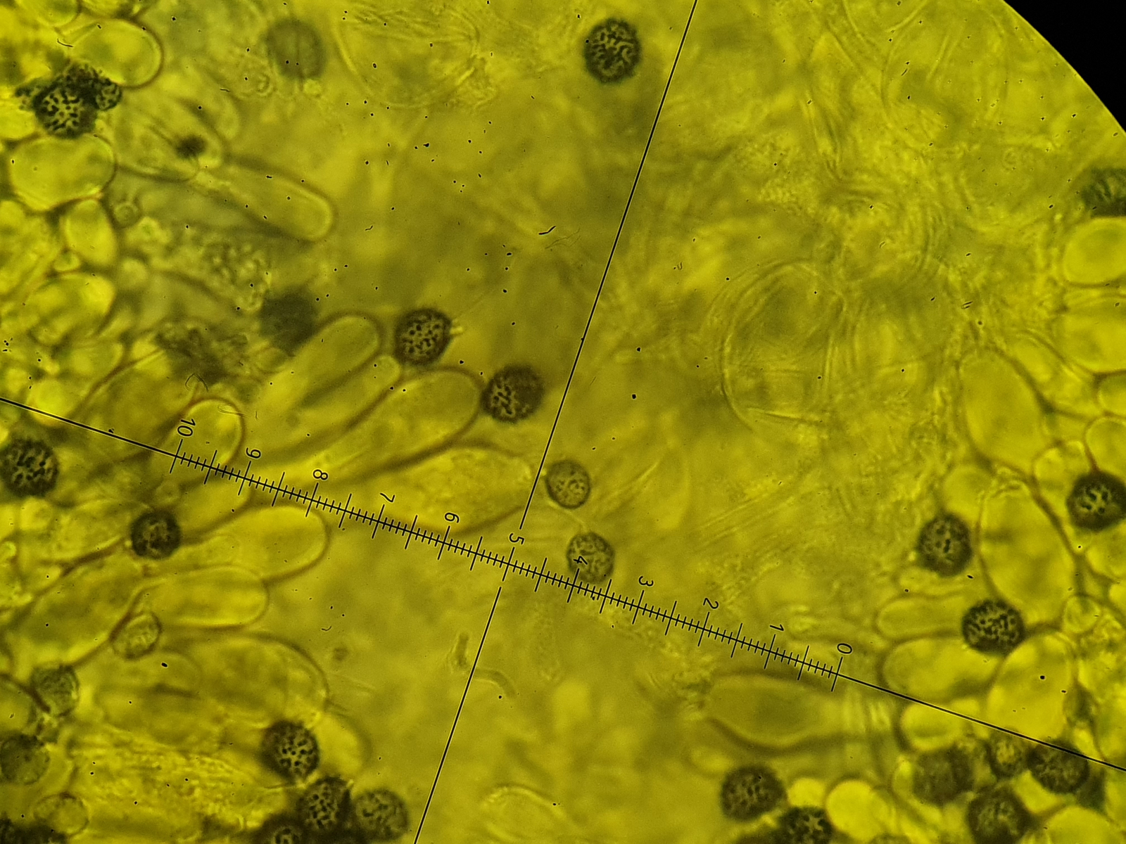 Mikromerkmale: Sporen 8-9x7µm, deutlich amyloid, weitestgehend isoliertwarzig, nach meinem dafürhalten ausgeprägte Warzen. Vereinzelt kratig verbunden? In der Masse aber eher nicht!