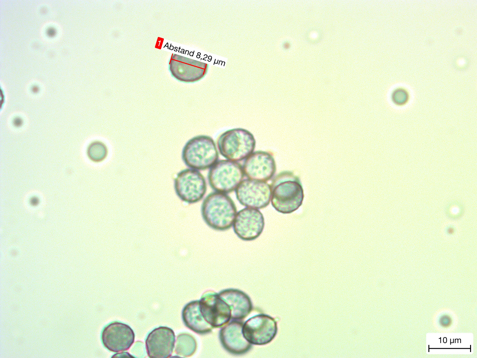 Die einzelnen Sporen am Ende habe ich in Melzers fotografiert. In der HDS waren auch welche, die allerdings nur in Wasser. Hier ist eine Art Corona zu erkennen. Wie misst man eigentlich die Größe? Mit Corona oder ohne in Wasser oder in Melzers?