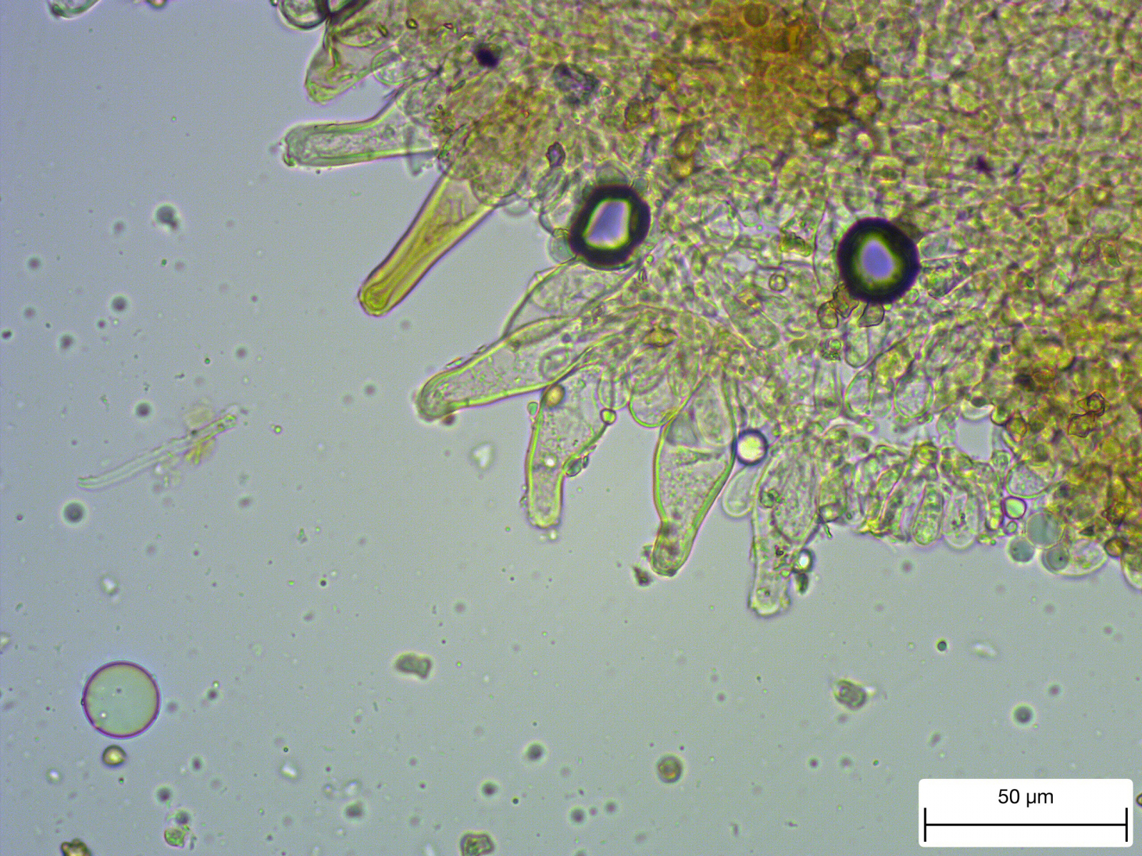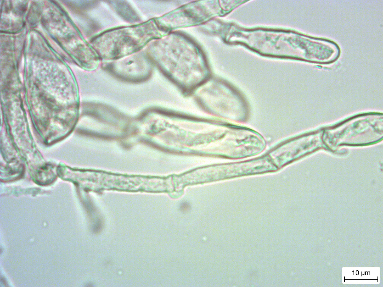 Liebe Claudia, tja, also so sagt mir das erst einmal nicht viel. Kannst du mal checken, ob auch in der unteren Stielfhälfte metuloide Zystiden vorhanden sind und kannst du mir etwas über das Habitat sagen? Welche Bäume wuchsen in der Nähe. Wo bist du? Ist das dort bergig oder Flachland, Sandboden oder wie sieht es da aus, wo die Pilze wuchsen? Ich kriege auch keinen Eindruck von der durchschnittlichen Sporengröße. Vermutlich müsste ich den Fund selbst untersuchen.
