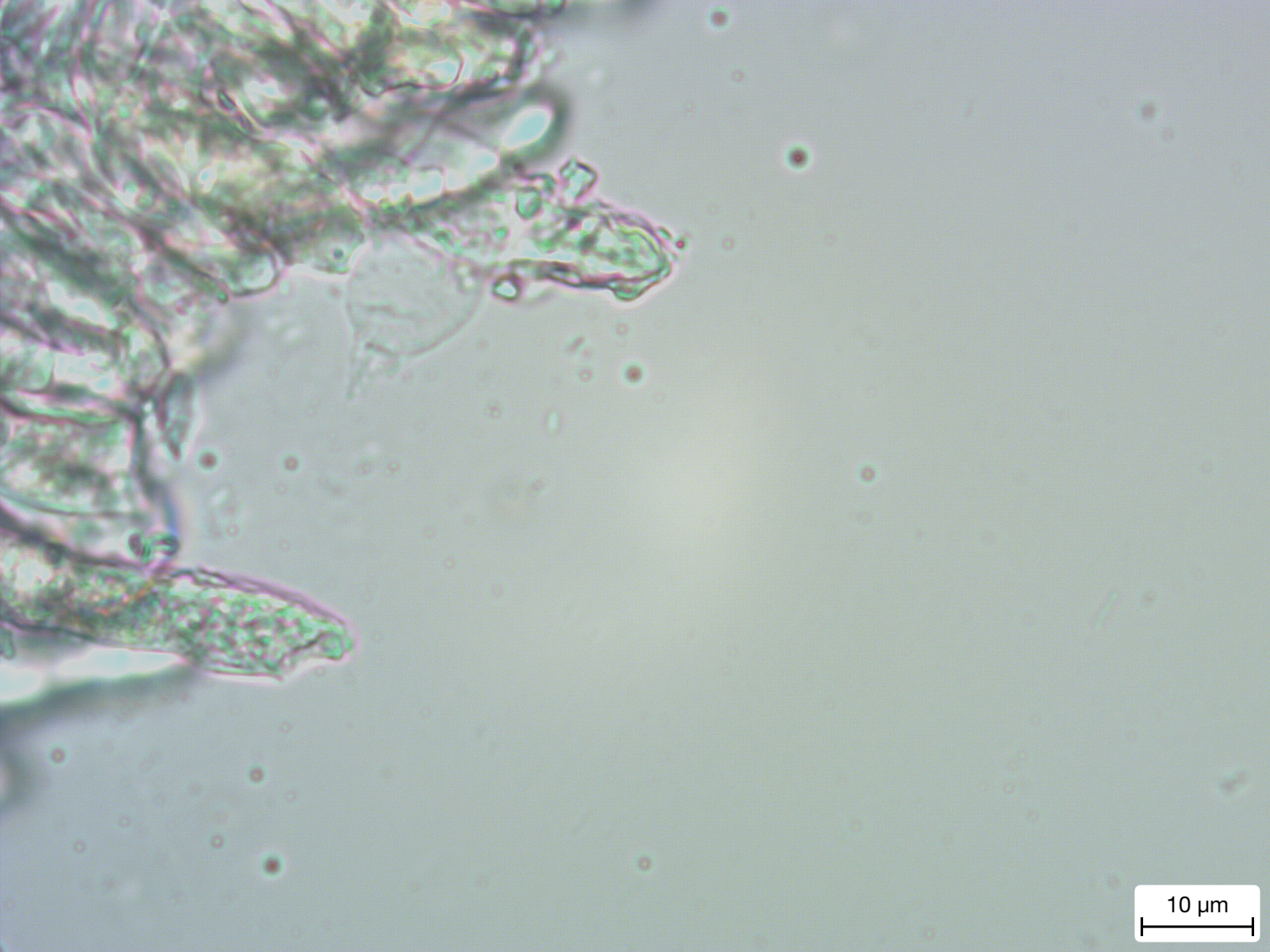 Die Huthaut von Täublingen kann verscheidene Elemente enthalten, die meistens in Kongorot ausreichen gut zu beurteilen sind. Ich nehme am Liebsten Kongo/SDS. Vorher ist jedoch zu beachten, dass kein Hutfleisch mehr mit ins Präparat gelangt. Das sind die runden Zellen auf Deinem Bild, durch welche alles überdeckt wird. Wenn Du langsam ein Stückchen Huthaut abziehst und die Rückseite anschaust, hast Du meistens eine Ecken, an der kein (weißes) Fleisch mehr hängt. Andernfalls musst Du es mit einer Rasierklinge abschaben. Von einer Stelle ohne Fleisch schneidest Du dann ein Stück ab, welches Du mit Kongorot anfärben und betrachten kannst. Eine gute Möglichkeit ist es einen sehr dünnen Streifen mit der Rasierklinge abzuschneiden, wobei sehr dünn möglichst weniger als ein 0,2 mm ist. Das angefärbte Präparat etwas quetschen. Meistens liegen die zur Beurteilung erforderlichen Elemente zumindest an einer Seite dann schon frei.Die Elemente mit dem grieseligen Inhalt sind Pileozystiden (Dermatozystiden), die übrigen Elemente sind Endzellen der Huthautbekleidung und werden oft als Haare bezeichnet. Dann gibt es noch die sogenannten inkrustierten Primordialhyphen, die ich bei Deinem Pilz 2 allerdings nicht erwarte.