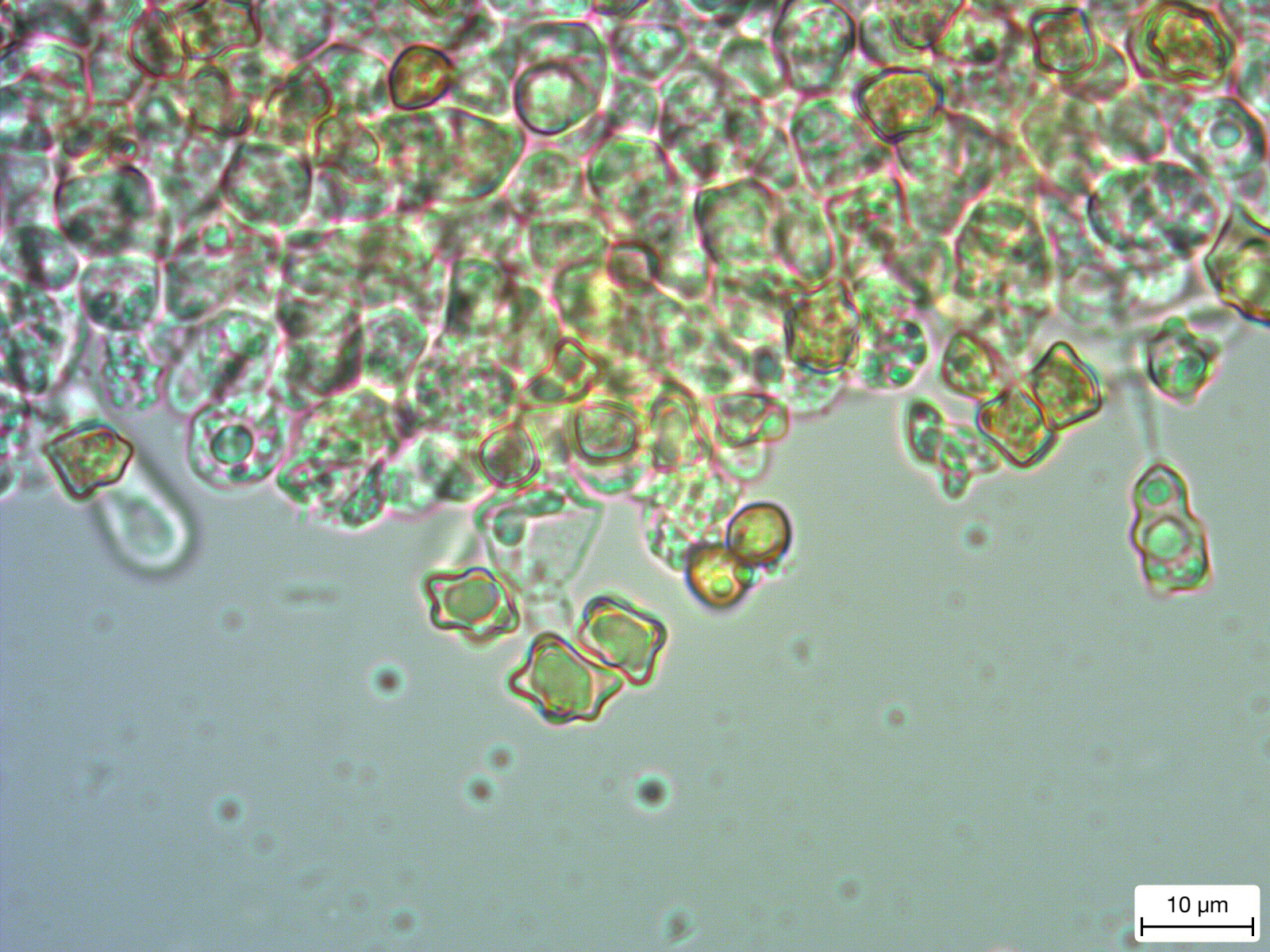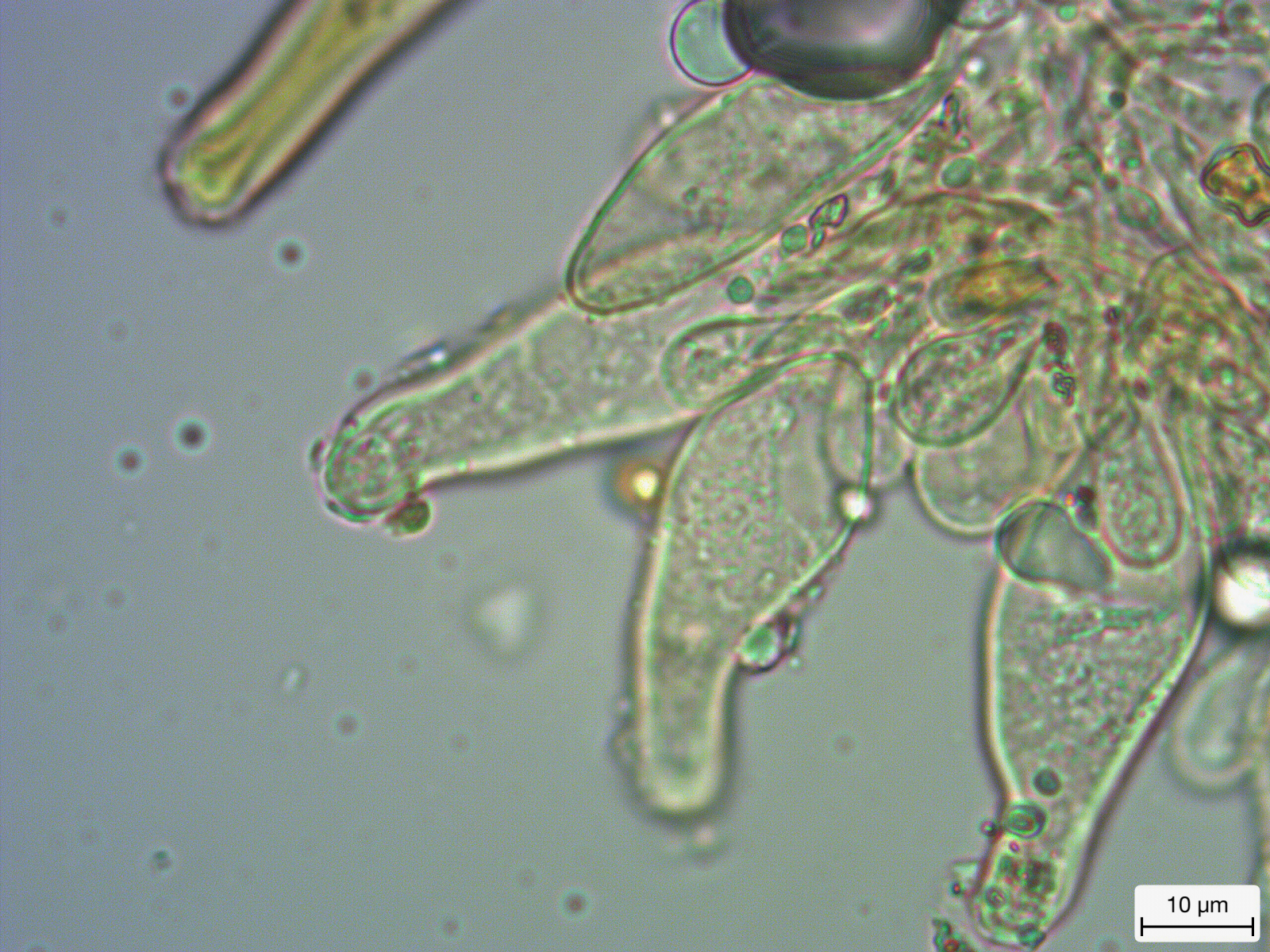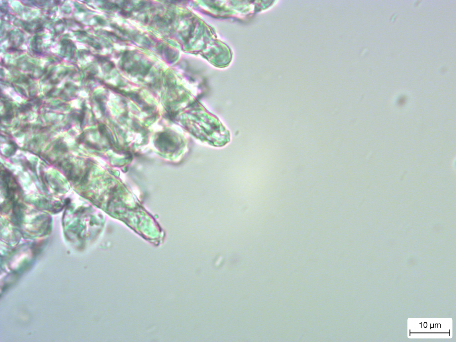 Die Huthaut von Täublingen kann verscheidene Elemente enthalten, die meistens in Kongorot ausreichen gut zu beurteilen sind. Ich nehme am Liebsten Kongo/SDS. Vorher ist jedoch zu beachten, dass kein Hutfleisch mehr mit ins Präparat gelangt. Das sind die runden Zellen auf Deinem Bild, durch welche alles überdeckt wird. Wenn Du langsam ein Stückchen Huthaut abziehst und die Rückseite anschaust, hast Du meistens eine Ecken, an der kein (weißes) Fleisch mehr hängt. Andernfalls musst Du es mit einer Rasierklinge abschaben. Von einer Stelle ohne Fleisch schneidest Du dann ein Stück ab, welches Du mit Kongorot anfärben und betrachten kannst. Eine gute Möglichkeit ist es einen sehr dünnen Streifen mit der Rasierklinge abzuschneiden, wobei sehr dünn möglichst weniger als ein 0,2 mm ist. Das angefärbte Präparat etwas quetschen. Meistens liegen die zur Beurteilung erforderlichen Elemente zumindest an einer Seite dann schon frei.Die Elemente mit dem grieseligen Inhalt sind Pileozystiden (Dermatozystiden), die übrigen Elemente sind Endzellen der Huthautbekleidung und werden oft als Haare bezeichnet. Dann gibt es noch die sogenannten inkrustierten Primordialhyphen, die ich bei Deinem Pilz 2 allerdings nicht erwarte.