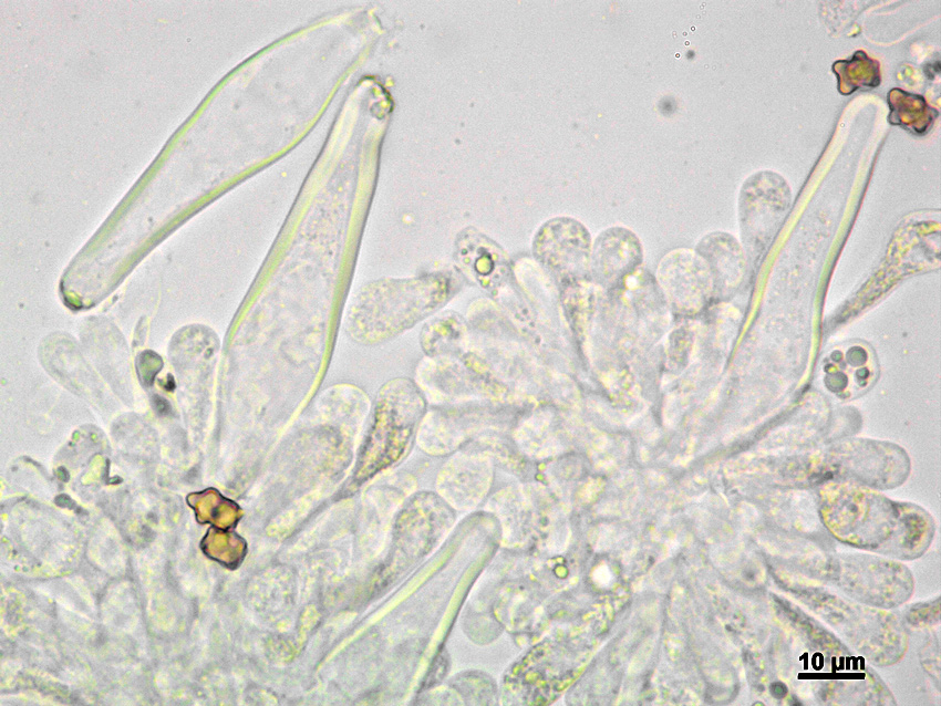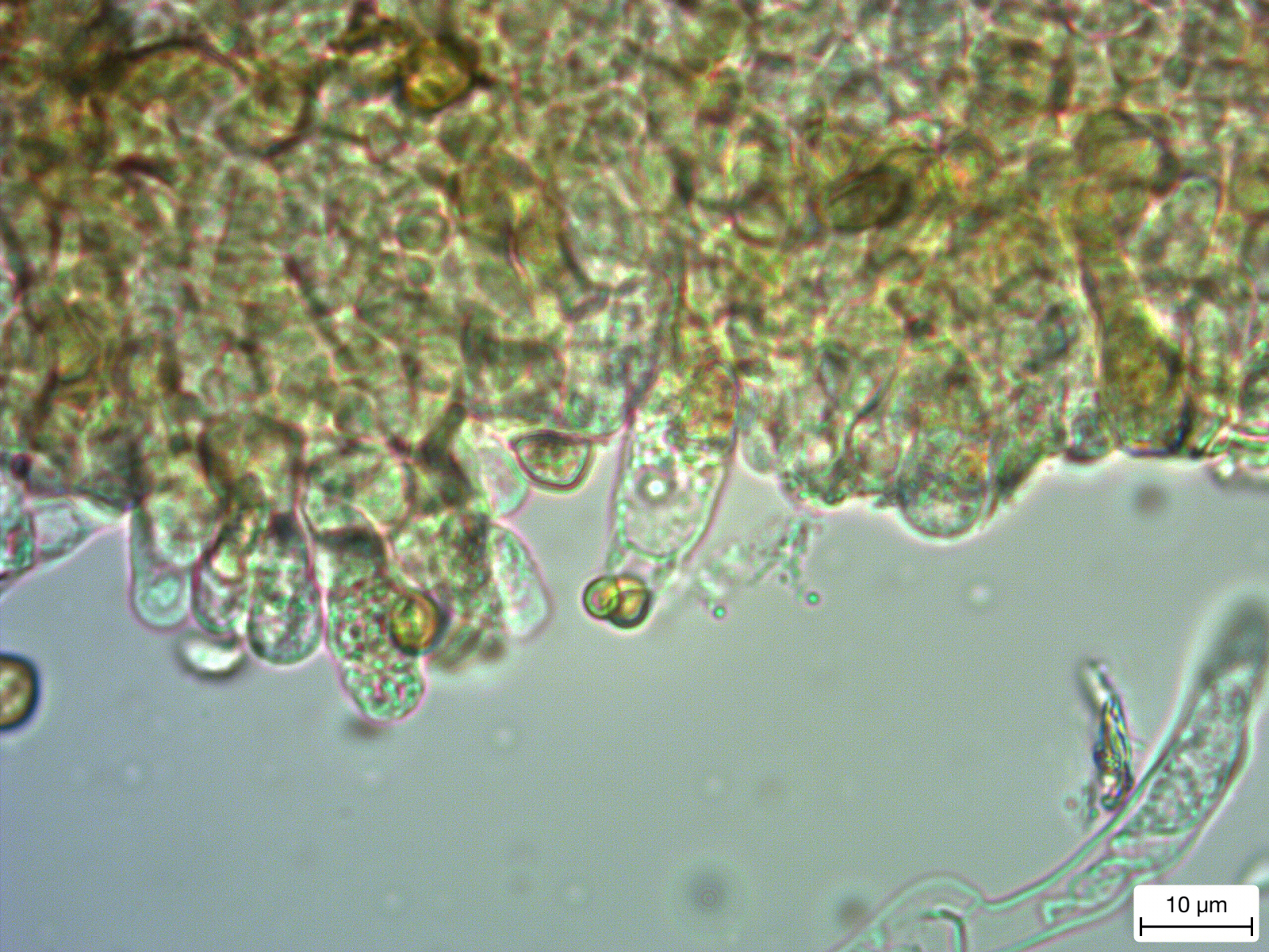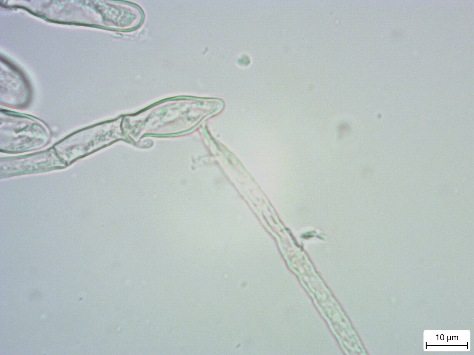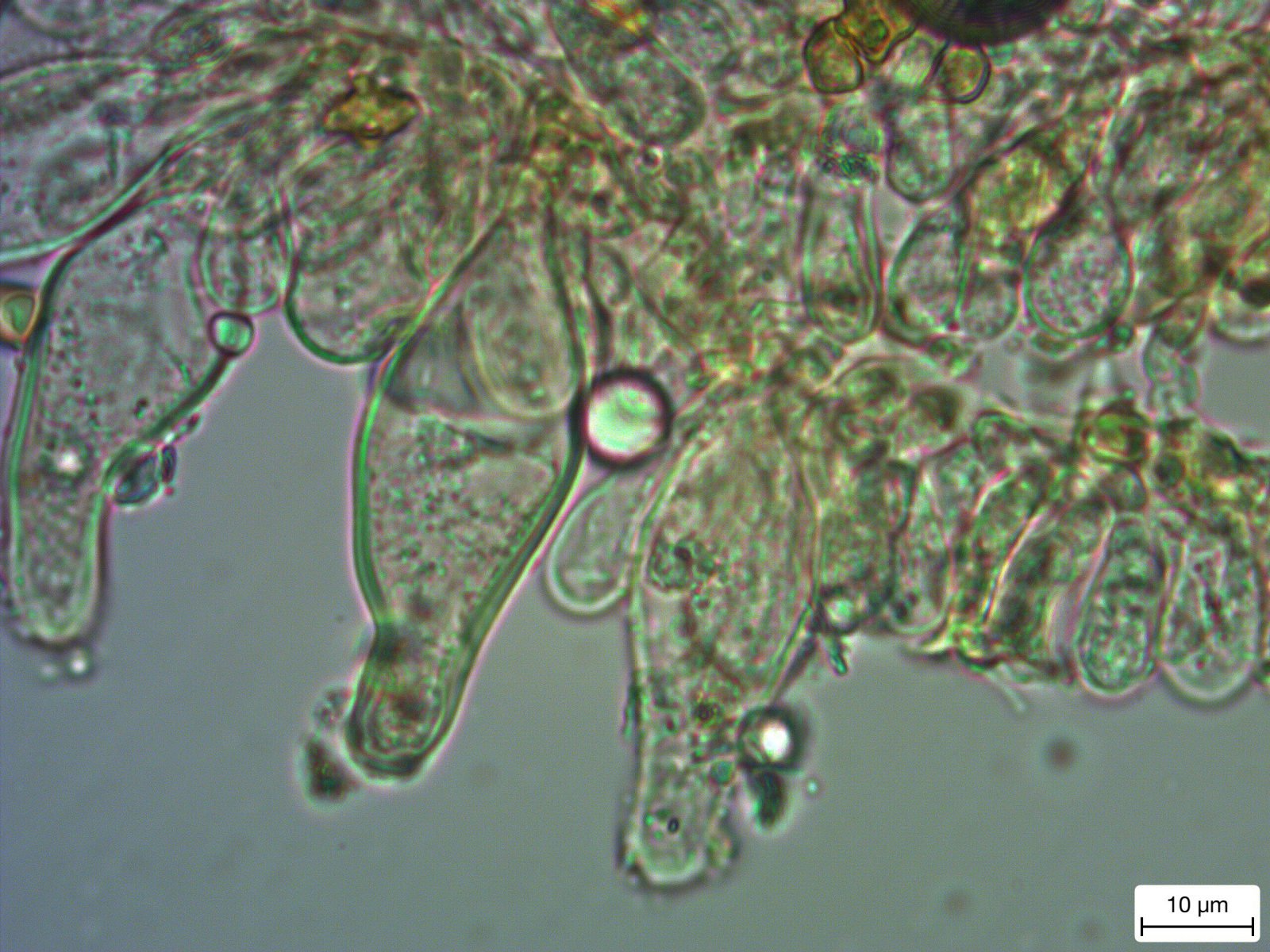 Die Huthaut von Täublingen kann verscheidene Elemente enthalten, die meistens in Kongorot ausreichen gut zu beurteilen sind. Ich nehme am Liebsten Kongo/SDS. Vorher ist jedoch zu beachten, dass kein Hutfleisch mehr mit ins Präparat gelangt. Das sind die runden Zellen auf Deinem Bild, durch welche alles überdeckt wird. Wenn Du langsam ein Stückchen Huthaut abziehst und die Rückseite anschaust, hast Du meistens eine Ecken, an der kein (weißes) Fleisch mehr hängt. Andernfalls musst Du es mit einer Rasierklinge abschaben. Von einer Stelle ohne Fleisch schneidest Du dann ein Stück ab, welches Du mit Kongorot anfärben und betrachten kannst. Eine gute Möglichkeit ist es einen sehr dünnen Streifen mit der Rasierklinge abzuschneiden, wobei sehr dünn möglichst weniger als ein 0,2 mm ist. Das angefärbte Präparat etwas quetschen. Meistens liegen die zur Beurteilung erforderlichen Elemente zumindest an einer Seite dann schon frei.Die Elemente mit dem grieseligen Inhalt sind Pileozystiden (Dermatozystiden), die übrigen Elemente sind Endzellen der Huthautbekleidung und werden oft als Haare bezeichnet. Dann gibt es noch die sogenannten inkrustierten Primordialhyphen, die ich bei Deinem Pilz 2 allerdings nicht erwarte.
