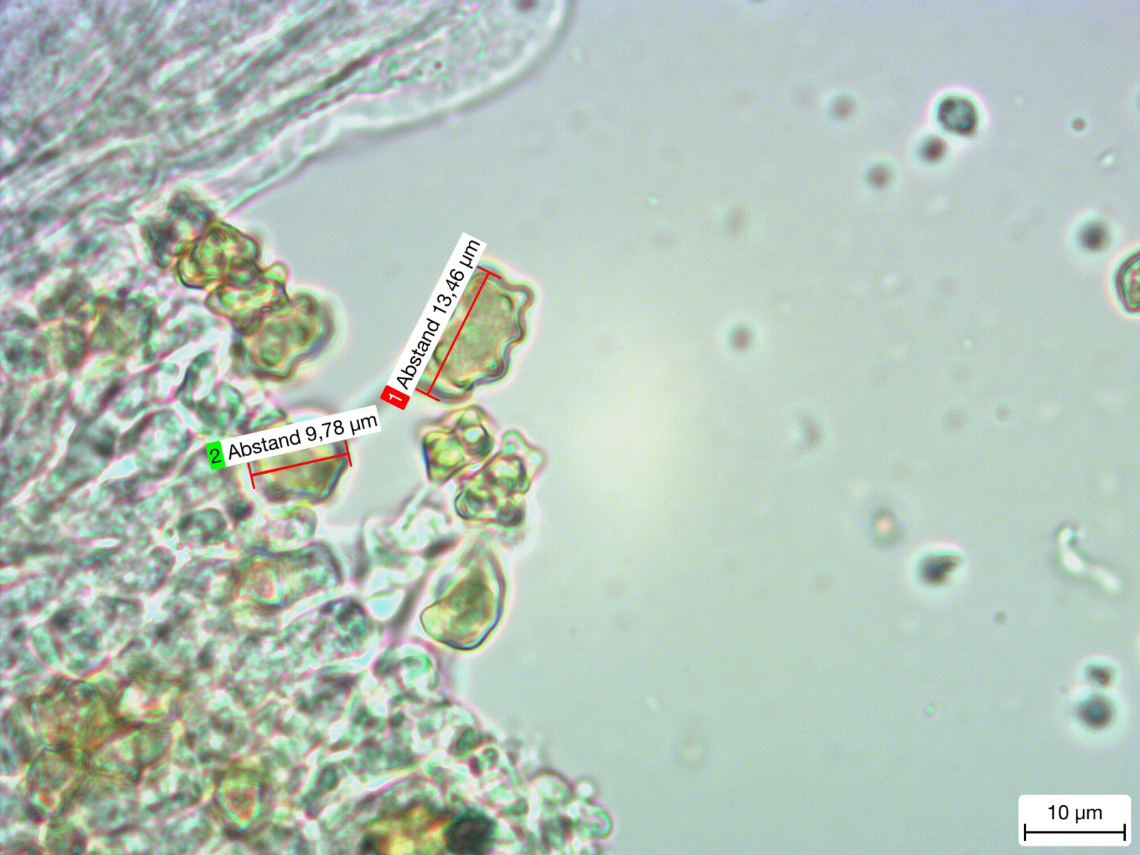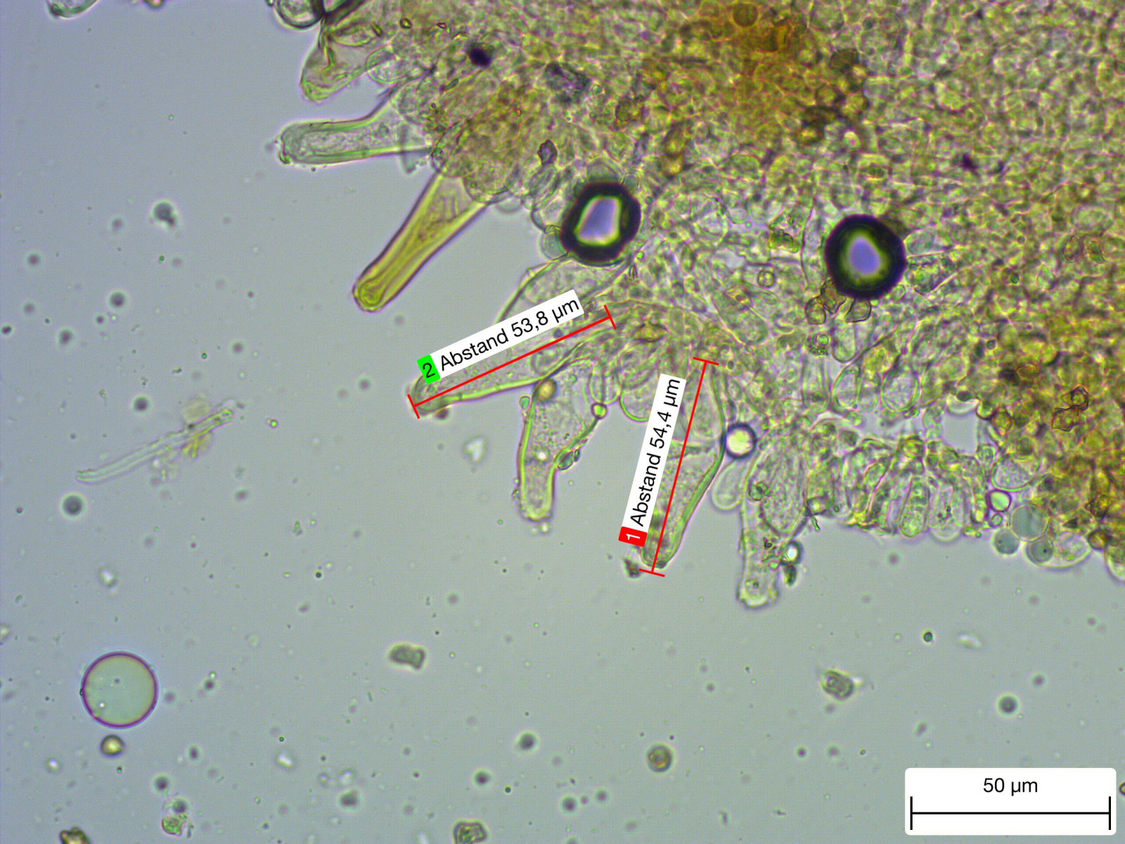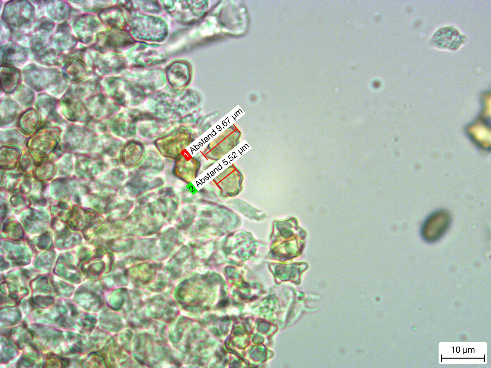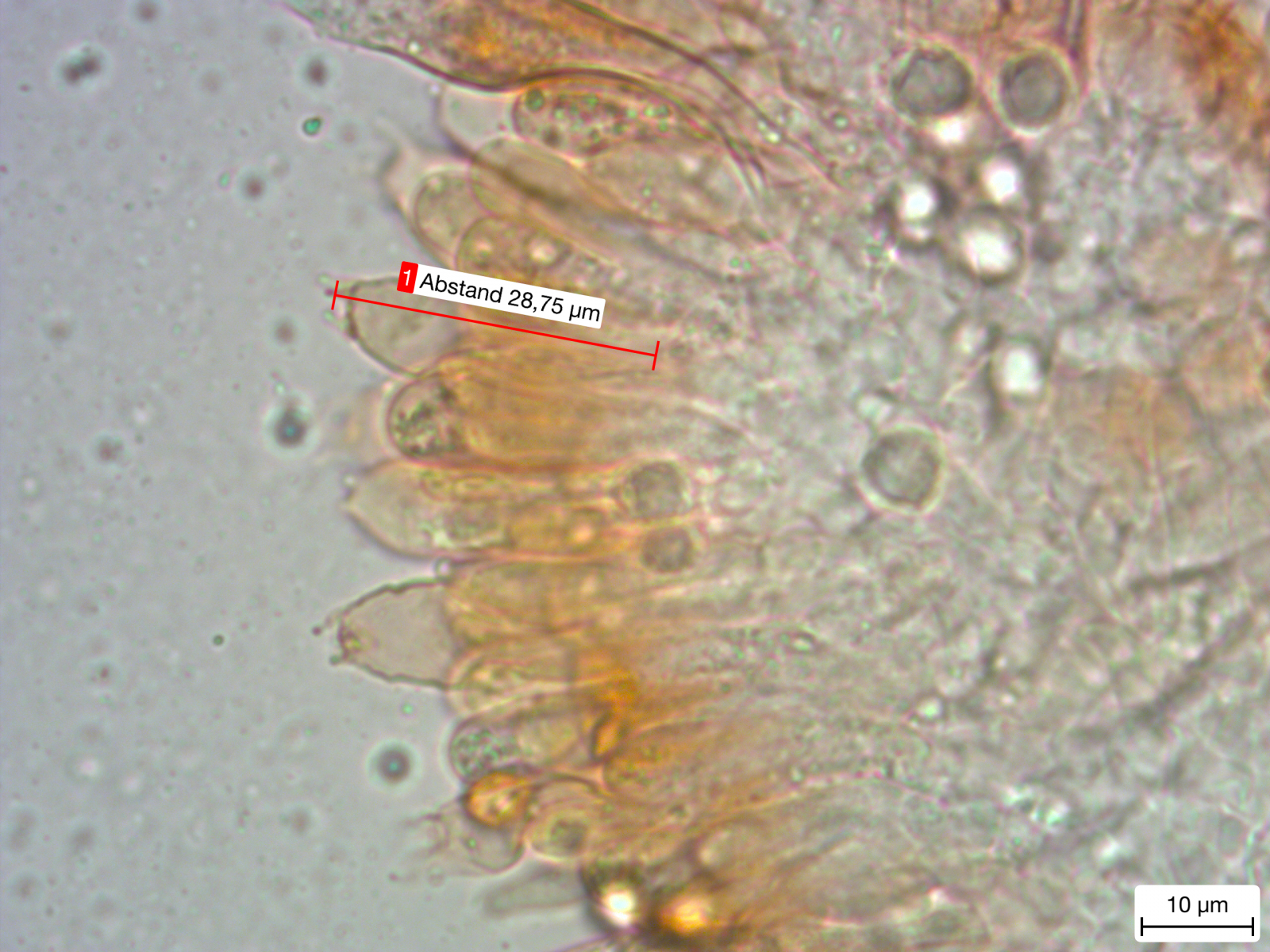 Die Länge der Basidien kann ich nicht genau messen, weil ich nur wenige Basidien gefunden habe, und wenn dann waren sie nicht in Gänze zu sehen.