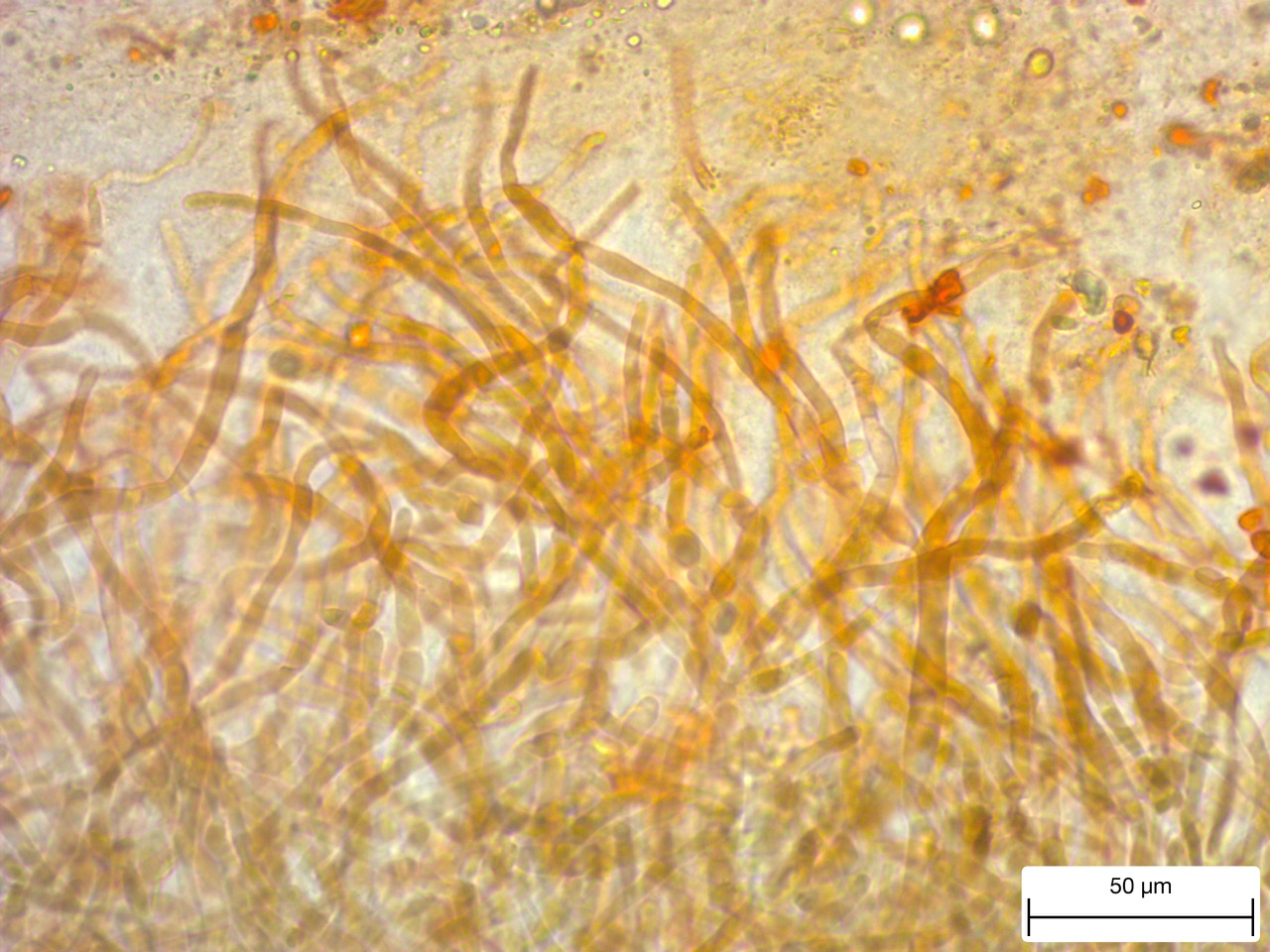 Liebe Claudia, tja, also so sagt mir das erst einmal nicht viel. Kannst du mal checken, ob auch in der unteren Stielfhälfte metuloide Zystiden vorhanden sind und kannst du mir etwas über das Habitat sagen? Welche Bäume wuchsen in der Nähe. Wo bist du? Ist das dort bergig oder Flachland, Sandboden oder wie sieht es da aus, wo die Pilze wuchsen? Ich kriege auch keinen Eindruck von der durchschnittlichen Sporengröße. Vermutlich müsste ich den Fund selbst untersuchen.