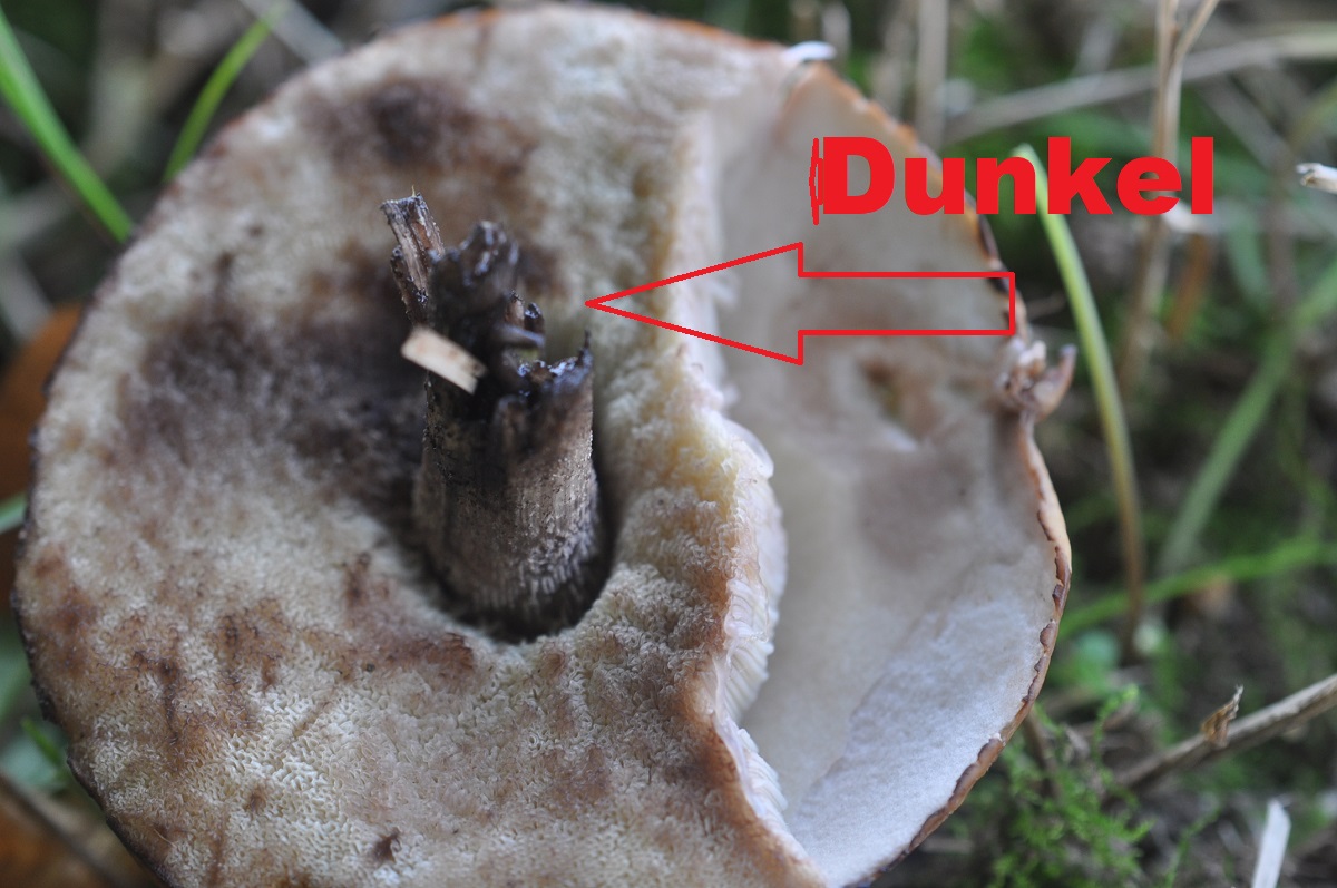 Zwischen Huthaut und Hutfleisch kann ich keine Verfärbung erkennen.
