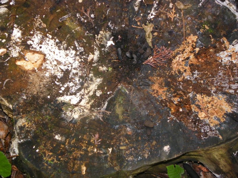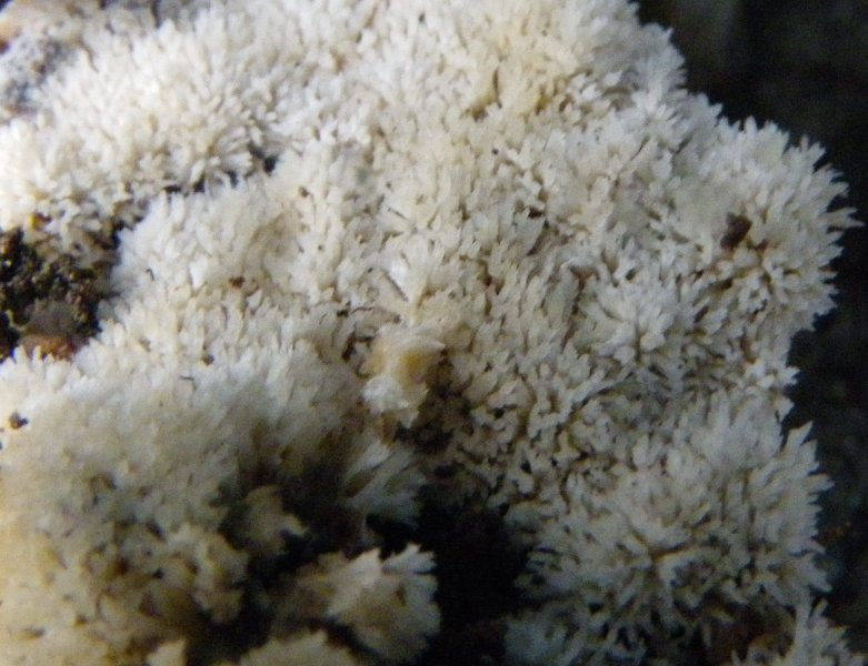 diese Pilze wachsen auf einem Holzstumpf vor unserem Haus: der in der Mitte dürfte Xylaria polymorpha sein (Vielgestaltige Holzkeule, Fleisch weiß). Sind die anderen zwei Schleimpilze (orange und weiß)? Vom weißen liegt ein Detailfoto bei. (A-Vorarlberg)