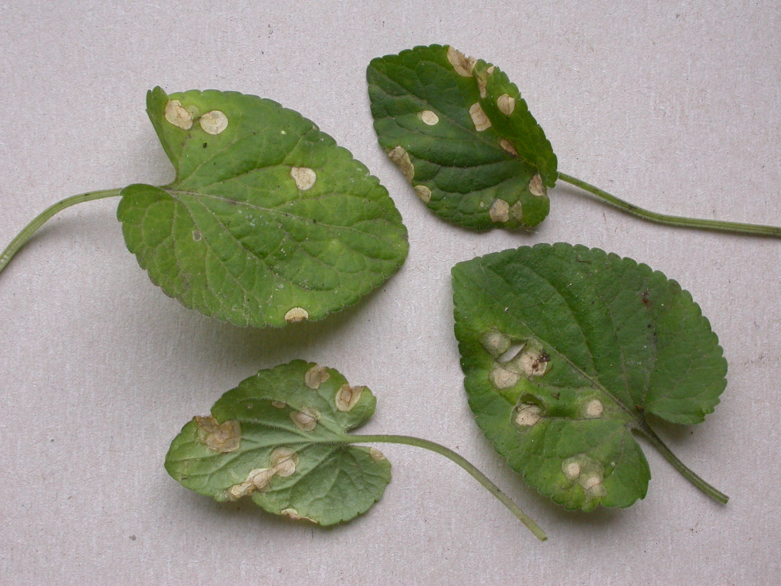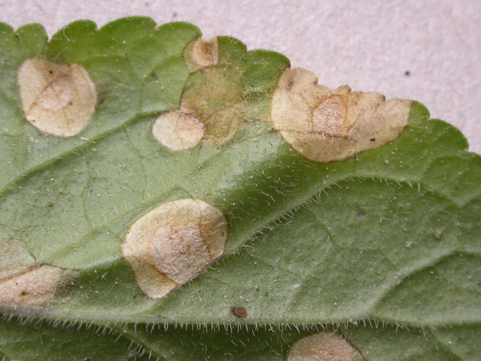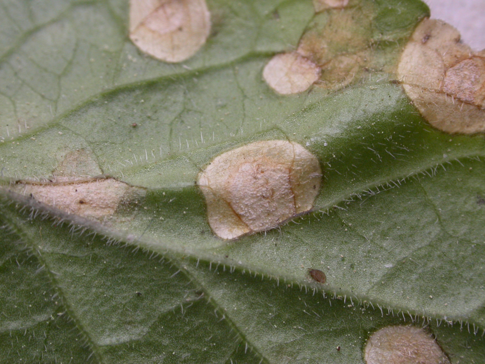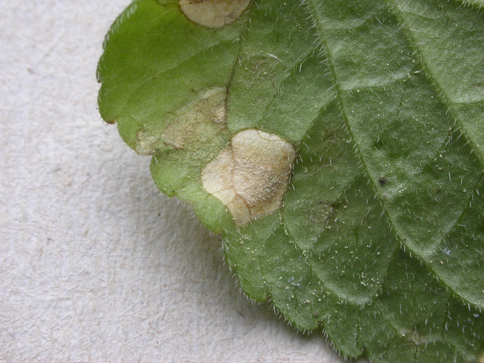 An der Unterseite sieht man in der Mitte der Flecken abgegrenzt schön die Konidienträger.