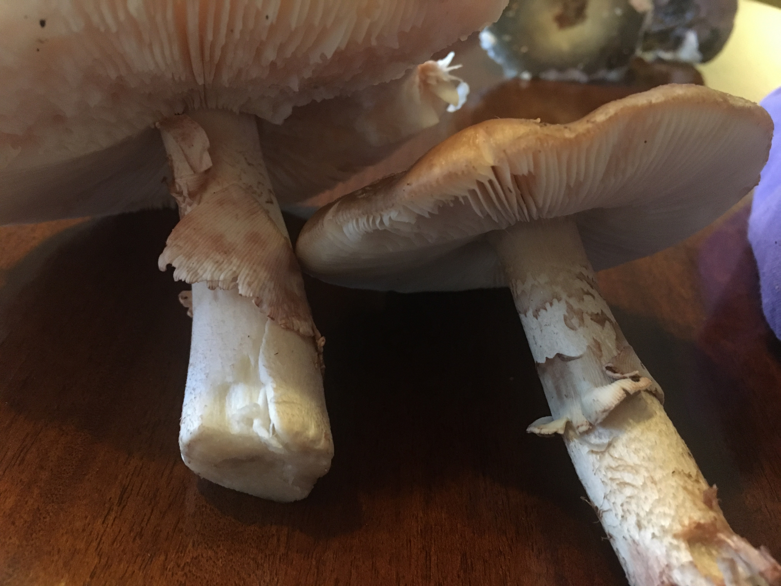 Das sieht nach der Gattung Amanita aus, Fuss leider abgeschnitten, das wäre ein wichtiges Bestimmungsmerkmal. Einige Hinweise deuten in Richtung Perlpilz, die rötlichen Farben, die geriefte Manschette. Lamellen eng, weiss mit rosalichen Hauch (?). Eine endgültige Bestimmung ist natürlich nicht möglich. Die wichtigsten Merkmale könntest du noch besser in Szene setzen.