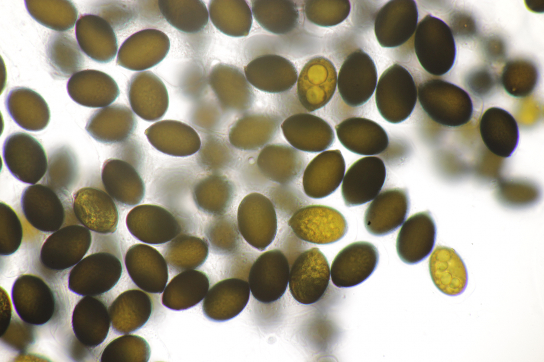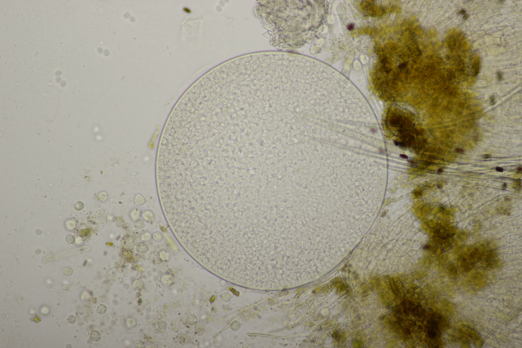 3. Hier lande ich mit den septierten Haaren und dem einen, prall gefüllten Ascus bei Trichobolus. Aber welcher? Der erste untersuchte Fruchtkörper hatte Sporen (7.9+-0.3) x (6.1+-0.2) Q=1.3+-0.1. Ein Fruchtkörper, den ich einen Tag später unterm Mikro hatte, lieferte (9.9+-0.2) x (7.8+-0.2), Q=1.26+-0.04. Man erkennt also eine Tendenz zu immer größeren Sporen (ich nehme an, wegen zunehmender Reife). Von der Elliptizität her lande ich auf jeden Fall bei Trichobolus zukalii. Die Sporengröße würde eher zu T. sphaeroporus passen. Ich denke aber, daß selbst der zweite Fruchtkörper evtl. noch nicht vollreif war und die Sporen deshalb zu klein geraten sind.