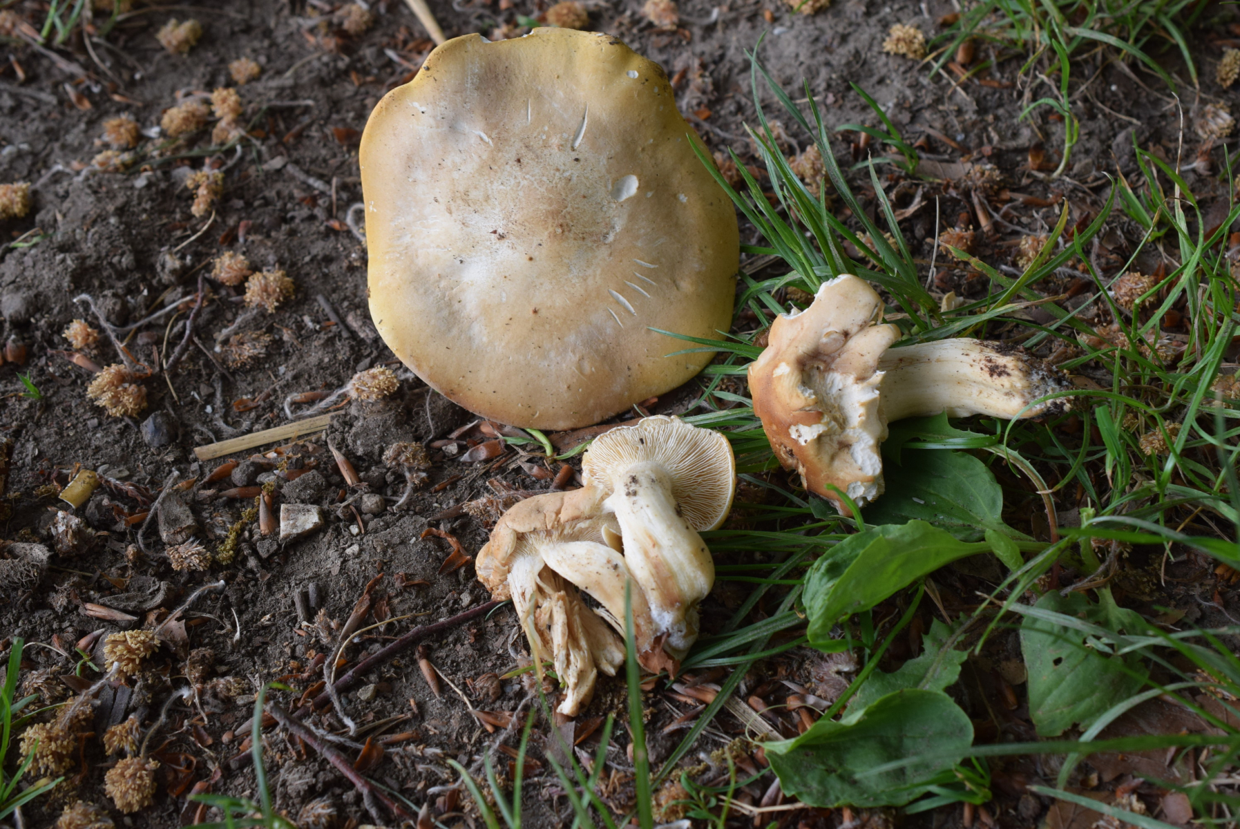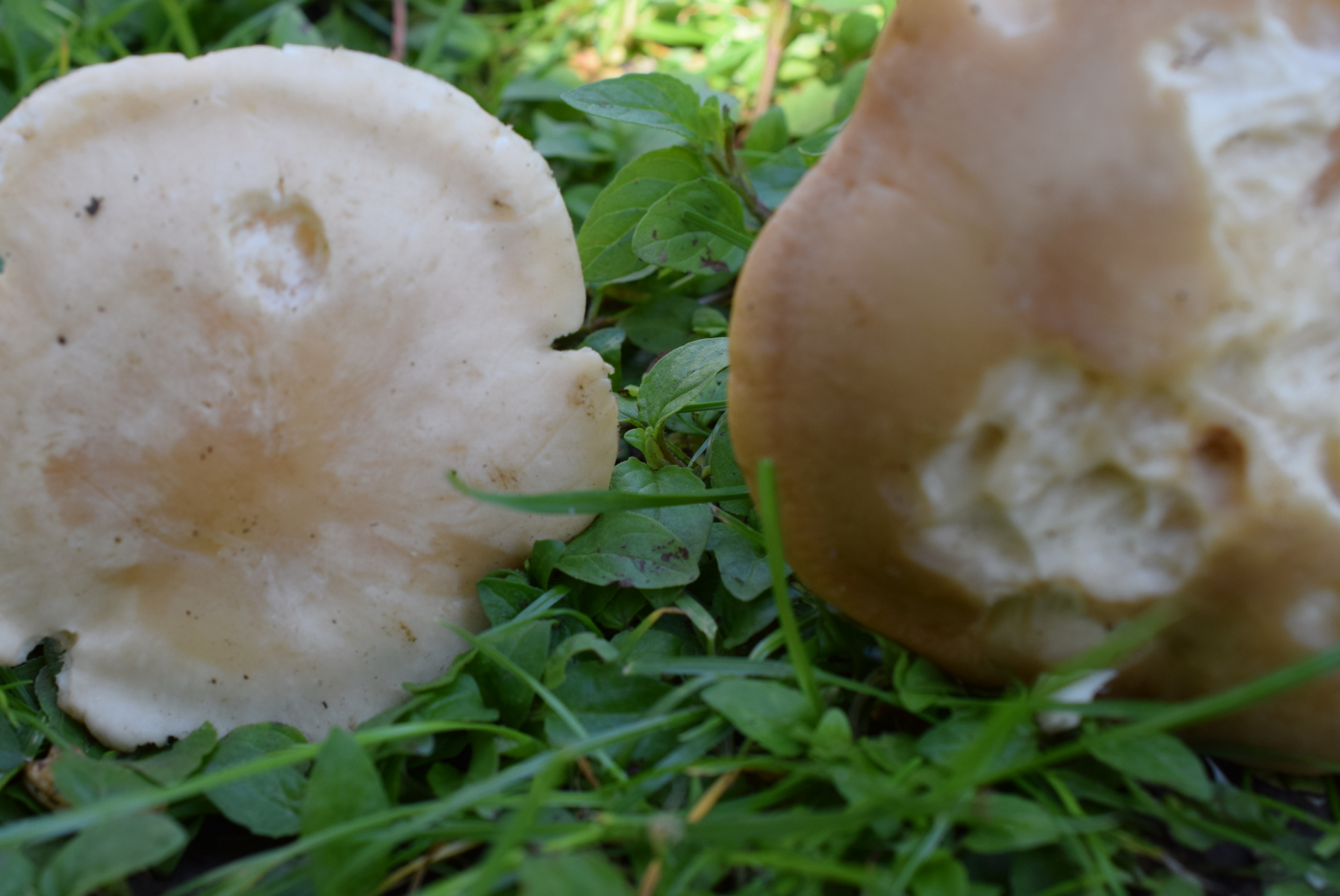 Das ist ganz normale Maipilze - Calocybe gambosa , in keinen fall form flavida . Braun Farbe ist wegen altere Stadium auch wegen zu viel regen usw. , C. flacida hat andere Farbe .