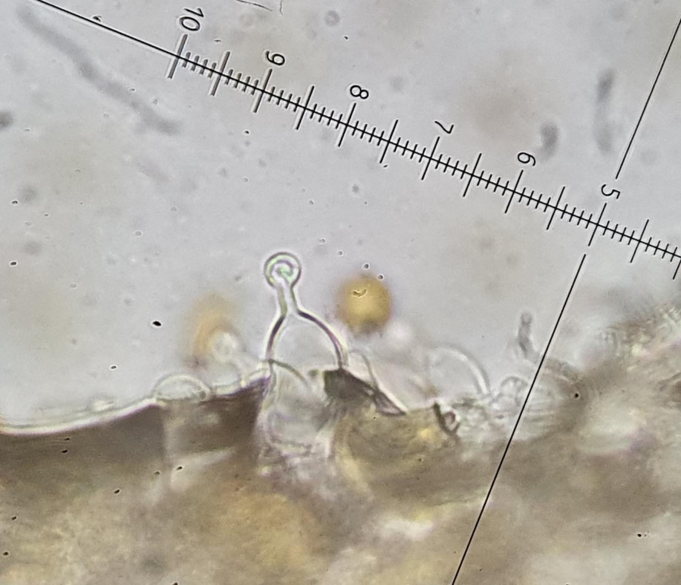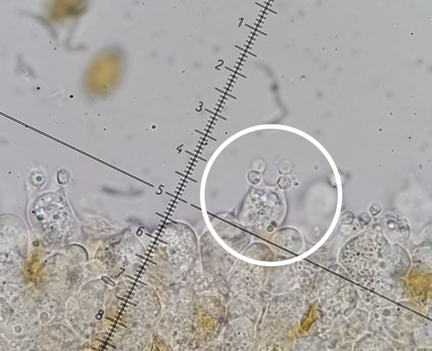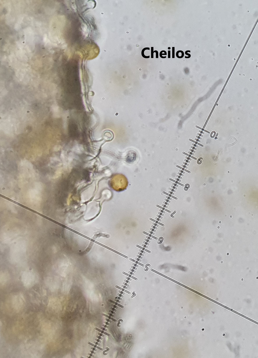Cheilos und Kaulozystiden lecythiform (siehe ebenfalls Bilder), Kopf wenige µm, Körper etwa 7µm