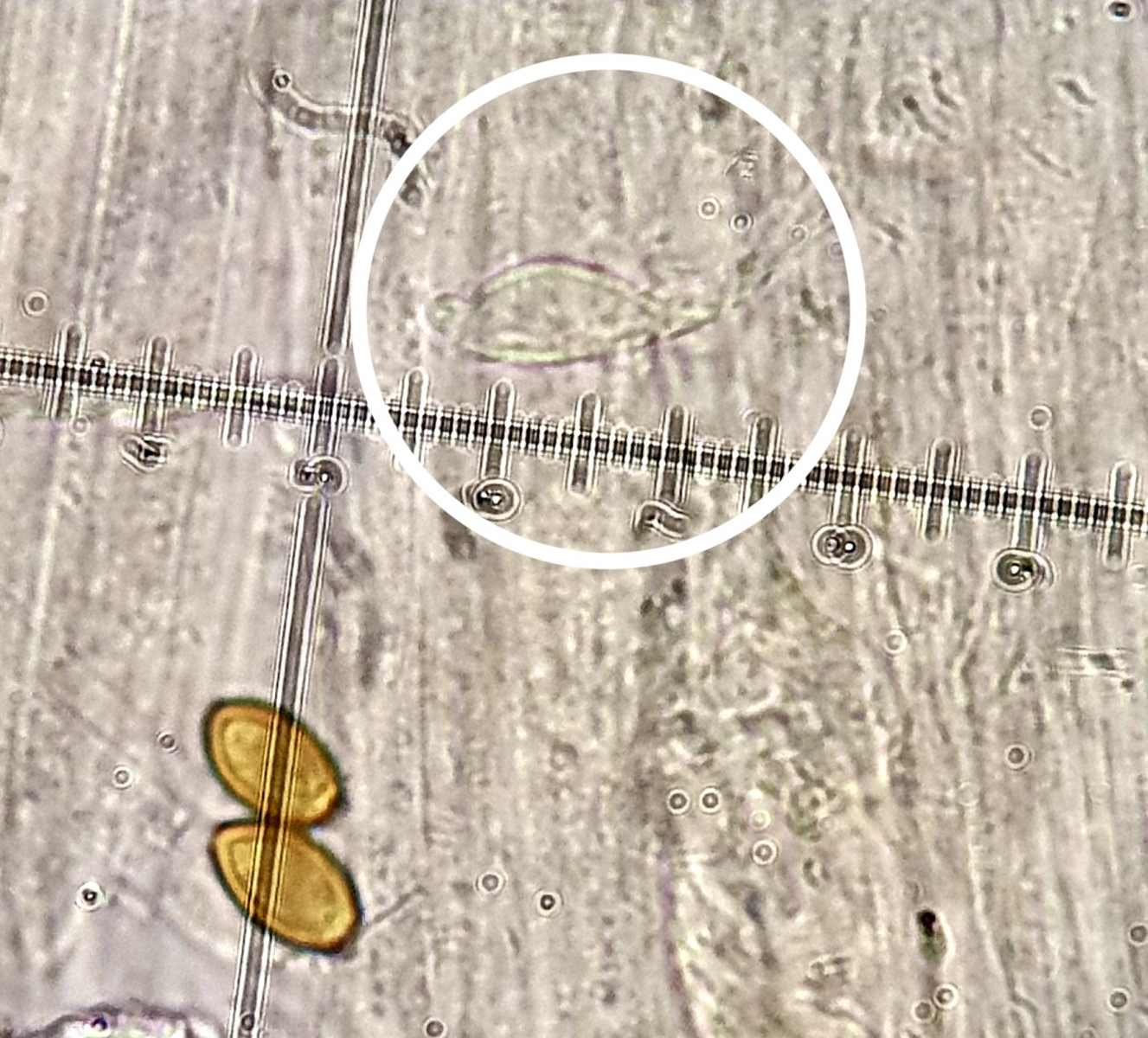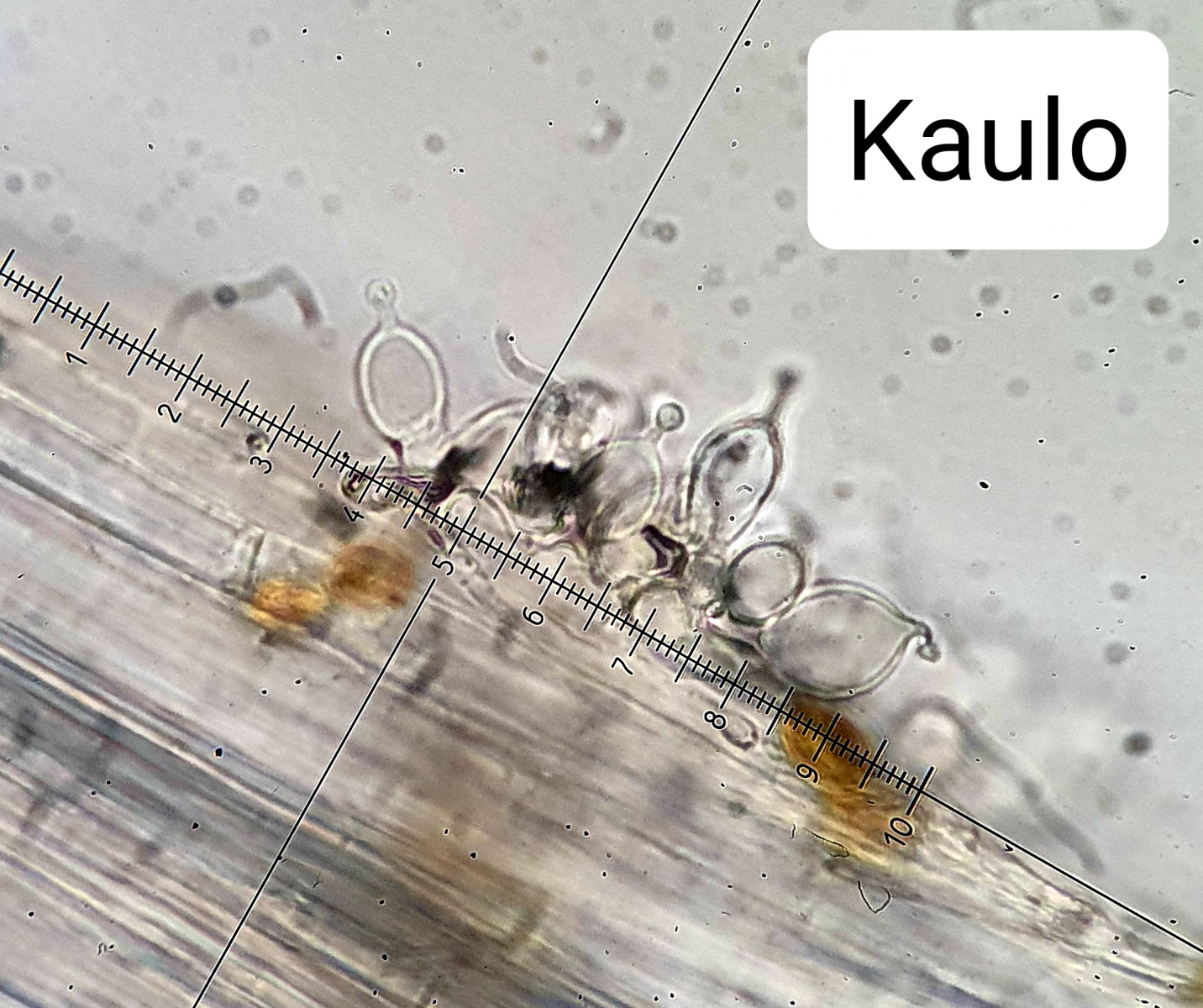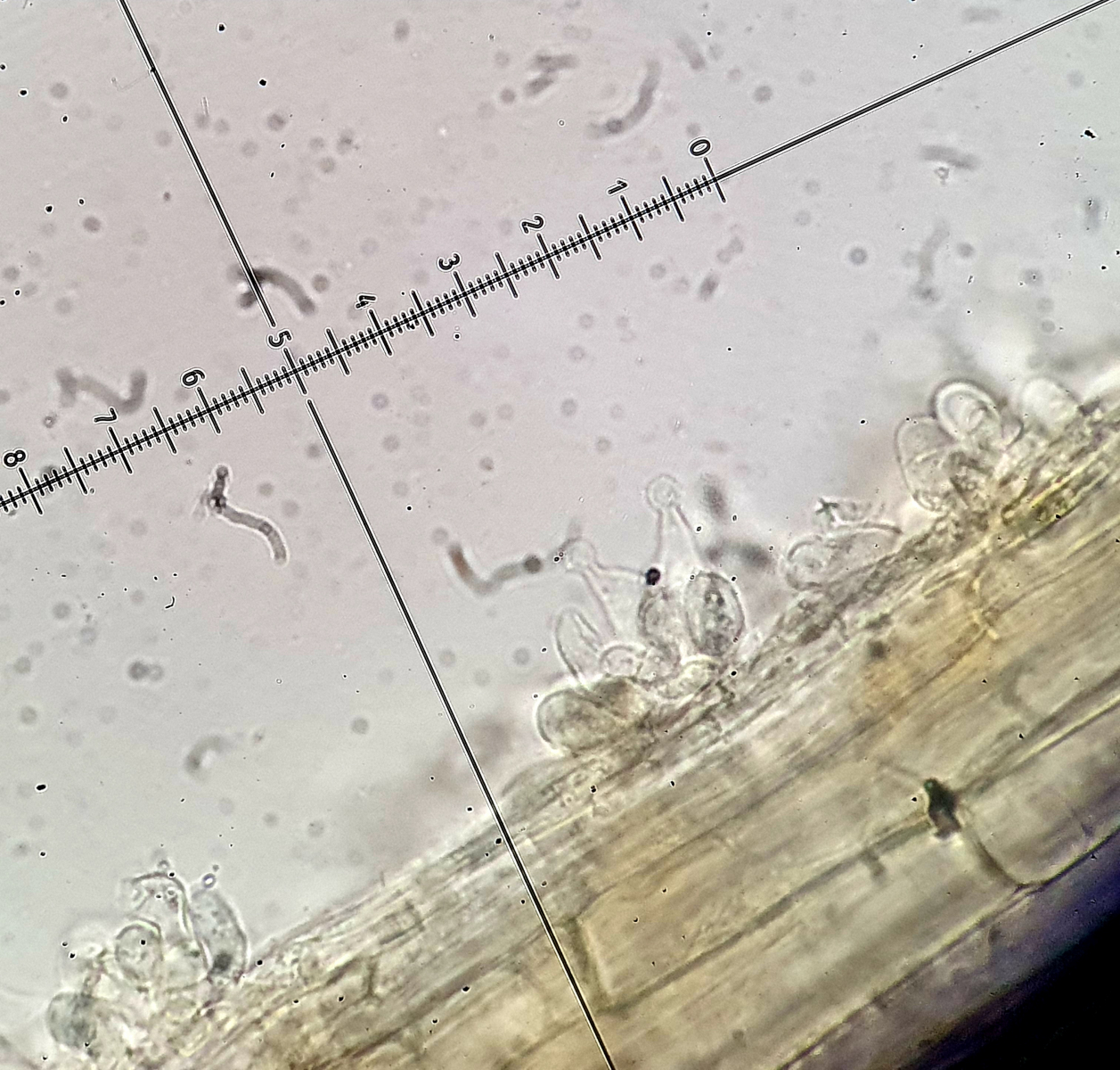 Cheilos und Kaulozystiden lecythiform (siehe ebenfalls Bilder), Kopf wenige µm, Körper etwa 7µm