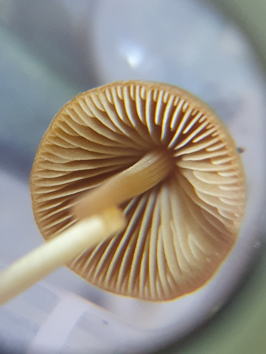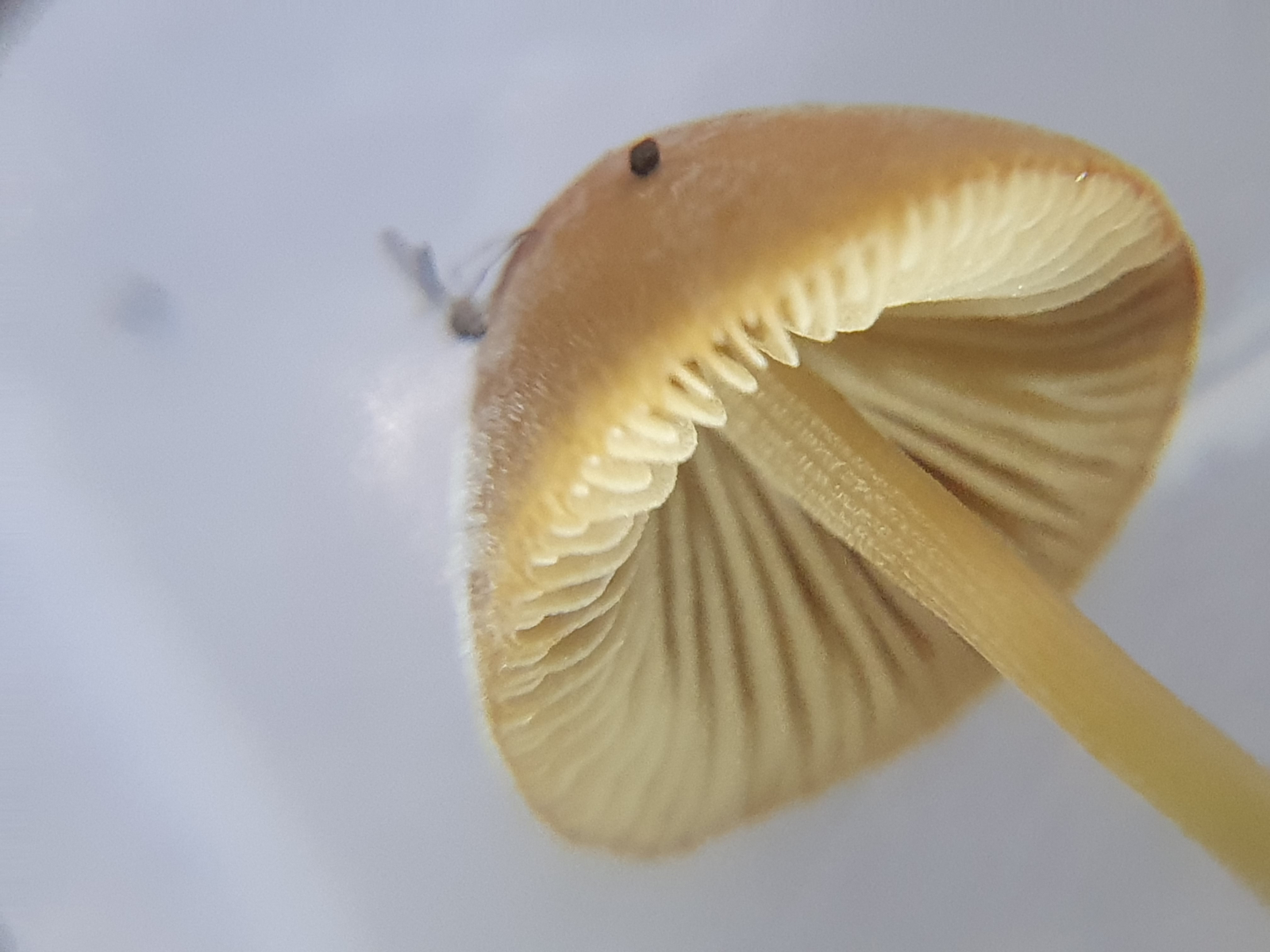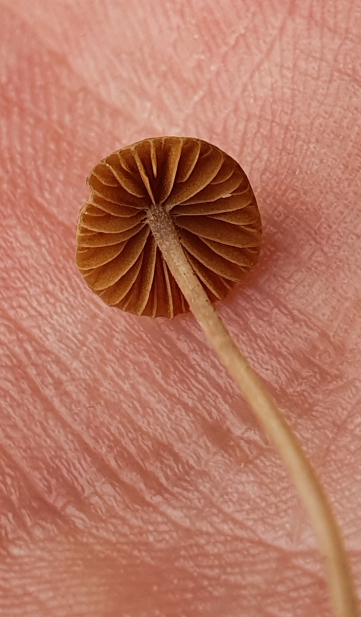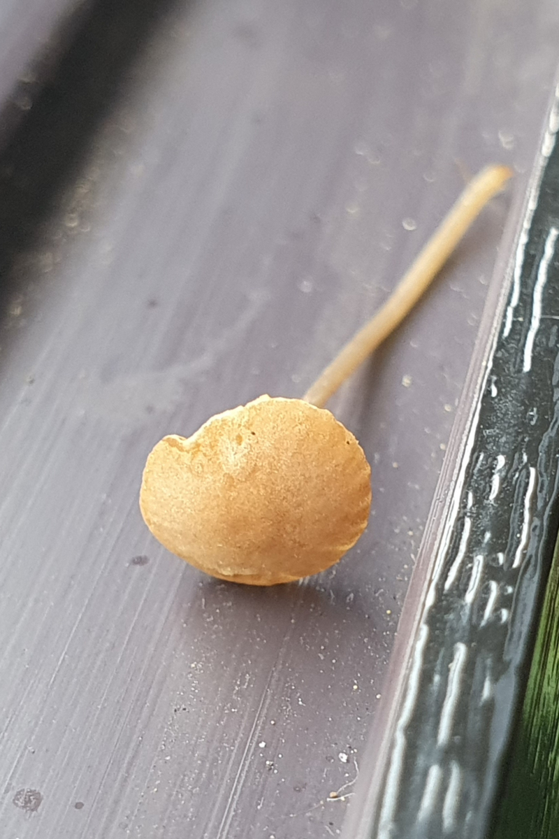Sehr kleiner Fruchtkörper (0,5cm) , blass, milchkaffeeartig, eher nicht gerieft.