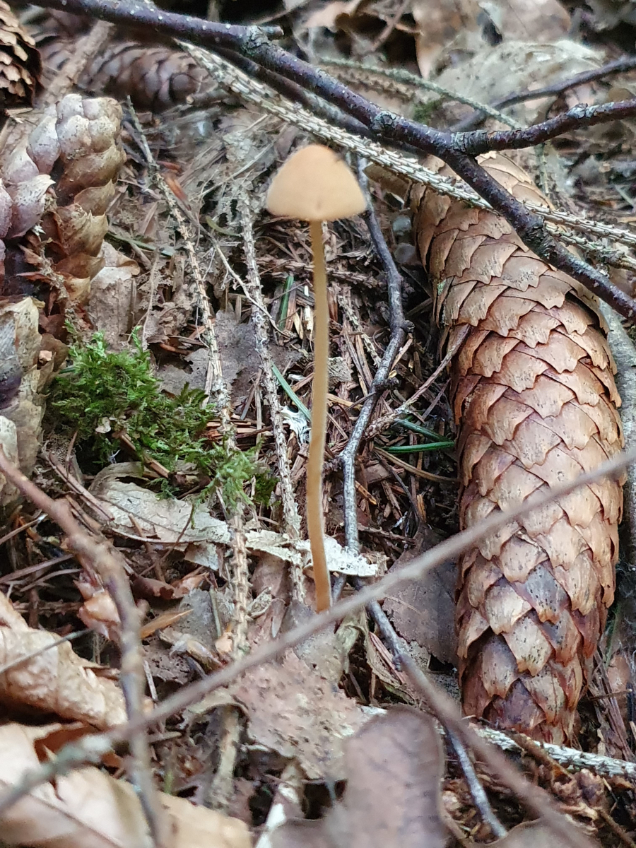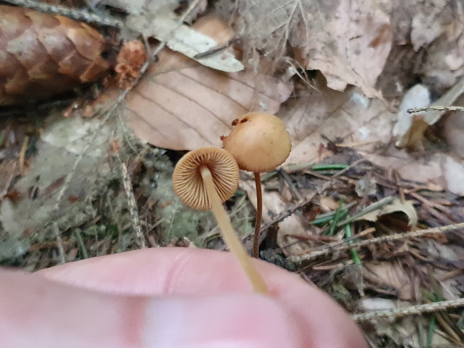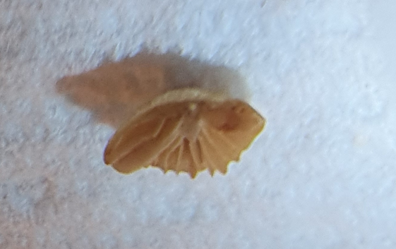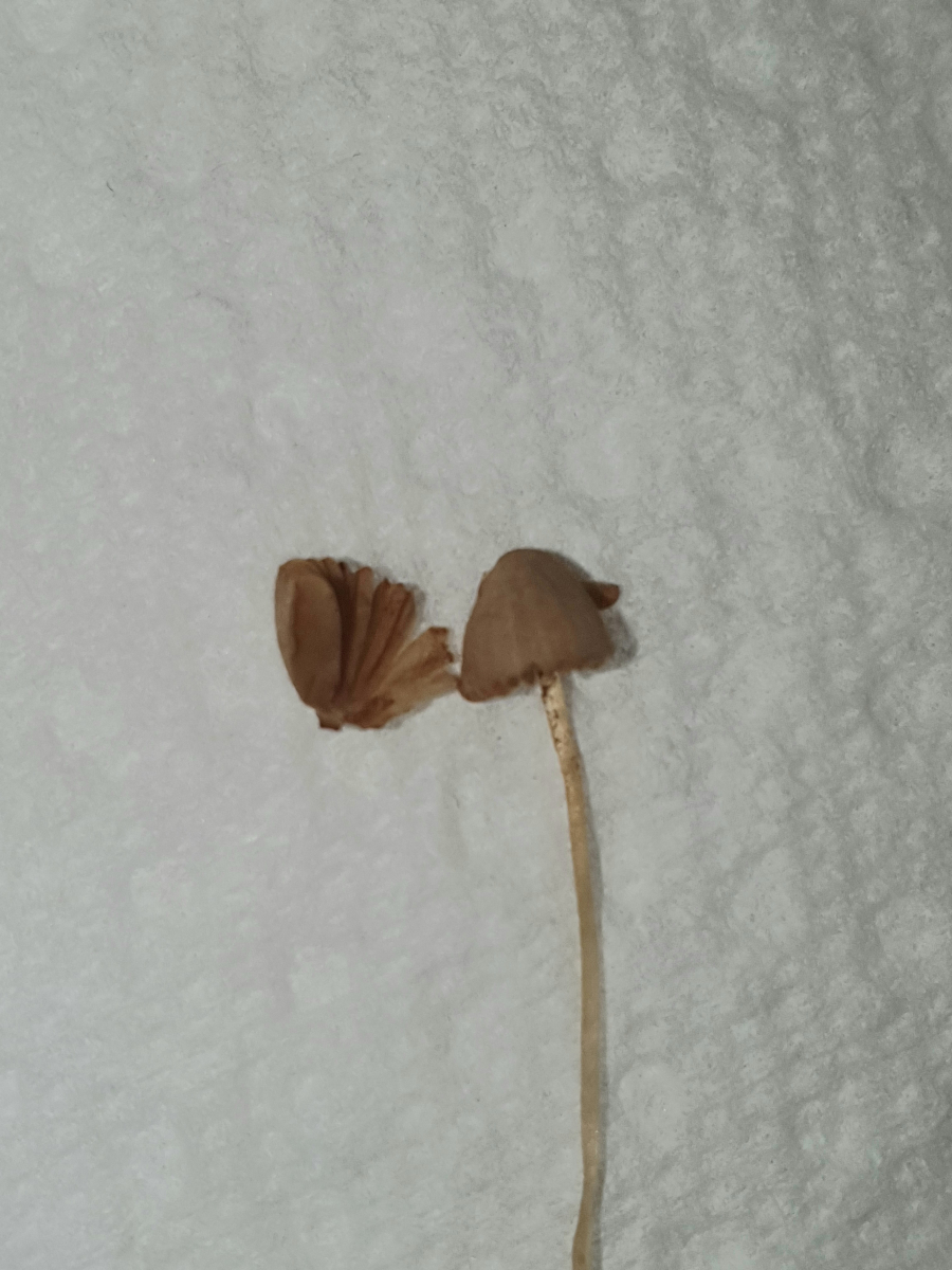 Sehr kleiner Fruchtkörper (0,5cm) , blass, milchkaffeeartig, eher nicht gerieft.