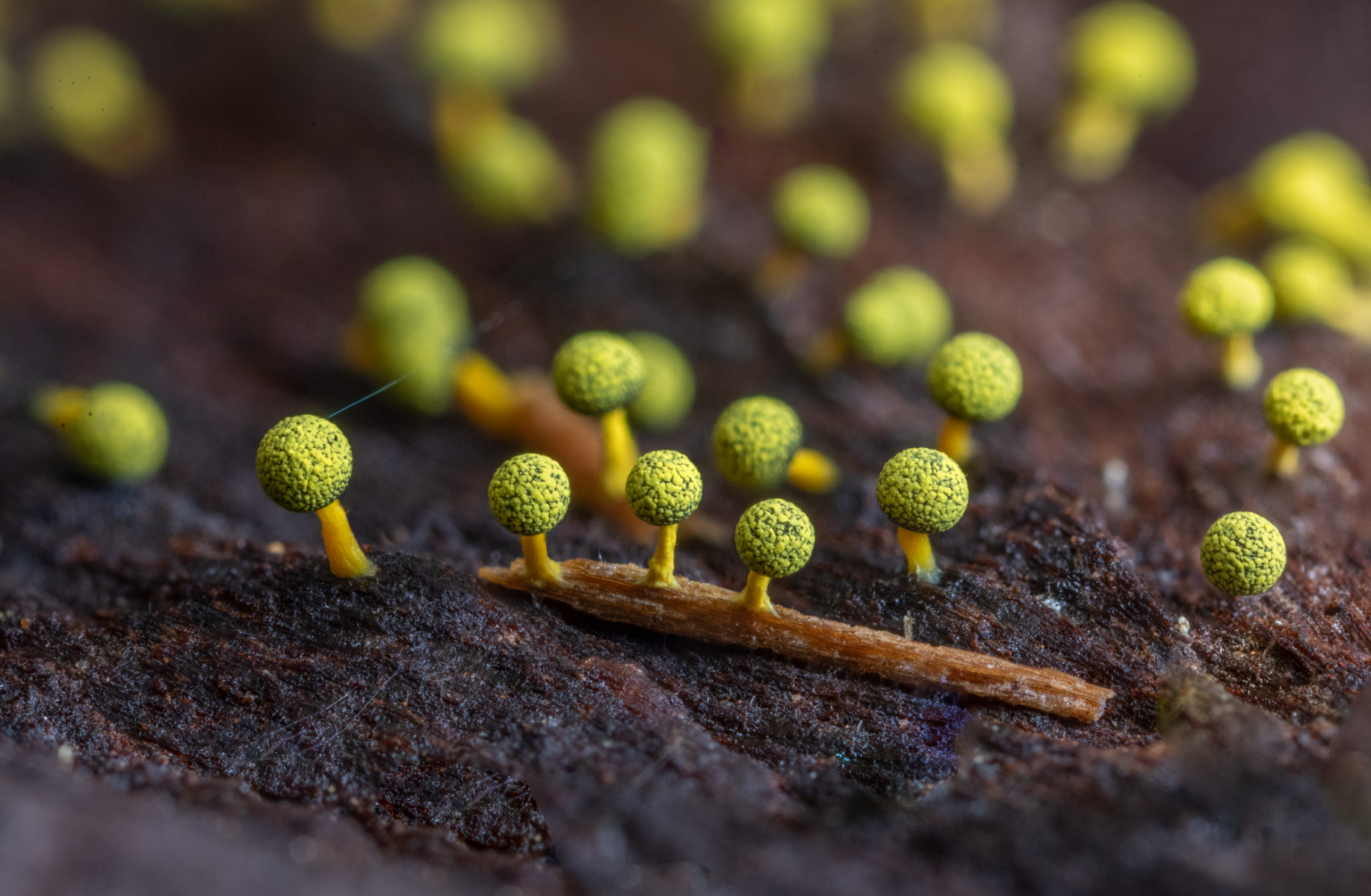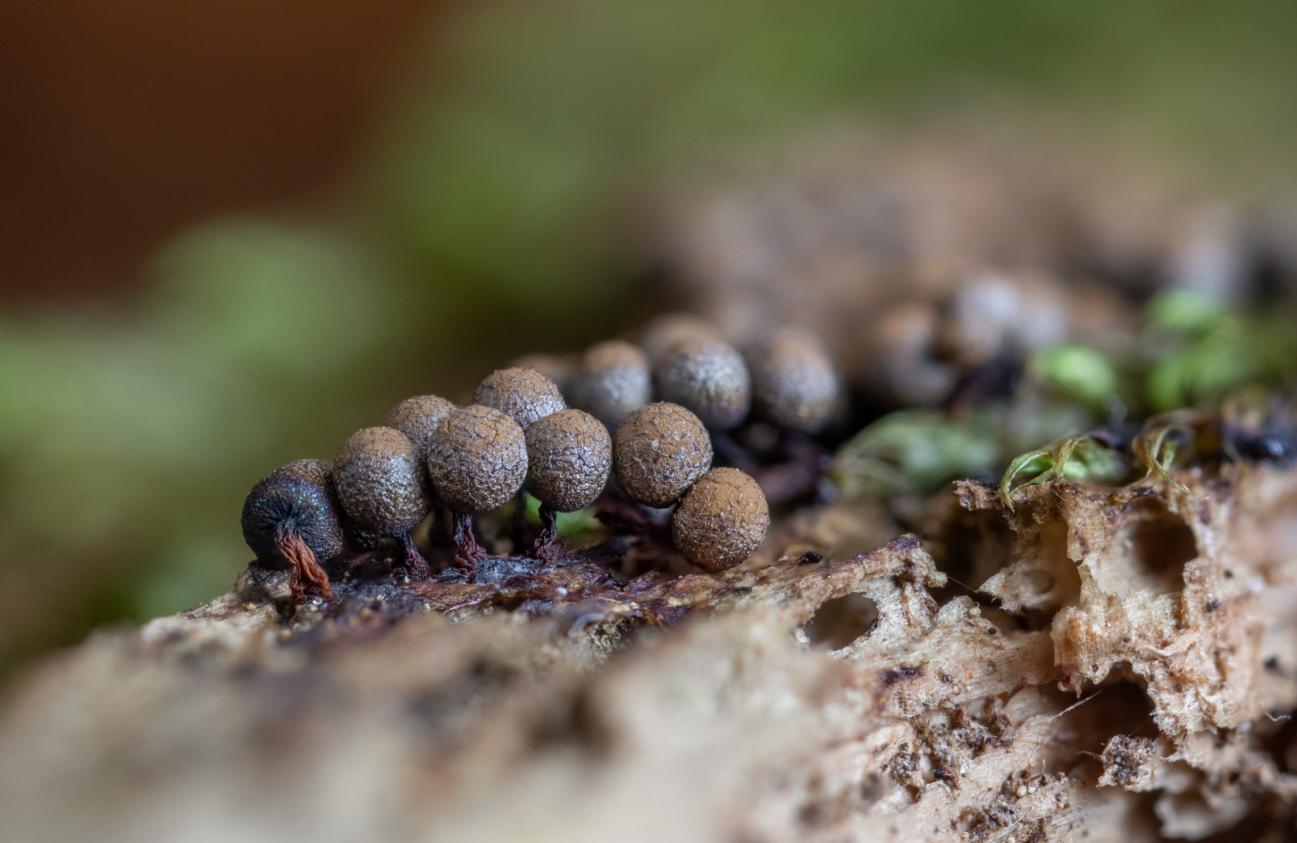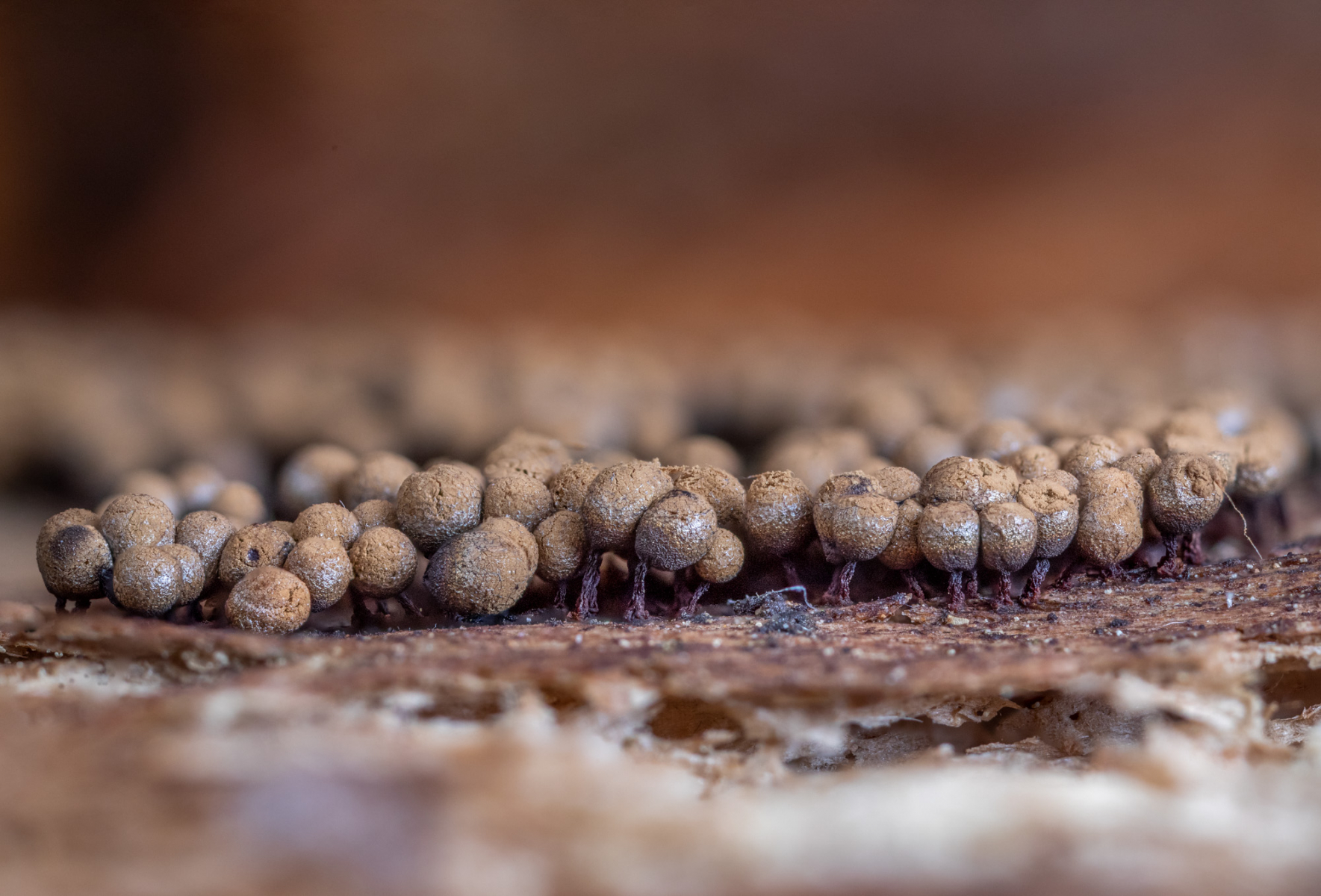 Cribraria argillacea wächst vorwiegend an Nadelholz, die Fruchtkörper sind immer dichtgedrängt und man sieht die Stiele oft kaum.