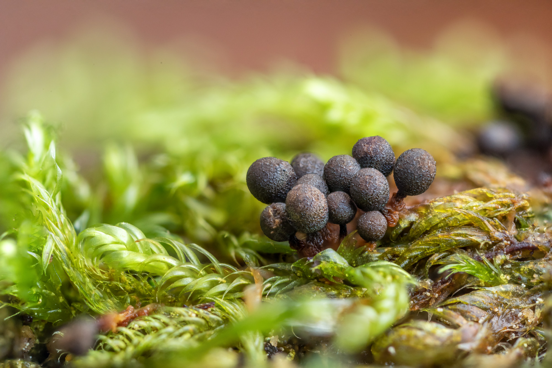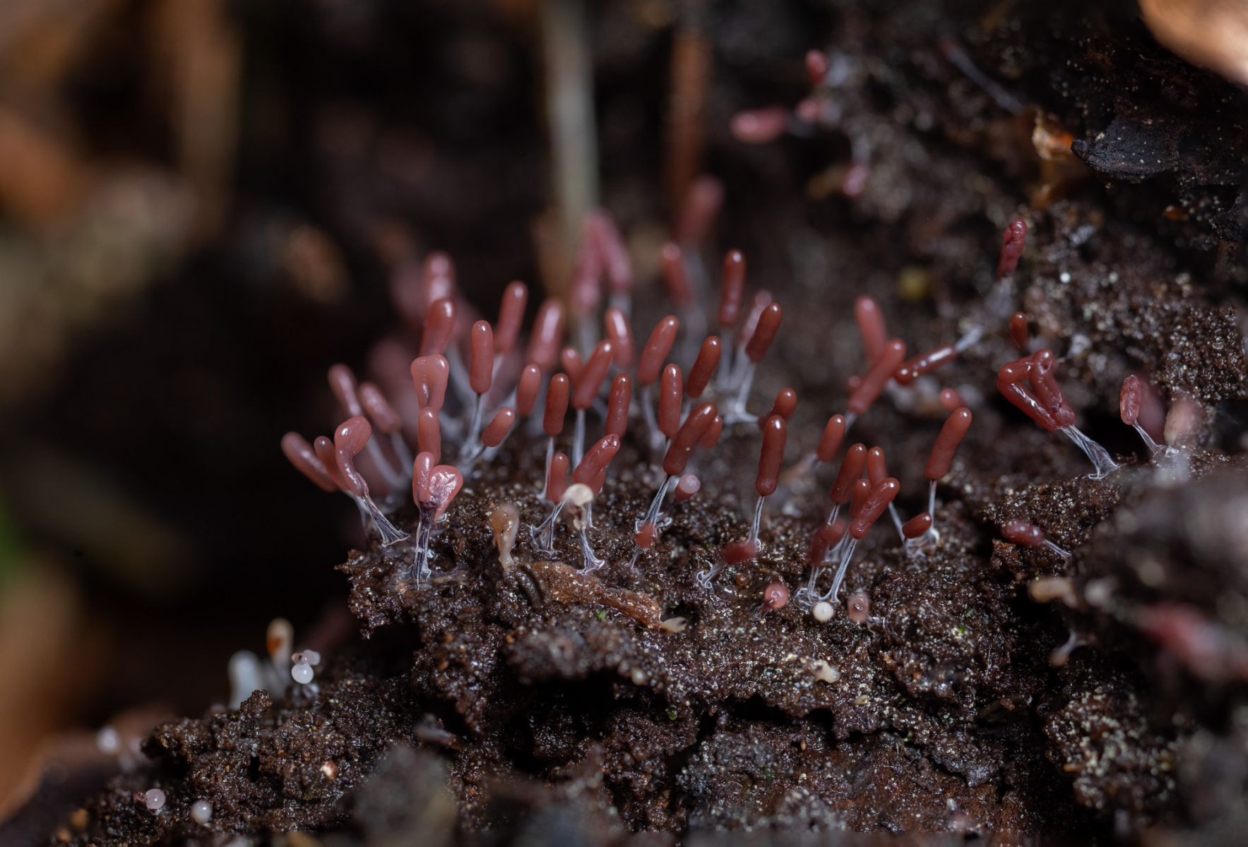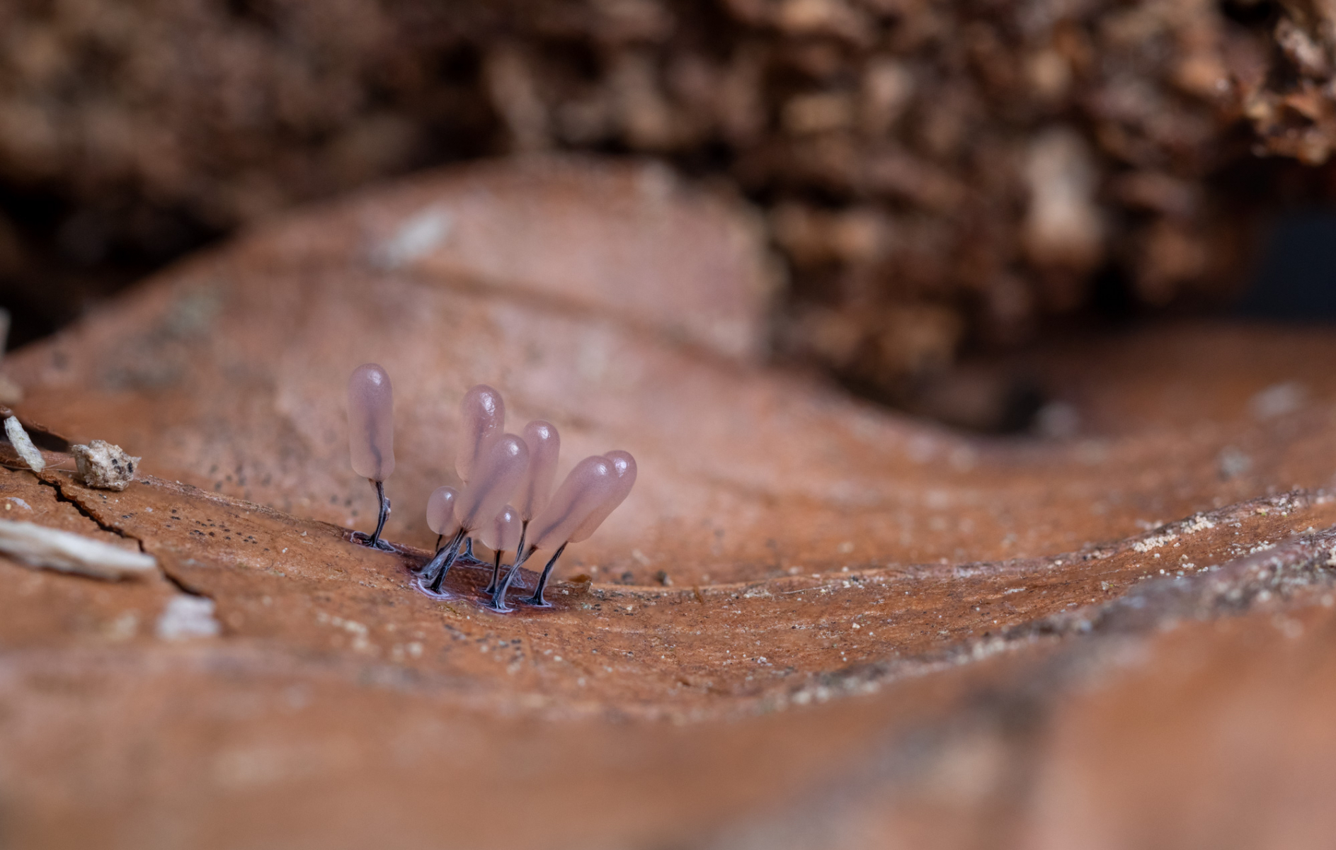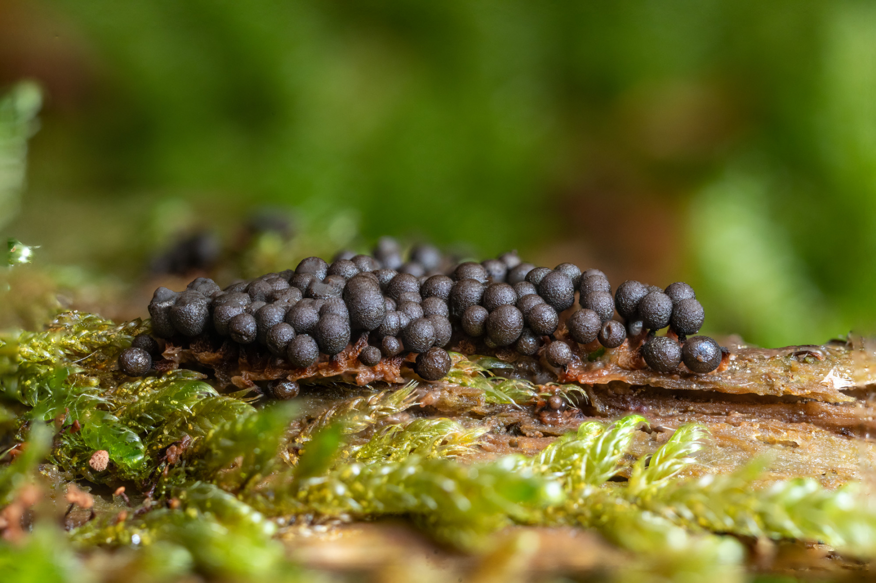 Cribraria argillacea wächst vorwiegend an Nadelholz, die Fruchtkörper sind immer dichtgedrängt und man sieht die Stiele oft kaum.