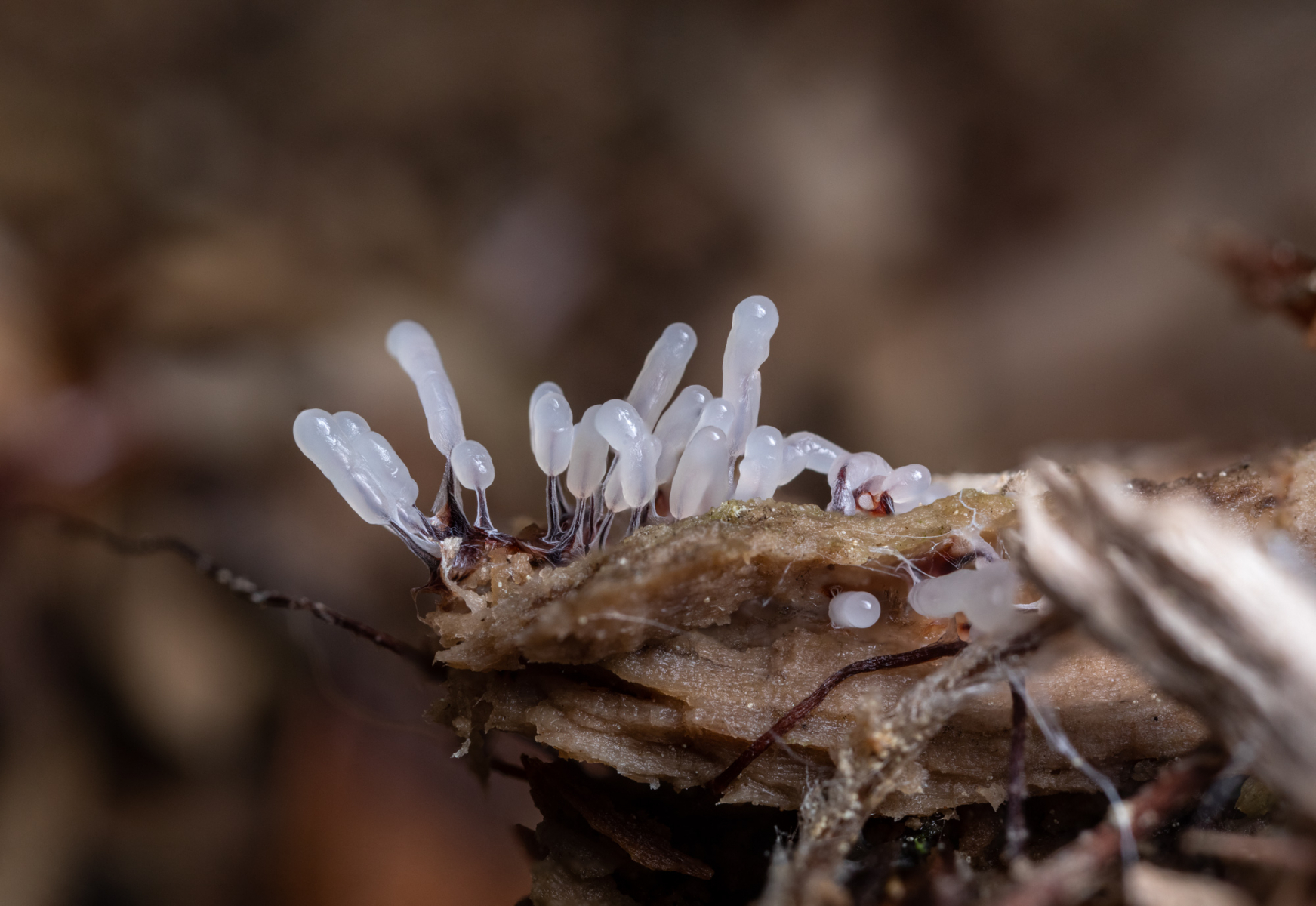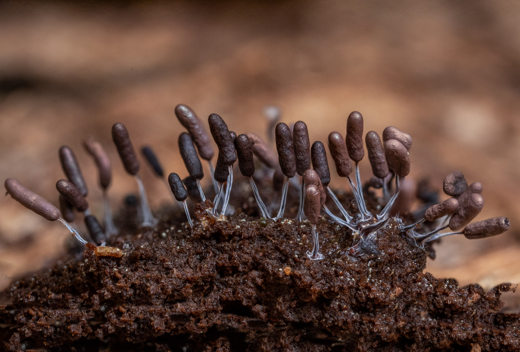 Stemonitopsis typhina ist leicht zu erkennen durch die silbrig überzogenen Stiele.