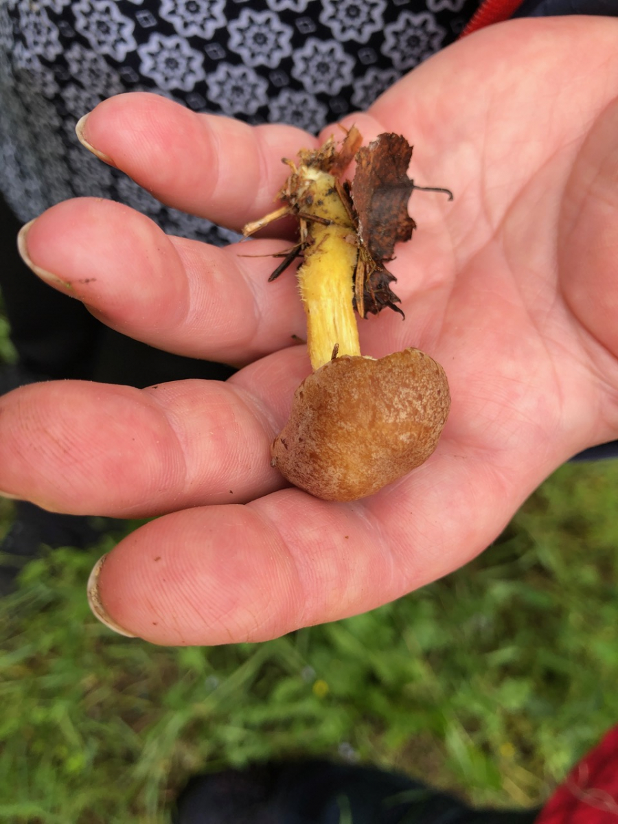 Dann tauchte dieser hier auf. Das einzige was uns einfiel war der Olivgelbe Holzritterling, aber mir gefällt die Hutfarbe nicht. Nur, was soll es sonst sein. Grünling passt auch nicht, Schwefelritterling nicht.