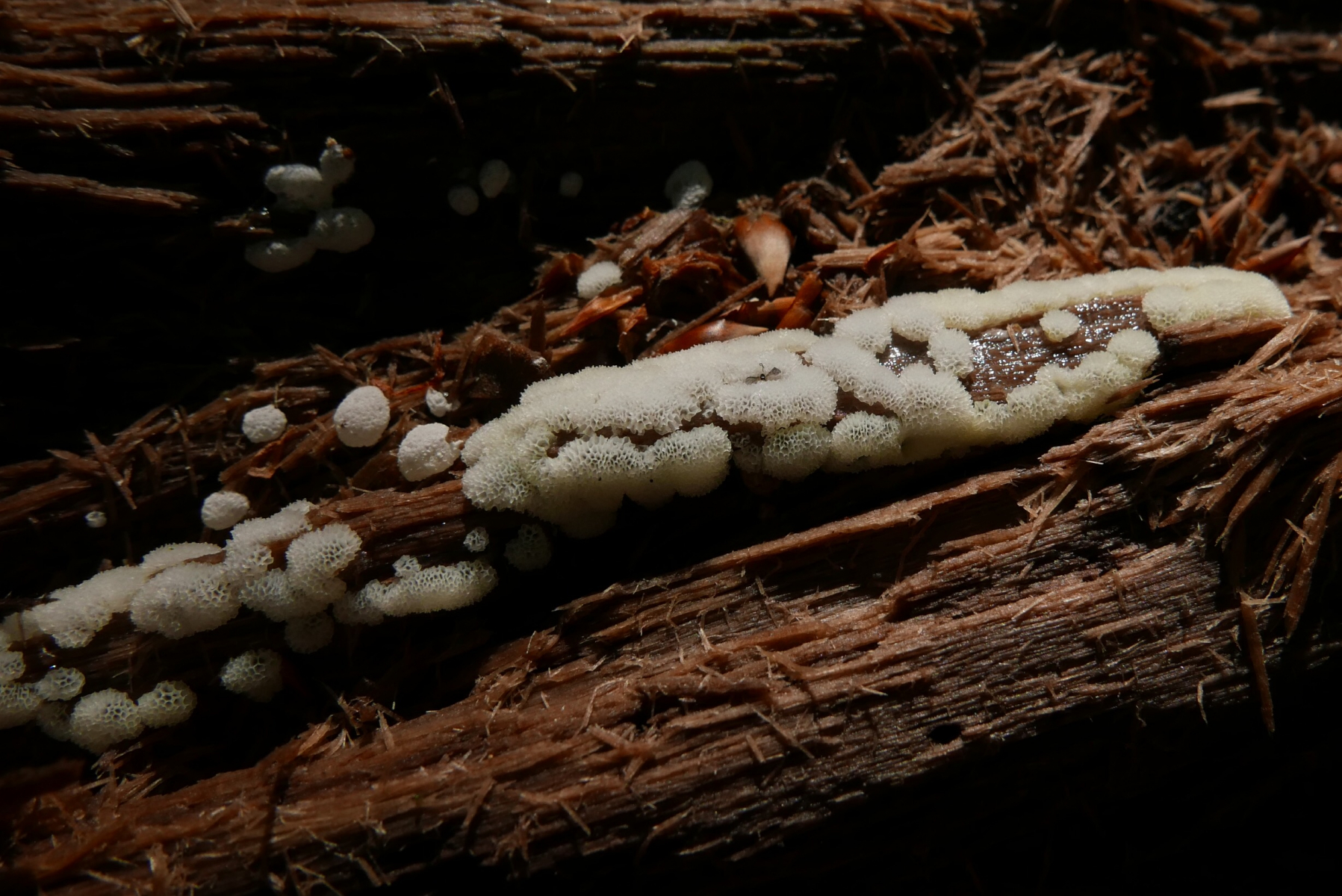 Ceratiomyxa poroides - wird auch als Varietät von Ceratiomyxa fruticulosa geführt. Ich bin bei den Schleimern nicht so tief drin, meine mich aber zu erinnern, dass der Artrang wieder aktuell sei. Ich finde fast nur die normale C. fruuticulosa.