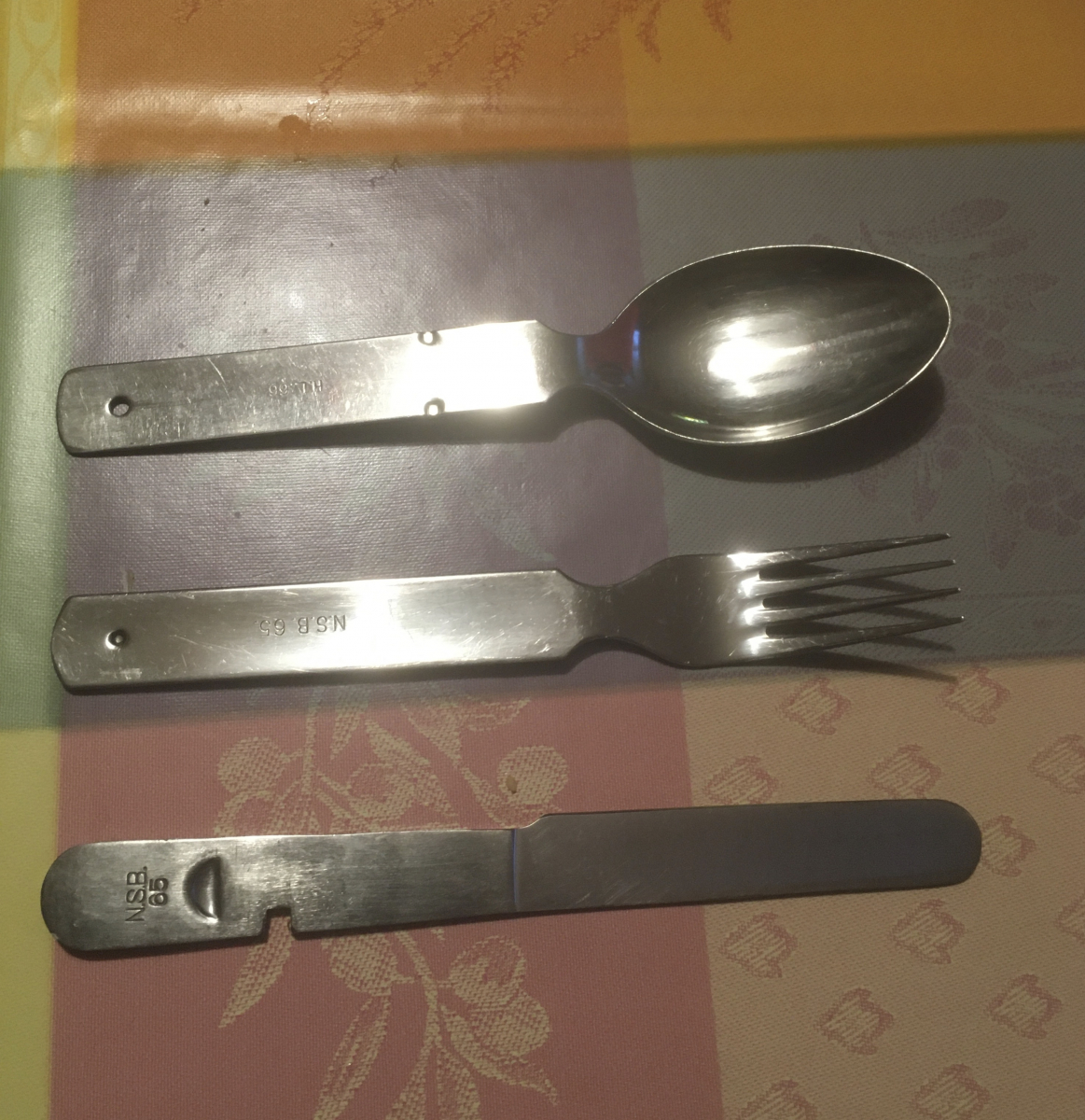 Die einzigen beiden (Handy-)Fotos, die ich in der Zeit gemacht habe, zeigen meine Wade mit Zecke nach dem Waldspaziergang und das nun wieder sauber glänzende Bundeswehrbesteck, das ich verrostet und voller Erde im Wald fand...Archäologie für Anfänger! :gzwinkern: