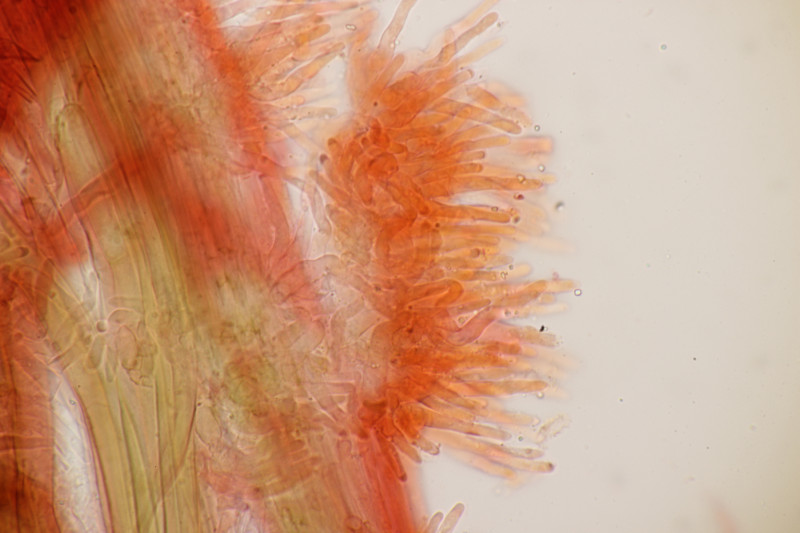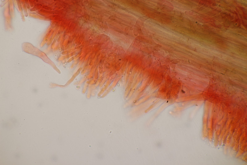 8. Eine Coltricia. Begleitbäume waren Laubbäume, wobei aber ein versteckter Nadelbaum sicher nicht auszuschließen ist. Das gezeigte Exemplar wuchs zwar einzeln, daneben gab es aber eine größere Gruppe von verwachsenen Fruchtkörpern. Die verwachsenen Fruchtkörper waren dann auch nicht so ausgeprägt gezont. Sporengröße (7.8+-0.3) µm x (4.7+-0.4) µm, Q=1.7+-0.2. Das würde erstmal Richtung C. confluens statt C. perennis deuten. Was meinen die Experten? Tomentella