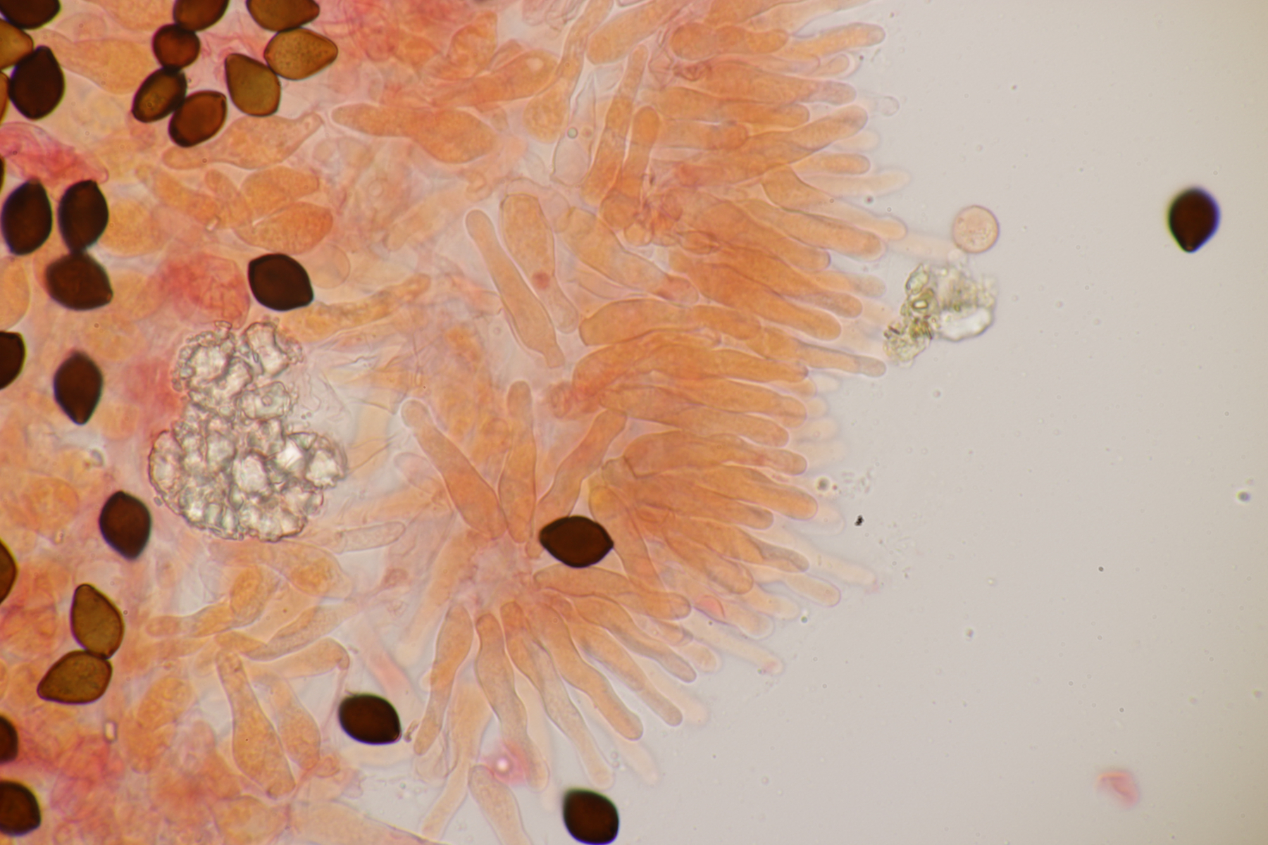 8. Eine Coltricia. Begleitbäume waren Laubbäume, wobei aber ein versteckter Nadelbaum sicher nicht auszuschließen ist. Das gezeigte Exemplar wuchs zwar einzeln, daneben gab es aber eine größere Gruppe von verwachsenen Fruchtkörpern. Die verwachsenen Fruchtkörper waren dann auch nicht so ausgeprägt gezont. Sporengröße (7.8+-0.3) µm x (4.7+-0.4) µm, Q=1.7+-0.2. Das würde erstmal Richtung C. confluens statt C. perennis deuten. Was meinen die Experten? Tomentella