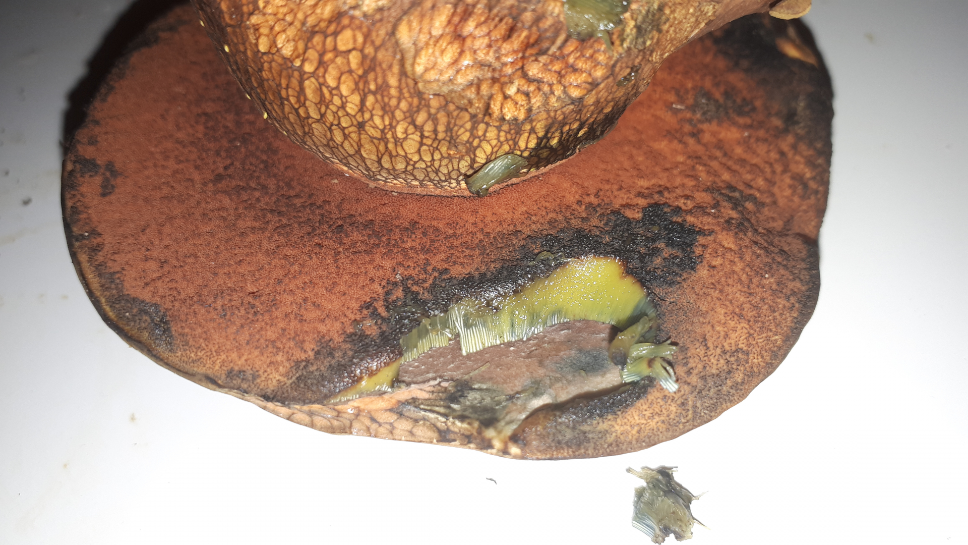 Mir kommt er insgesamt recht dunkel vor. Auch die Poren sind dunkelweinrot. Der Porengrund ist gelb wohingegen das Hutfleisch mehr dunkelocker ist... Auch das Netz ist stellenweise schön schwärzlich. Liegt es daran, dass er neben der Straße wächst?