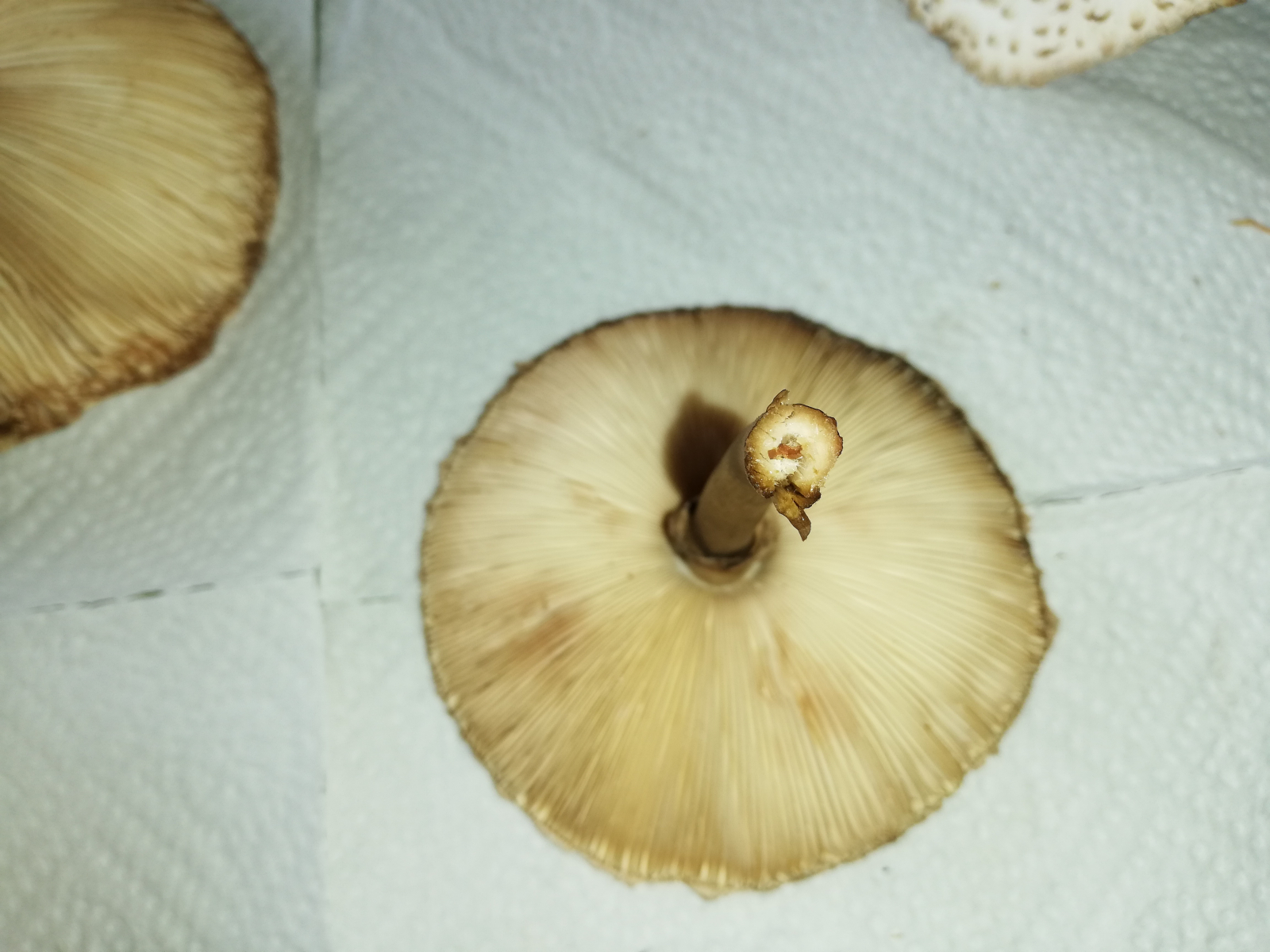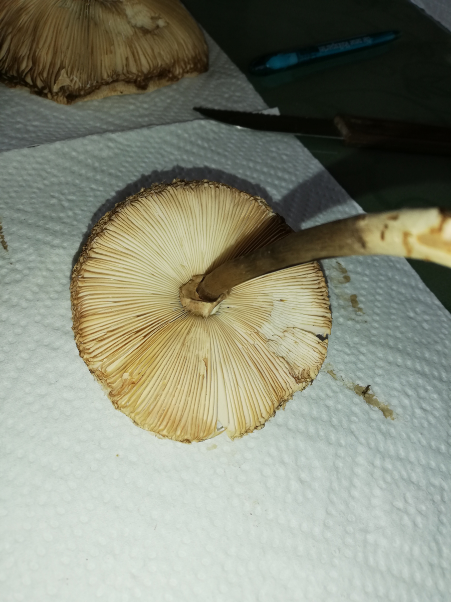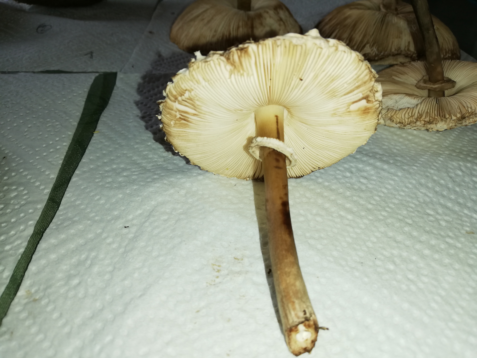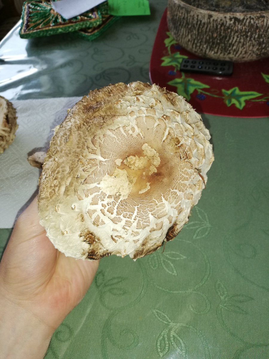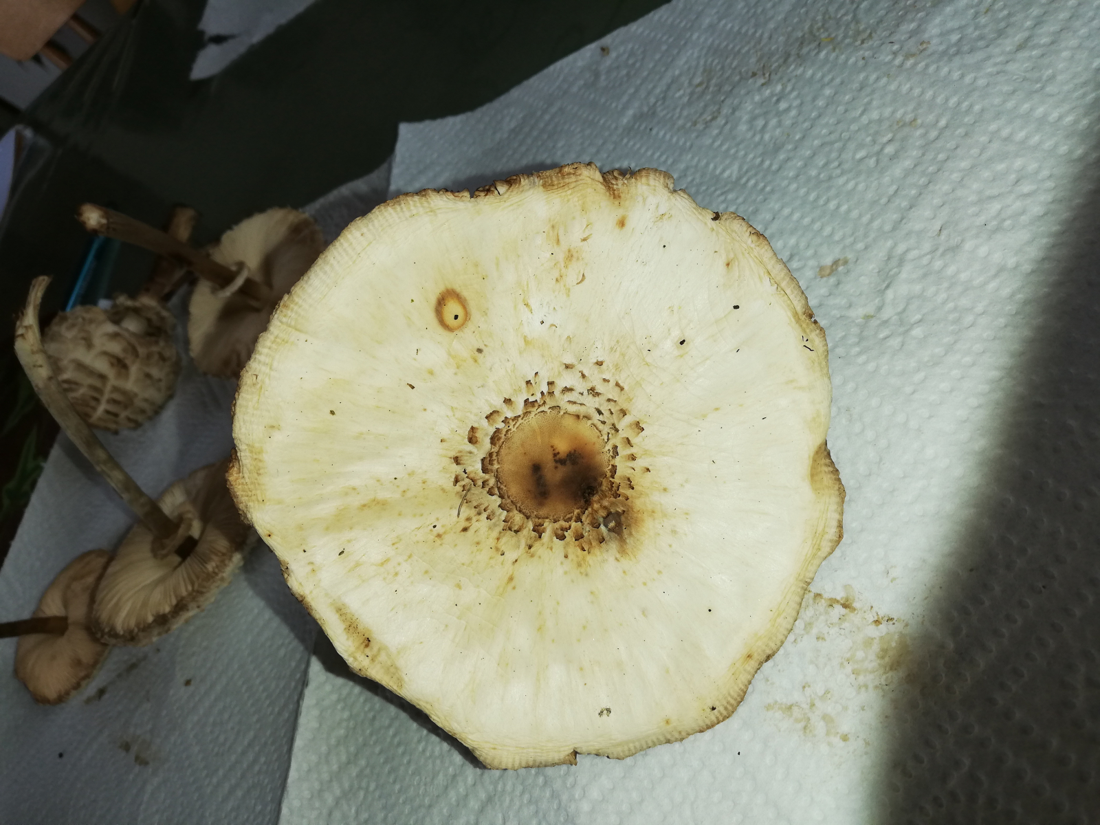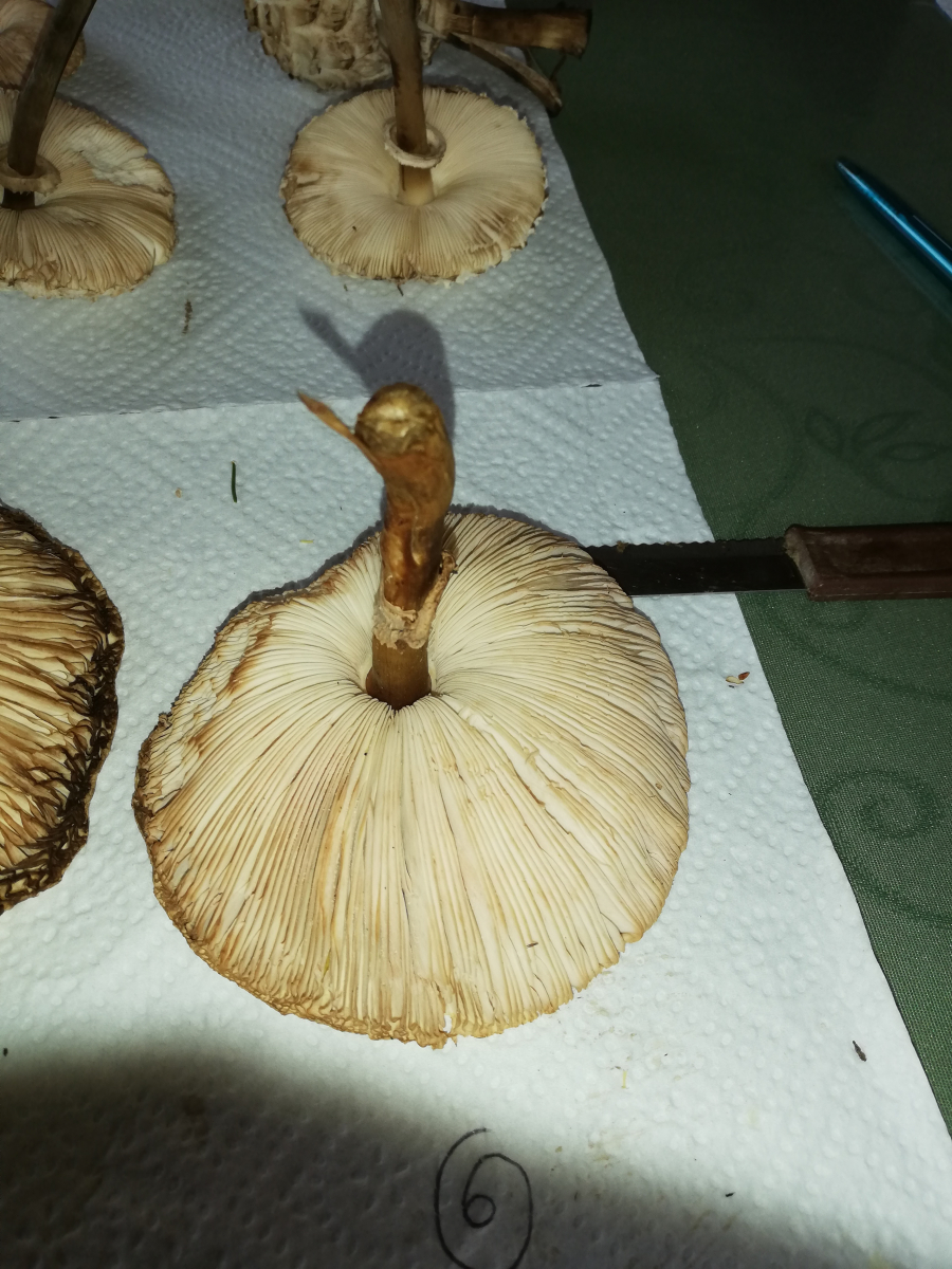 ich war heute im Wald und habe 14 Stück Pilze gefunden. Zuerst dachte ich, das sind alles Parasole. Allerdings ist mir dann aufgefallen, dass kein einziger Stiel die typische Natterung aufweist. Die Ringe sind alle verschiebbar, manche aber erst nach etwas "Bearbeitung".