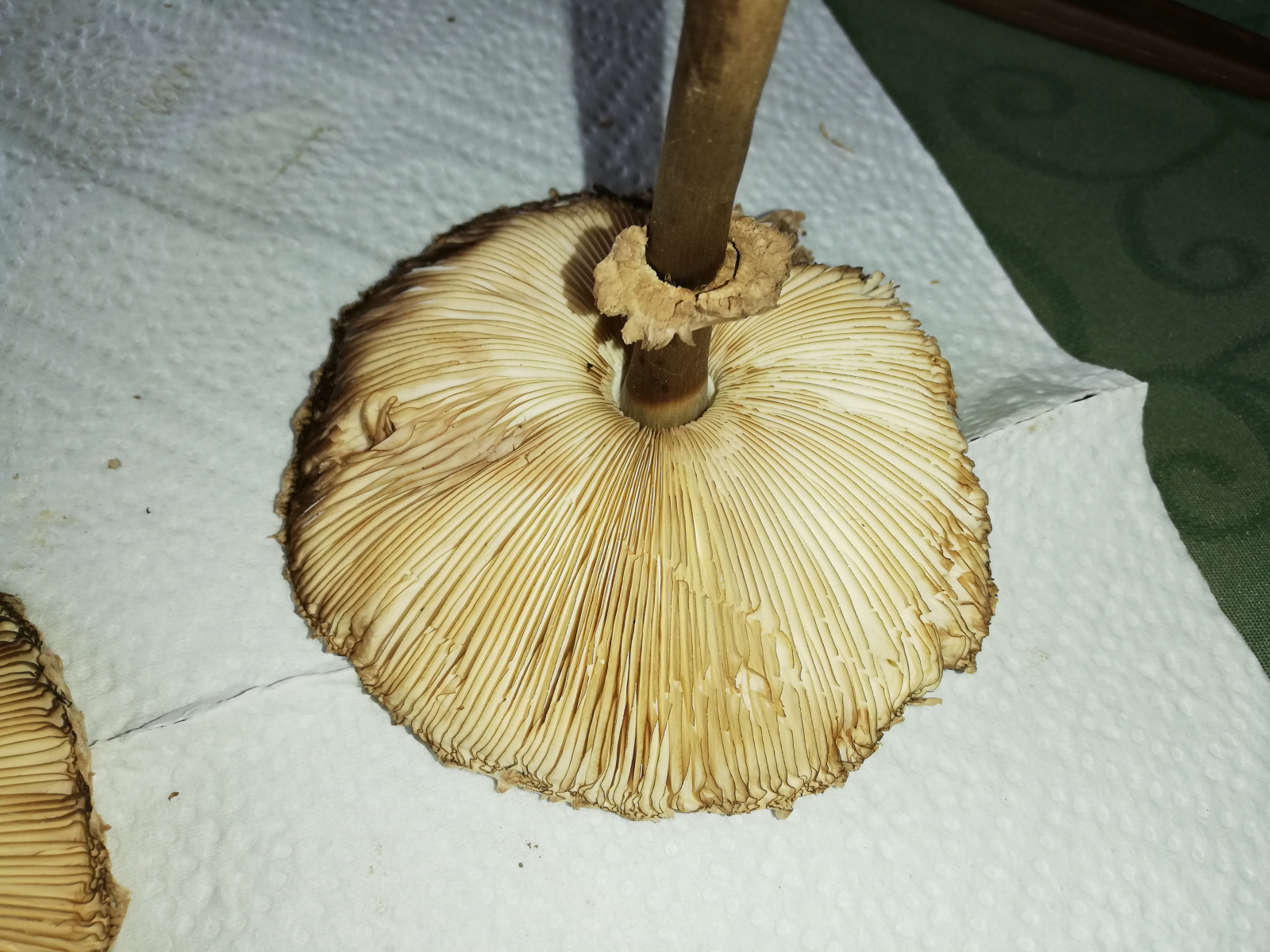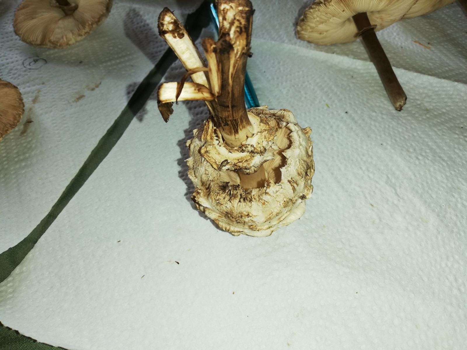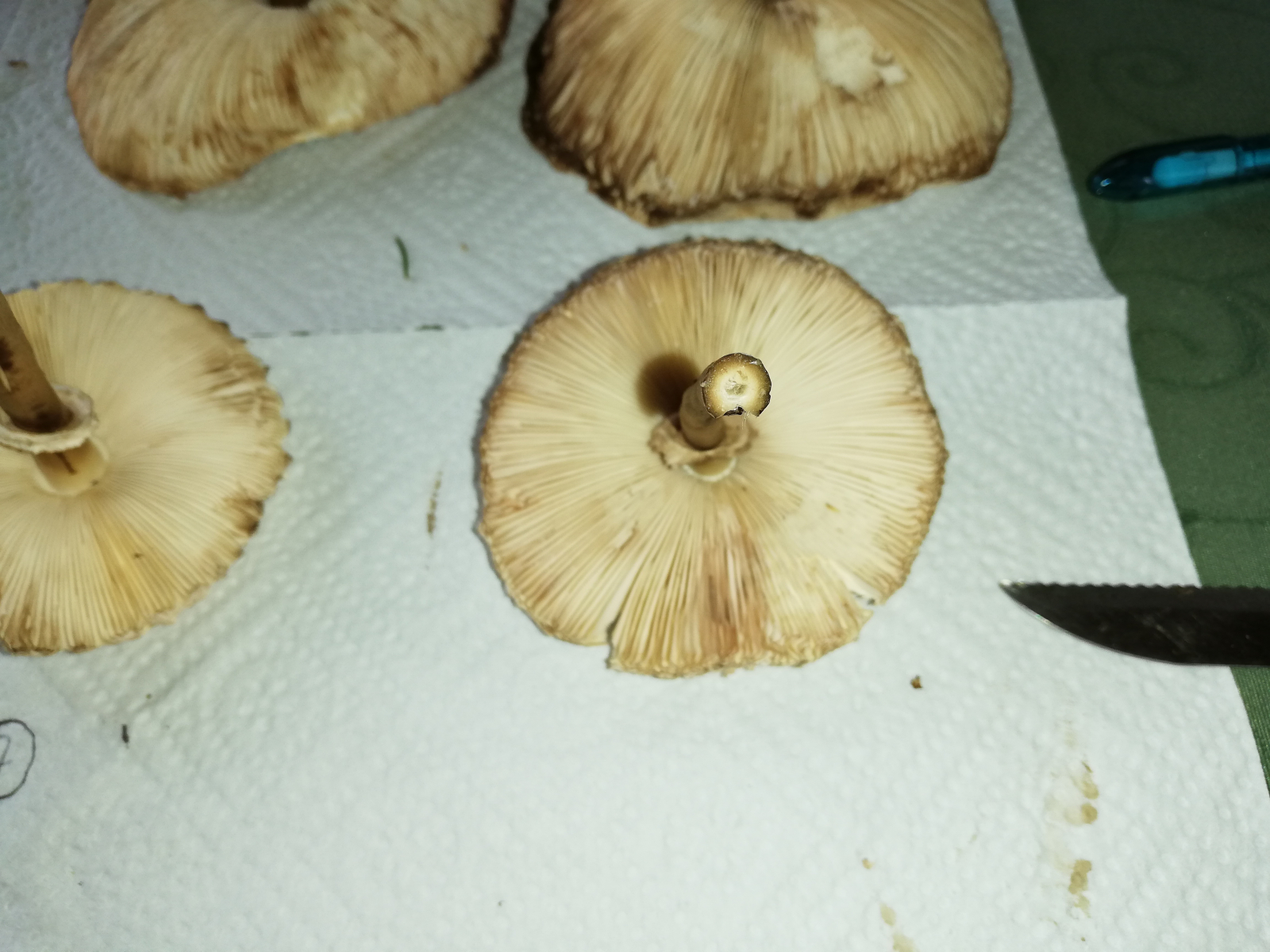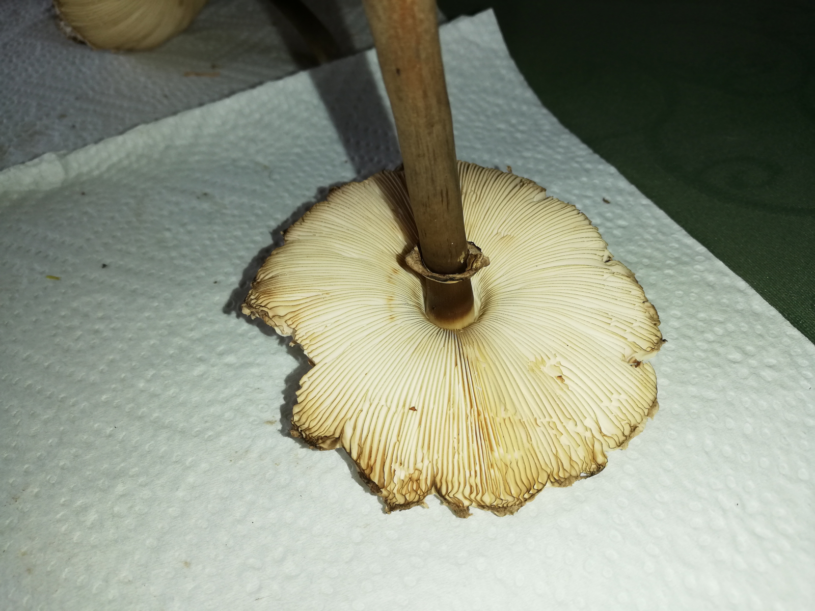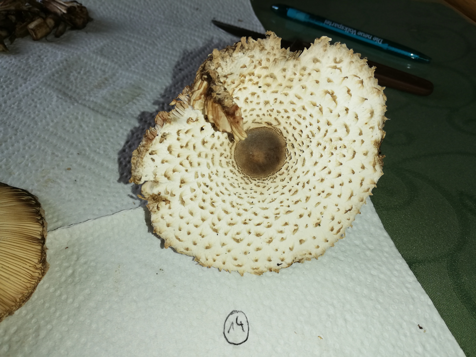 ich war heute im Wald und habe 14 Stück Pilze gefunden. Zuerst dachte ich, das sind alles Parasole. Allerdings ist mir dann aufgefallen, dass kein einziger Stiel die typische Natterung aufweist. Die Ringe sind alle verschiebbar, manche aber erst nach etwas "Bearbeitung".