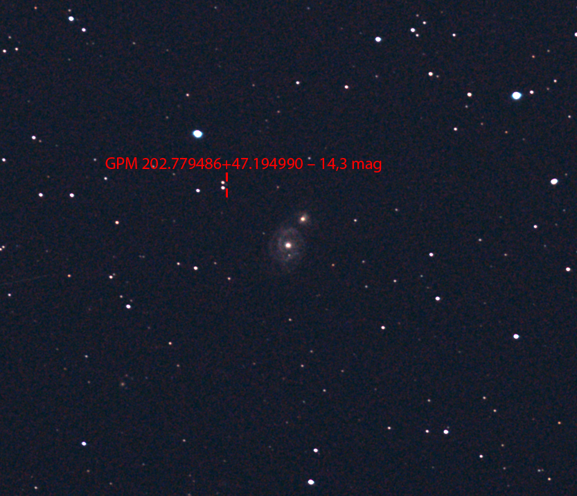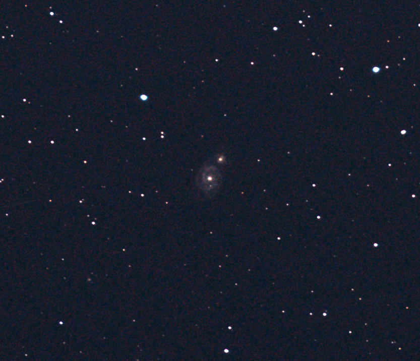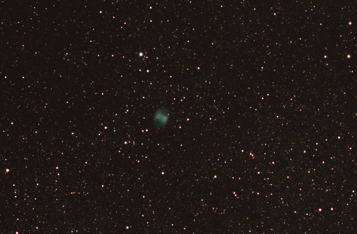 Wer den Hantelnebel selber sehen will - er ist im Sternbild Vulpecula (die kleine Füchsin, wenn man es übersetzt) - und im Fernglas schon als kleinner Fleck zu sehen. Die schwächsten Sterne auf dem Foto sind knapp über der 13. Größenklasse (für die, die das verstehen/nachvollziehen). Bei so schwachen Sternen gibt es wenig Angaben zur visuellen Helligkeit, sondern nur auf gewisse Frequenzbänder bezogen. Jedenfalls müsste der kleine Stern in der Mitte des Nebels nicht der Zentralstern sein, denn der hat nur 14. Größenklasse (Weißer Zwerg, weit entfernt, Oberflächentemperatur mit 100.000 Grad viel viel heißer als die Sonne, aber eben klein und sehr weit weg). Der Stern in der Mitte steht näher uns (scheinbare Helligkeit von 11,75 mag).