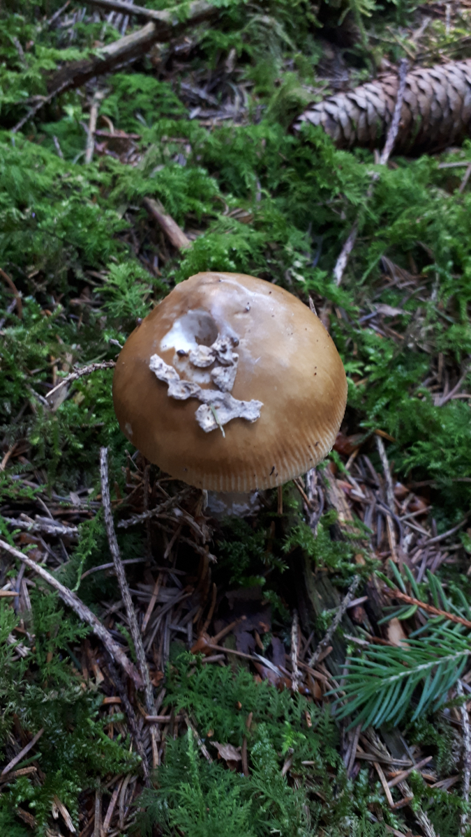 Velumreste an Hut, Hutfarbe ocker-grün gefärbt. Fundort Fichtenwald mit zerstreuten Laubbäumen.