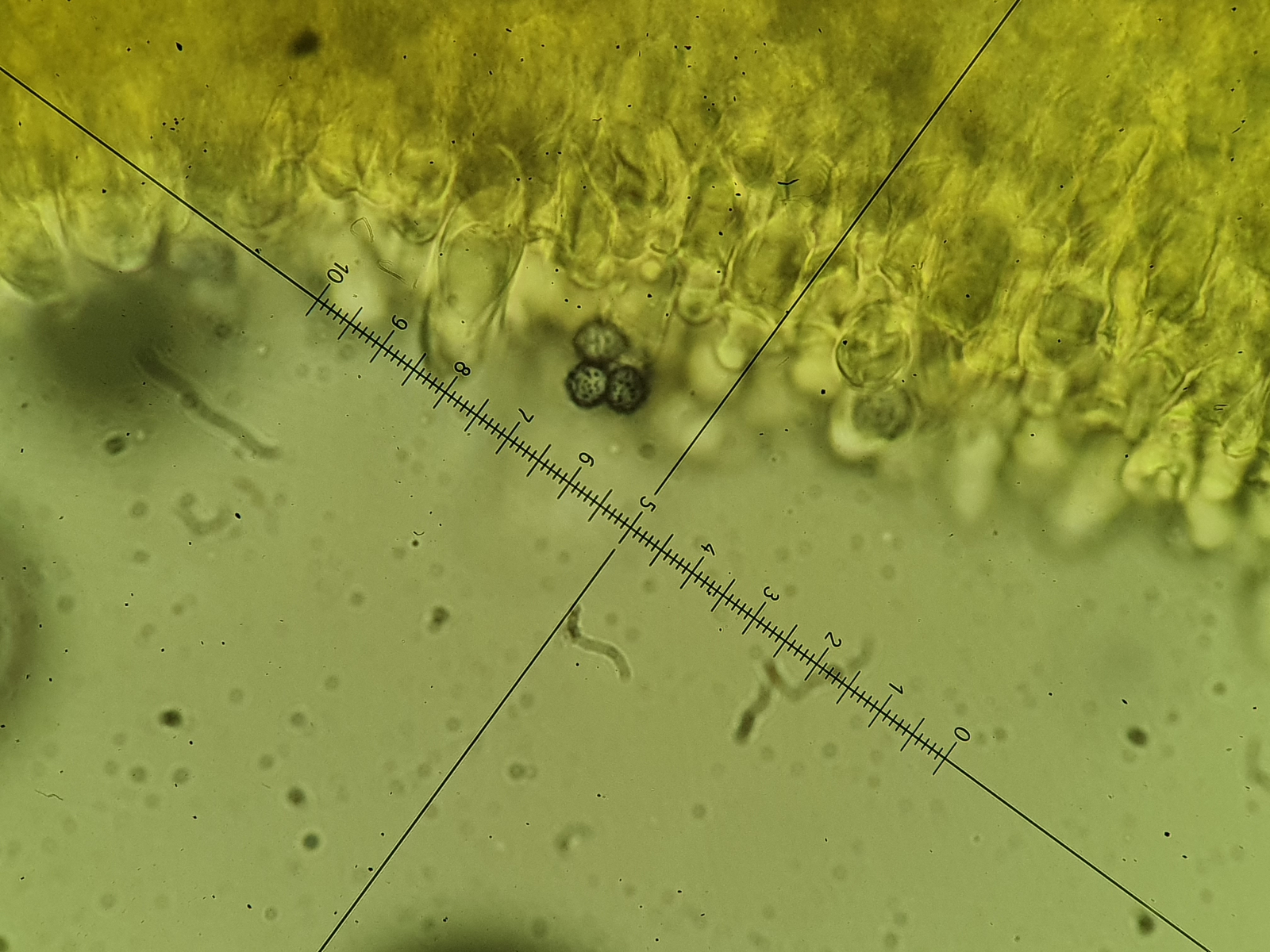 Sporen amyloid, klein 5-6x5µm weitestgehend isoliertwarzig, an manchen Sporen Verbindungen zu sehen. Leider in der Summe nur wenige Sporen zu finden.