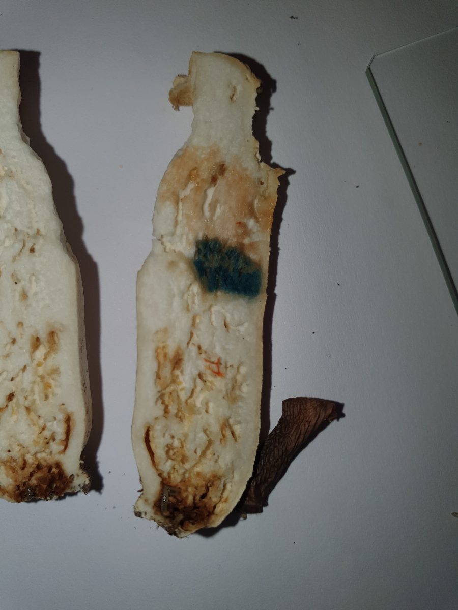 Auffallend noch der rosalich überhauchte Stiel (nicht reinweiß), fest, gekammert (siehe Bild). Gujakreaktion nach einigen Sekunden typisch grünlich, Eisensulfat wenig auffällig.