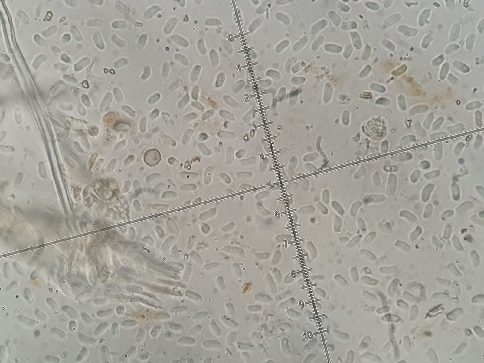Auch die Sporen scheinen zumindest nicht ganz passend. Sie zeigen sich stark variabel, durchaus häufiger mit Maßen bis 6x2µm. Das wäre eigentlich zu lang und dabei gleichzeitig zu schmal. In Fungi of temperate Europe sind die Maße mit 4-5x3 angegeben. Es finden sich allerdings auch kleine Sporen, aber eher nicht breiter als 2µm (siehe auch Bilder).