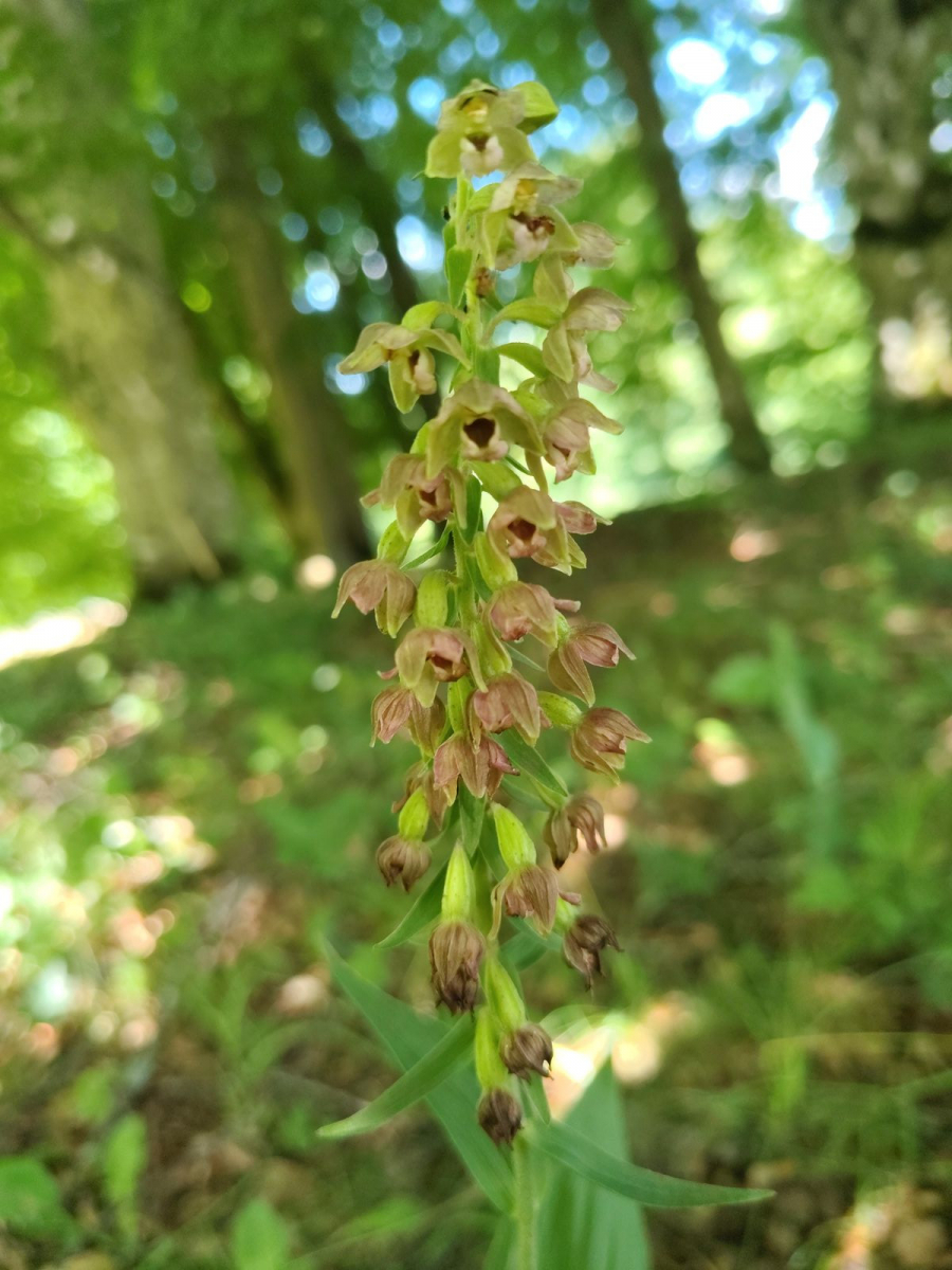 Das Pflänzlein war einen knappen halben Meter hoch und hatte untenrum breite Blätter: ------------------------> Epipactis helleborine, die Breitblättrige Stendelwurz ? :