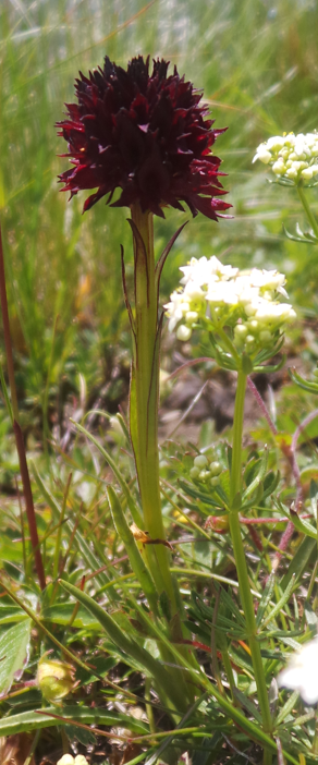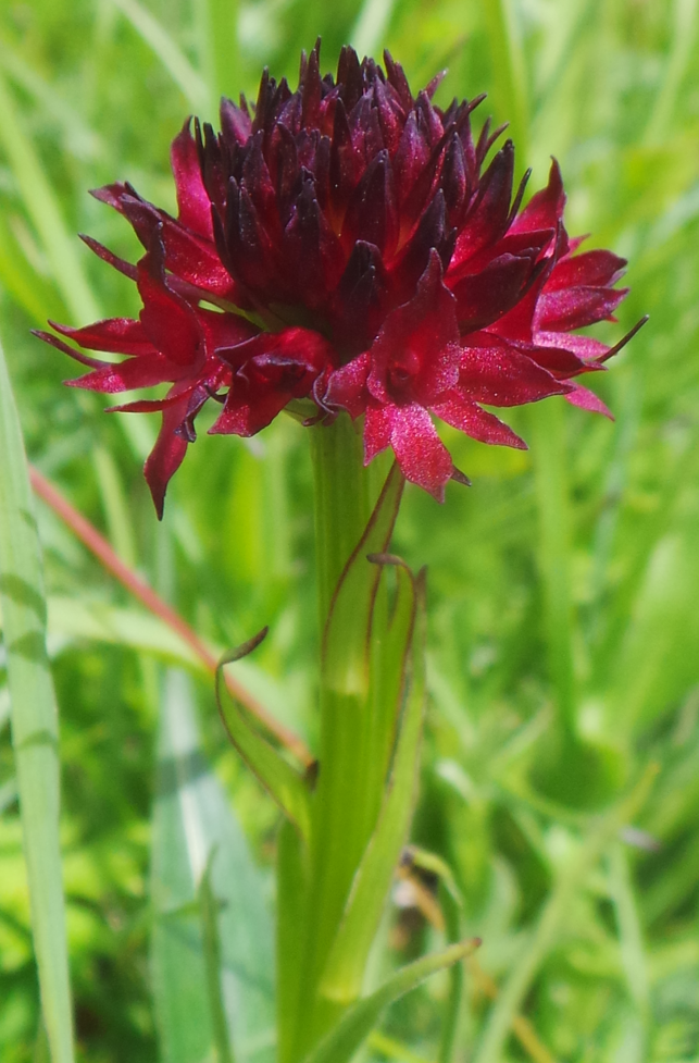 Das Schwarze Kohlröschen, oder das Gemeine Kohlröschen, Nigritella nigra subsp. rhellicani, Gymnadenia rhellicani, je nach Vorliebe der Benamsung: