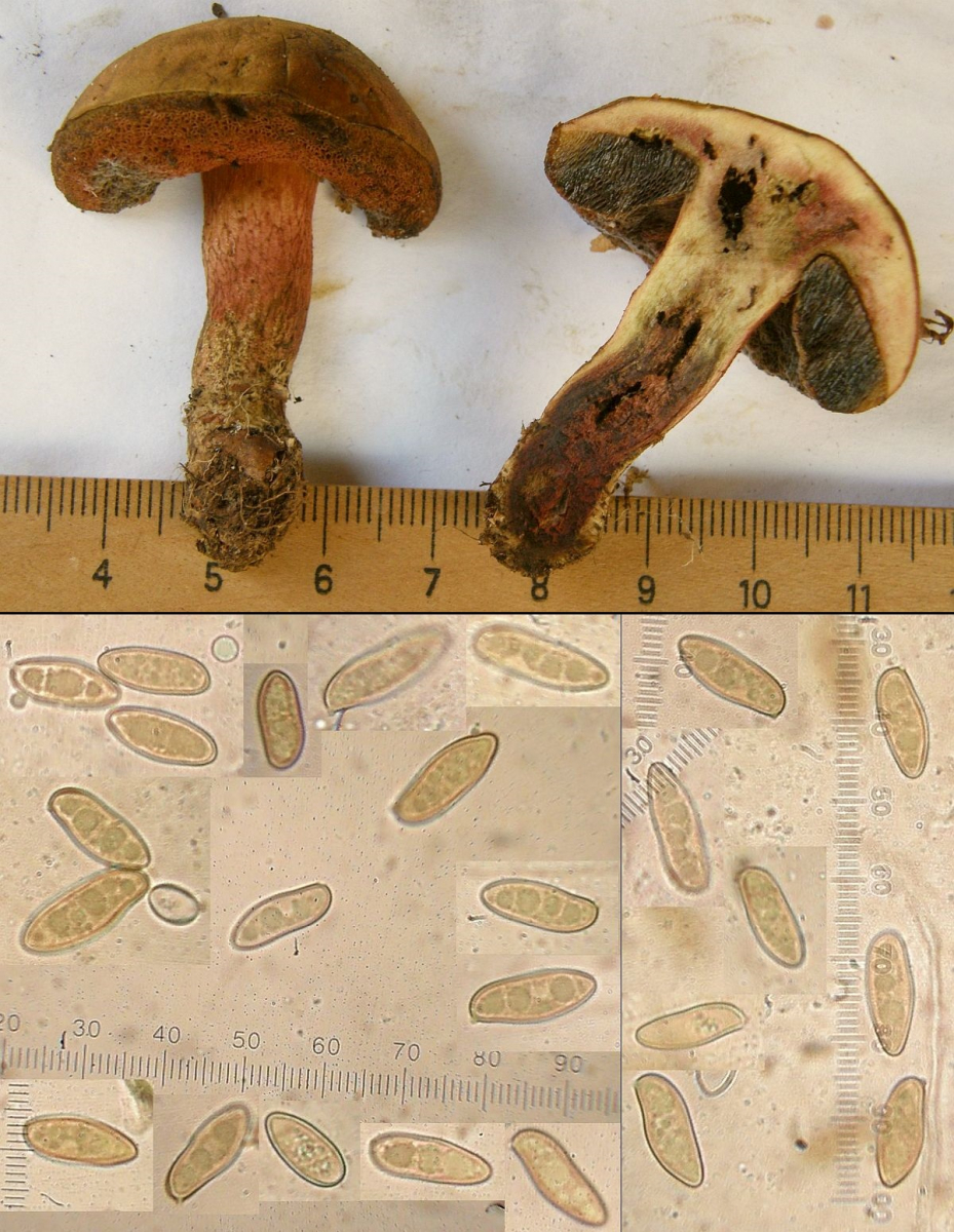 Bemerkenswert fand ich die dunkle Hutfarbe (auch des jüngsten, im Foto durchgeschnitten präsentierten Fruchtkörpers) und das sehr stark ausgeprägte Blauen des im frischen Anschnitt gelblichen Fleisches (an den genauen Farbton kann ich mich leider nicht erinnern und konnte ich aufgrund der schnellen Farbreaktion auch nicht fotographieren). Röhren orange-gelb, Stiel etwas rötlich beflockt (hoffe, das Foto gibt das her). Einen besonderen Geruch habe ich nicht wahrgenommen.
