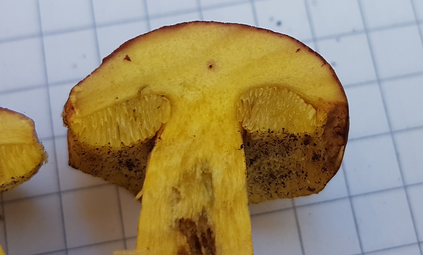 In der Form habe ich das bisher bei keinem der Gartenröhrlinge beobachten können - und ich habe da wirklich schon reichlich Fruchtkörper durchgeschnitten. Am "Gelbsten" im Fleisch wäre nach meinen erfahrungen noch der Blutrote (Hortiboletus rubellus), aber so kräftiges Gelb kenne ich im grunde nur vom Bereiften Rotfuß (Xerocomellus pruinatus), und selbst da nicht immer. Der kommt hier allerdings auf keinen Fall in Frage, denn die karottenroten Minipünktchen in der Stielbasis sind ja deutlich genug, das hat Christoph ja schon festgestellt. In den letzten beiden Jahren hatte ich allerdings auch hier und da schon den vagen Verdacht, daß man mehr als drei zusammenpassende ITS - Gruppen innerhalb der Gattung Hortiboletus finden könnte, wenn man noch umfassender sequenzieren würde (da gibt's zB noch einen Pilz, der makroskopiusch 1:1 wie H. bubalinus aussieht, aber kürzere Sporen mit kleinerem Quotienten hat). Von diesem Fund könnte eventuell eine Sequenz auch recht spannend sein, ob das nicht nochmal eine eigene Sippe sein könnte.