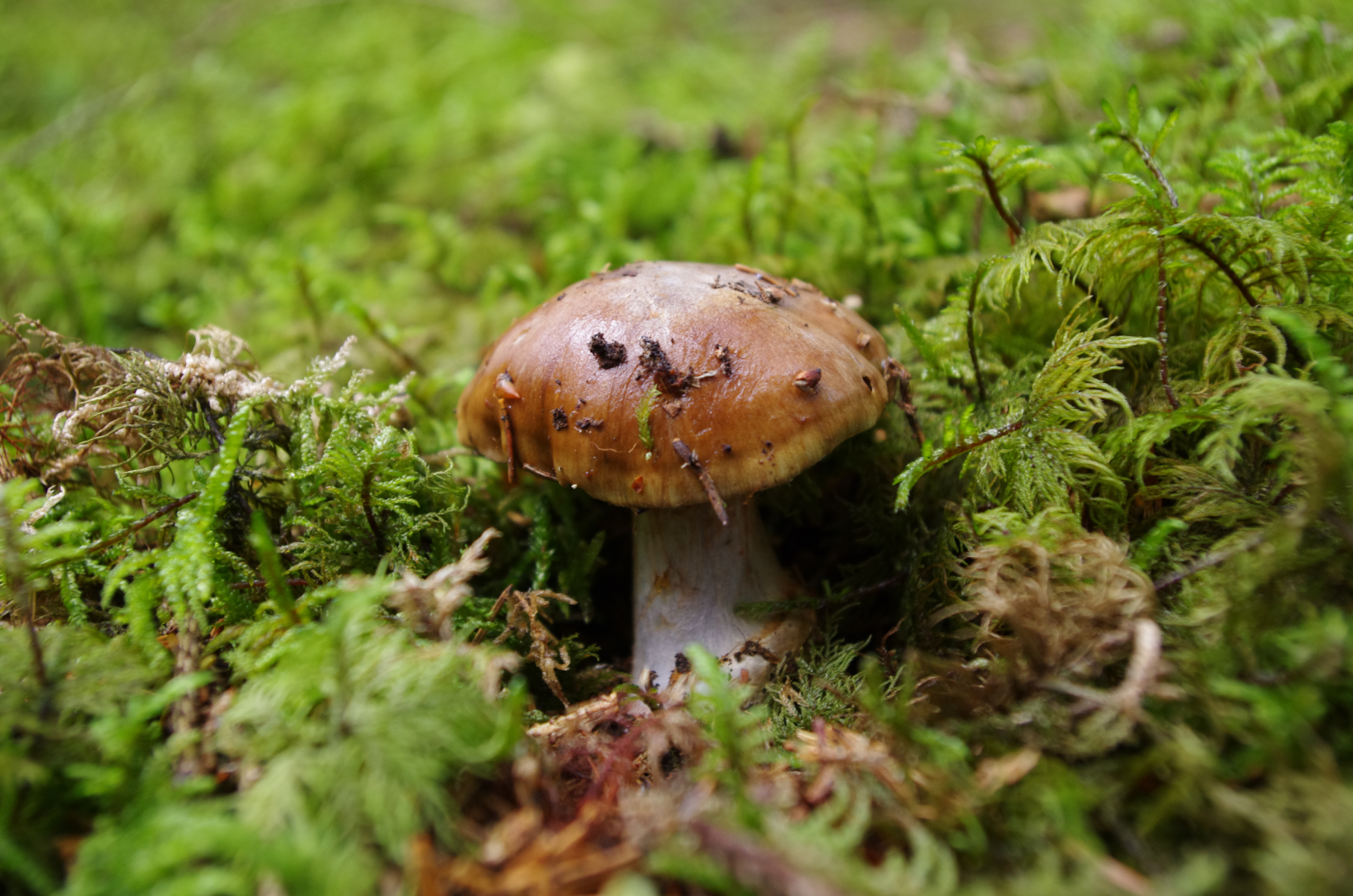 Das wäre mal ein höckersporiger Risspilz. Der Standort war ein extrem vermorschter, humoser und bemooster Fichtenstumpf, im in diesem Fall klar kenntlich in oberflächlich saurem "Fichtenmoorwald".