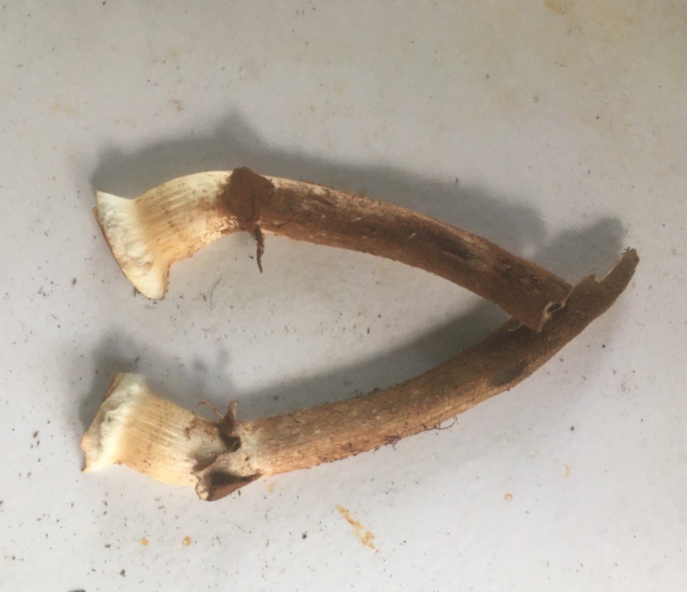 2.: Der "abbene" Stiel (nach dem Durchschneiden); er lieĂ sich leicht aus dem Hut "knacken". Man sieht ganz gut die oben beschriebenen "Riefen" .