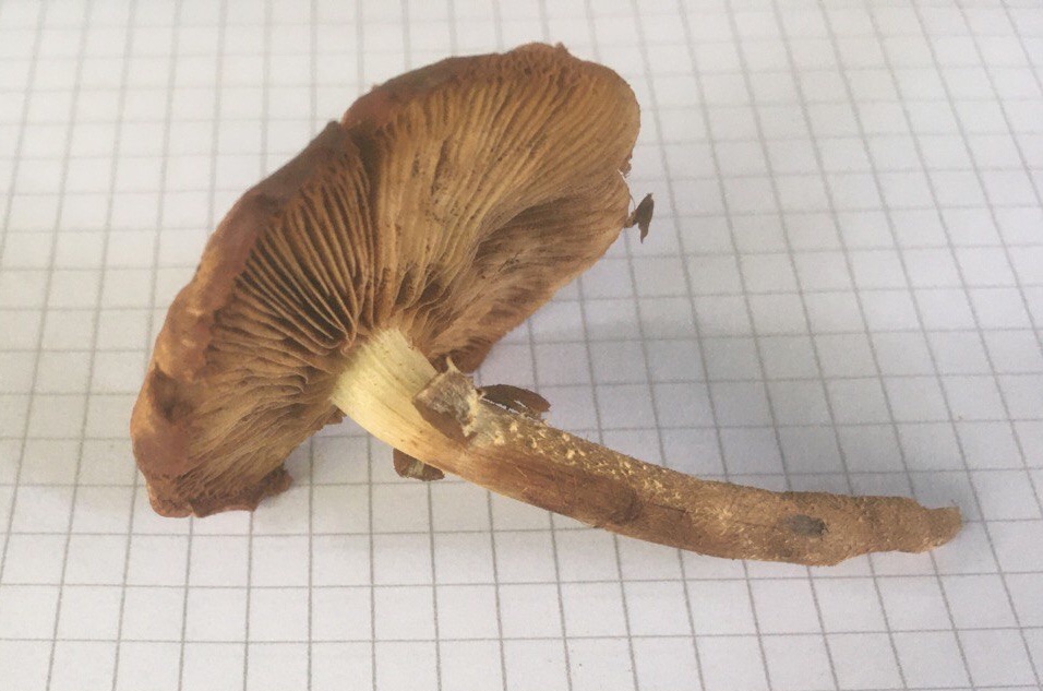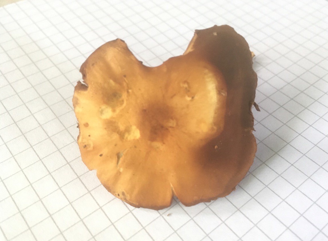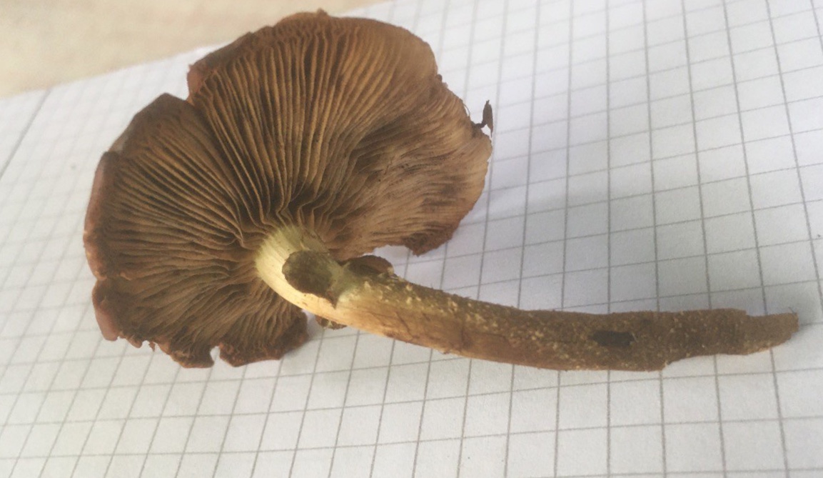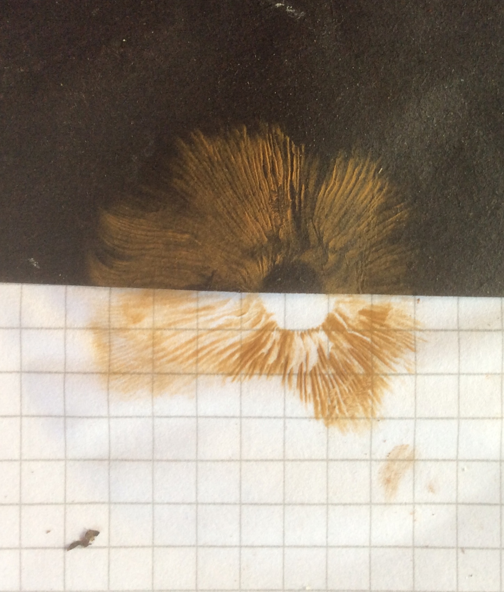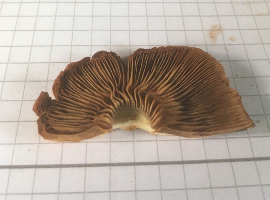 BESCHAFFENHEIT DER FRUCHTSCHICHT: Lamellen braun, mitteldicht bis dicht, Zwischenlamellen, angewachsen, laufen an der Stielspitze als eine Art Rillen angedeutet weiter