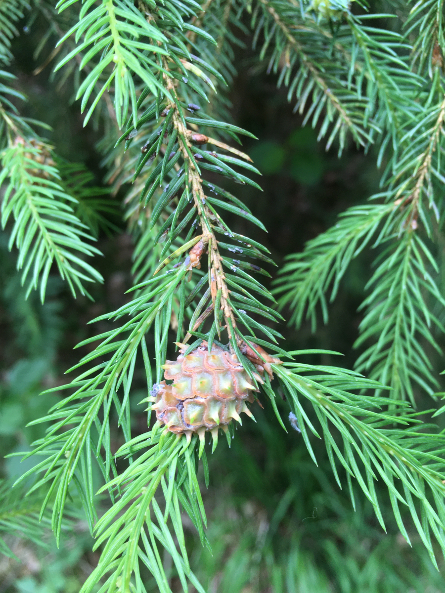 3 Als ich einem Fichtenästchen auswich fielen mir diese Gallen auf. Die Ursache ist allerdings kein Pilz sondern eine Gallenlaus die es sich hier gemütlich und durchaus stilvoll eingerichtet hat. Nachdem auch viele Lärchen herumstanden könnte es sogar eine Bonzen-Laus sein die ein Sommer- und ein Winterdomizil bewohnt (Sacchiphantes viridis). Chic chic!