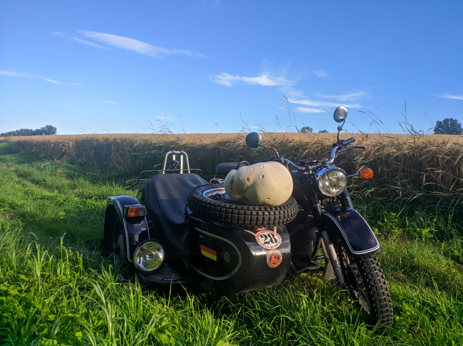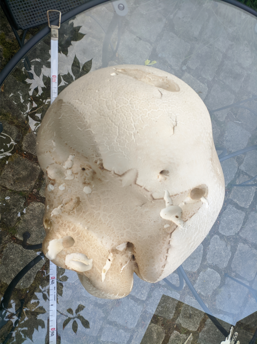 Als wir heute in der nördlichen Oberpfalz wandern waren, haben wir am Wegesrand einer großen Wiese unweit eines Waldes etwas Weißes entdekt. Zunächst hielt es meine Frau für ein Stück Styropor, aber als ich es mir dann näher ansah, konnte es das nicht sein. Die Oberfläche ist eher derb, derber als bei einem Champignon, fast schon ledrig. Nach kurzer Onlinerecherche, sind wir der Meinung, dass es sich um einen Riesen-Bovist handeln muss.