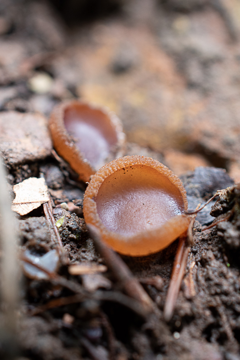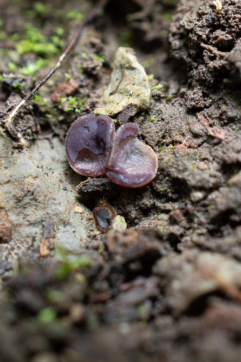 Die violetten Pezizen- wenn es welche sind- gibts wie immer mehrere die in Frage kommen. Evtl. Peziza gerardii oder vielleicht sogar Marcelleina personii. Das muss das Mikroskop zeigen.