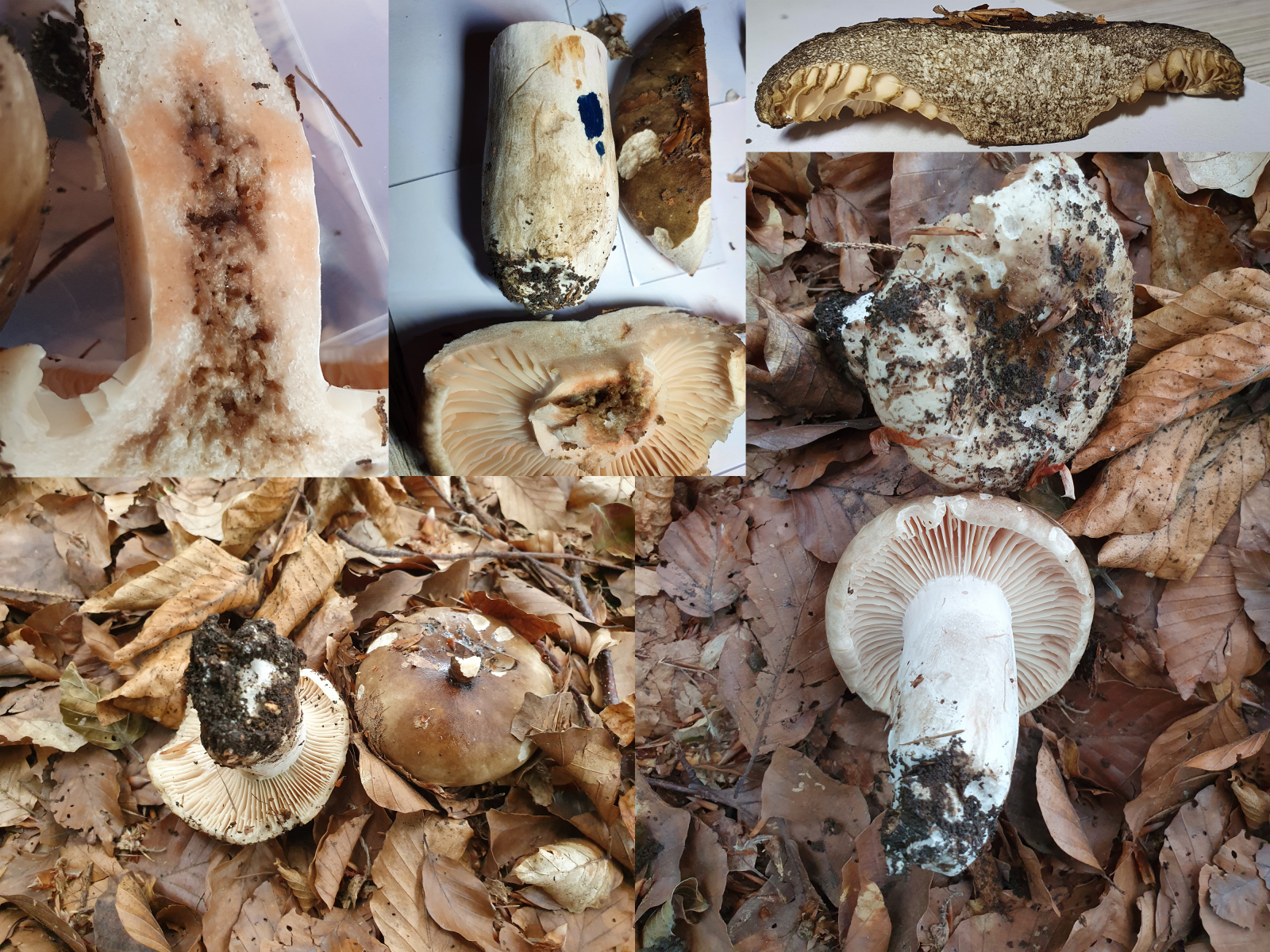 Der braune, noch eingerollte Hut, die kompakte Statur mit kräftigem Stiel, die entfernt stehenden, anastomosierenden Lamellen und vor allem das schnelle röten im Schnitt mit späterem Umschlagen ins Schwarze machte die Art deutlich. Umherstehend Buchen, Lärchen und eine Linde.