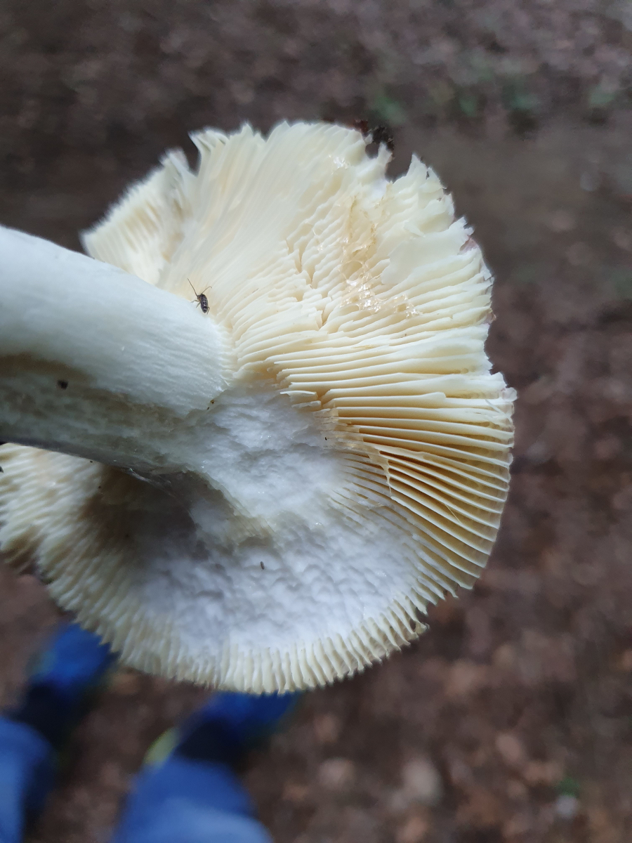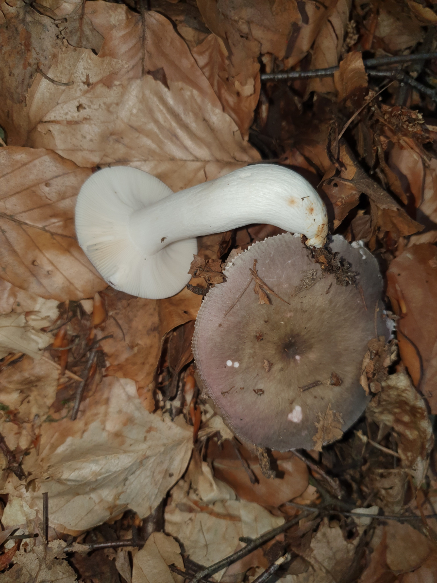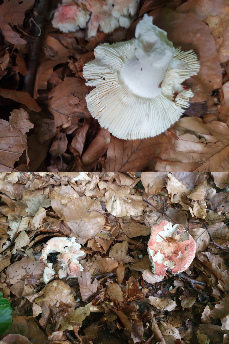 Der nächste Fund bei Buchen sollte mir am Ende die meiste Arbeit machen. Im Wald war er mir nicht klar einzuordnen. Leider auch schon etwas weich werdend. Im Zusammenhang mit seinen schönen hellroten Farben (mit etwas blasserer Mitte) und den weißen Lamellen dachte ich an Emeticinae. Doch Pustekuchen. Der Geschmack fiel mild aus. Die Lamellen waren zudem an der trichterförmig aufgeblähten Stielspitze ausgebuchtet angewachsen (siehe Bild). Der Stiel war weiß und weich. Ich blieb ratlos.